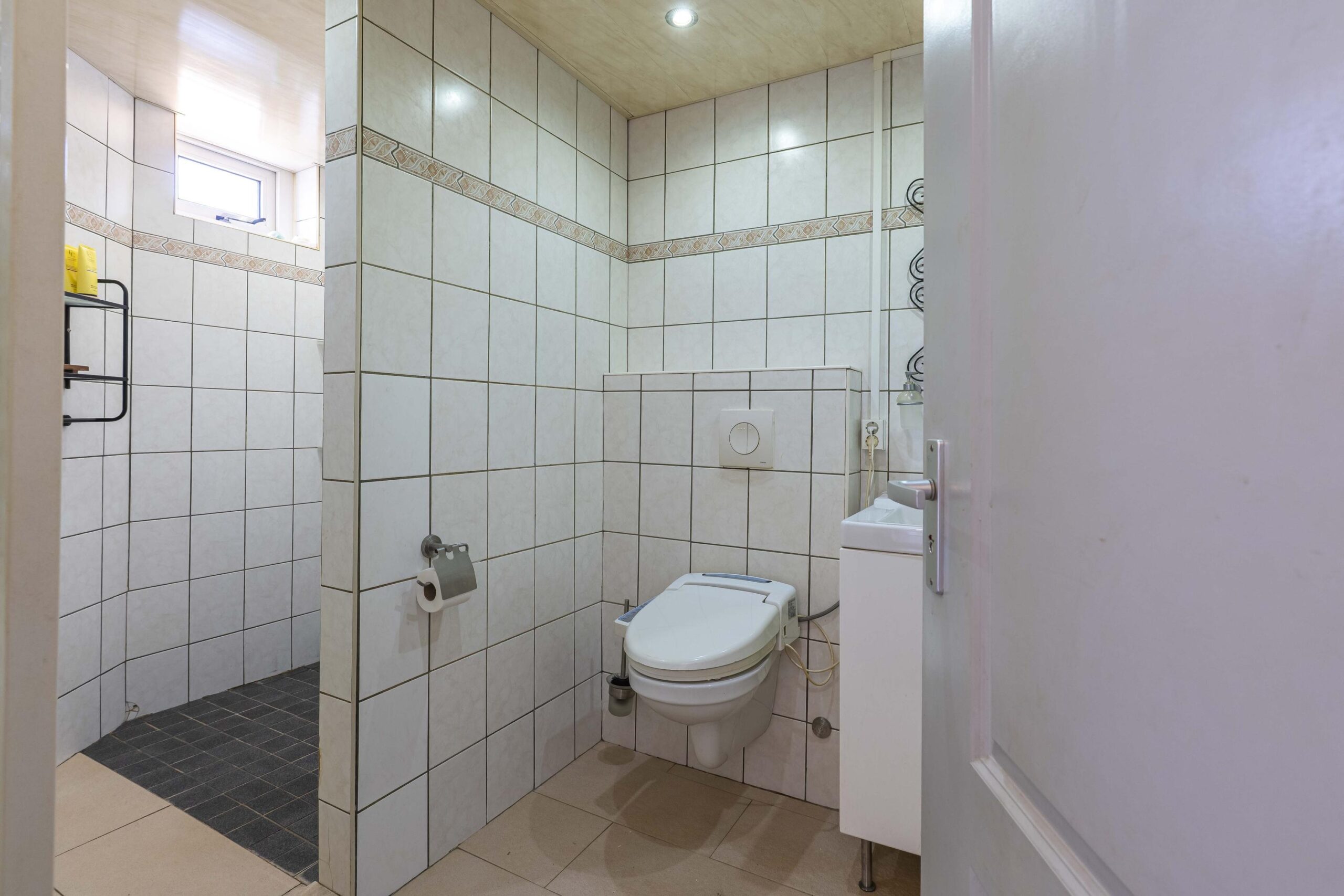 Ruime badkamer ca. 6 m² met douche, toilet en wastafel.