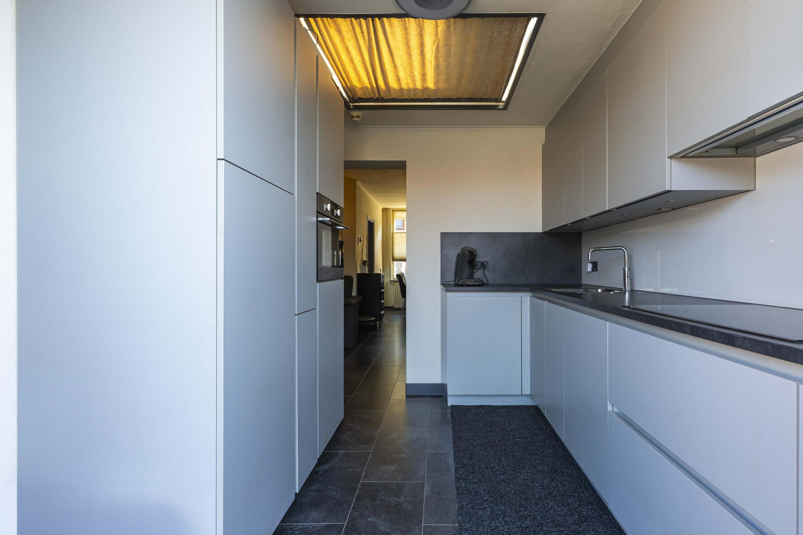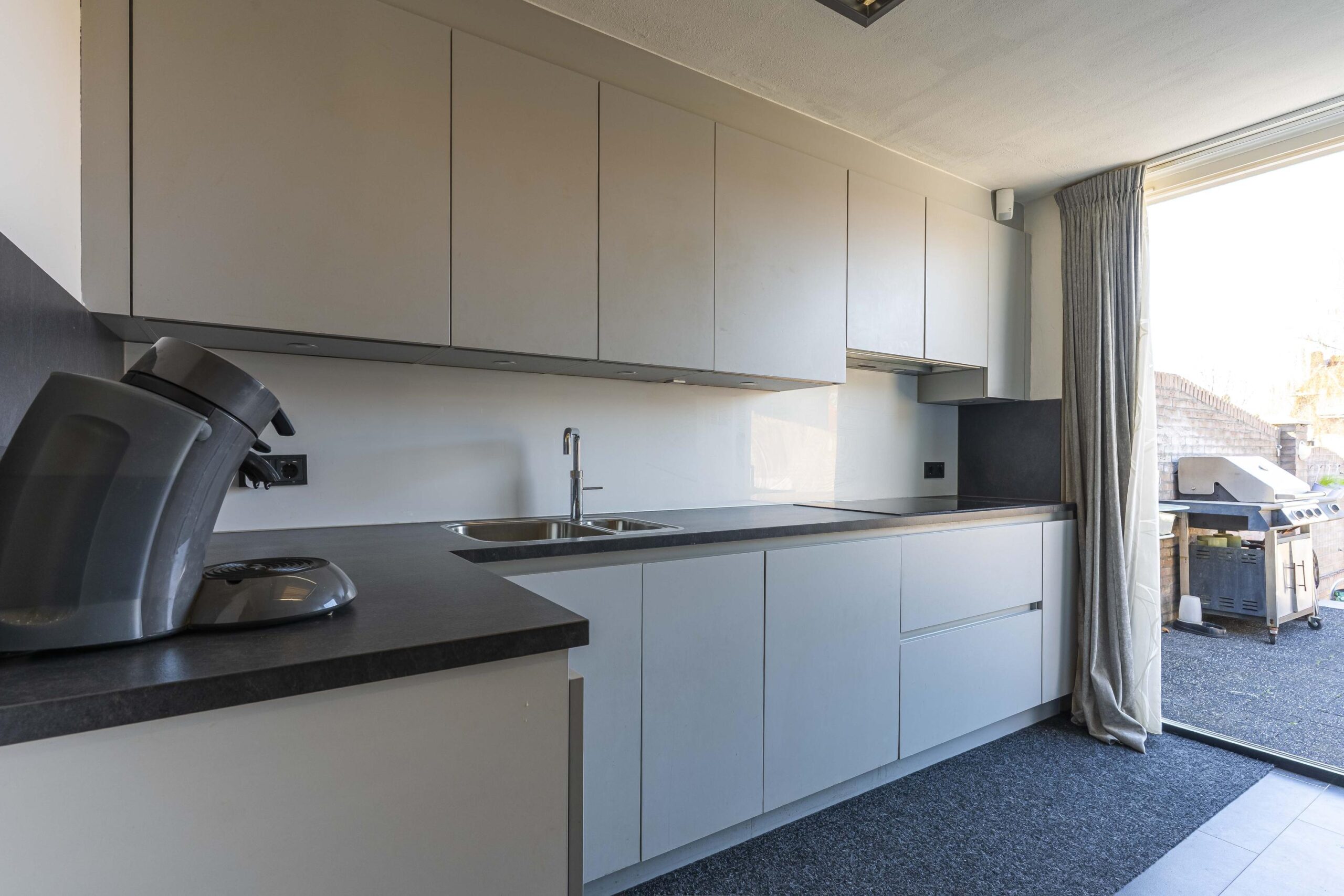 Keuken voorzien van luxe keukeninstallatie (2020) met apparatuur: inductiekookplaat, afzuigkap, vaatwasser, koelkast, diepvries en combi-oven. Vanuit de keuken is de geheel omsloten, zonnige achtertuin (op westen gelegen) bereikbaar.