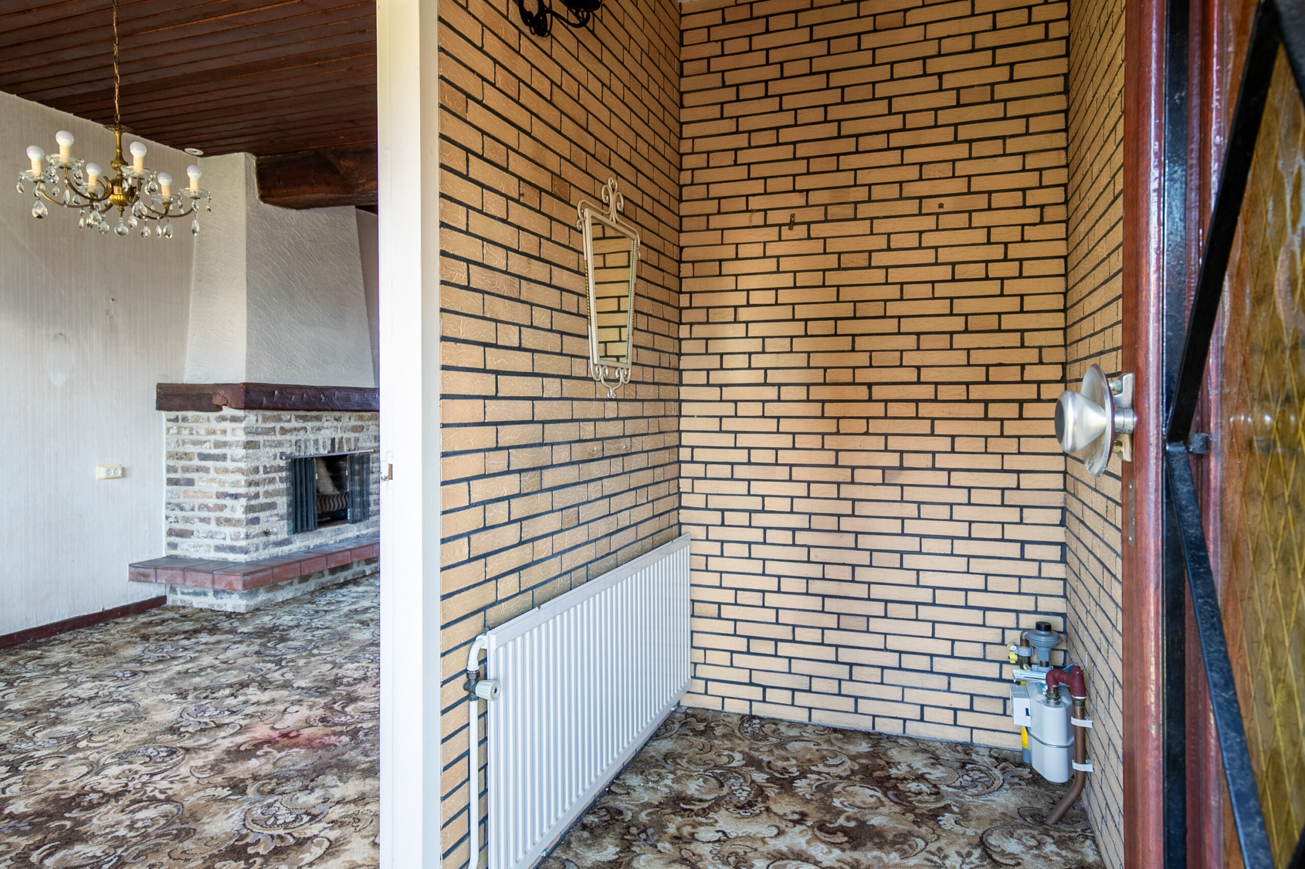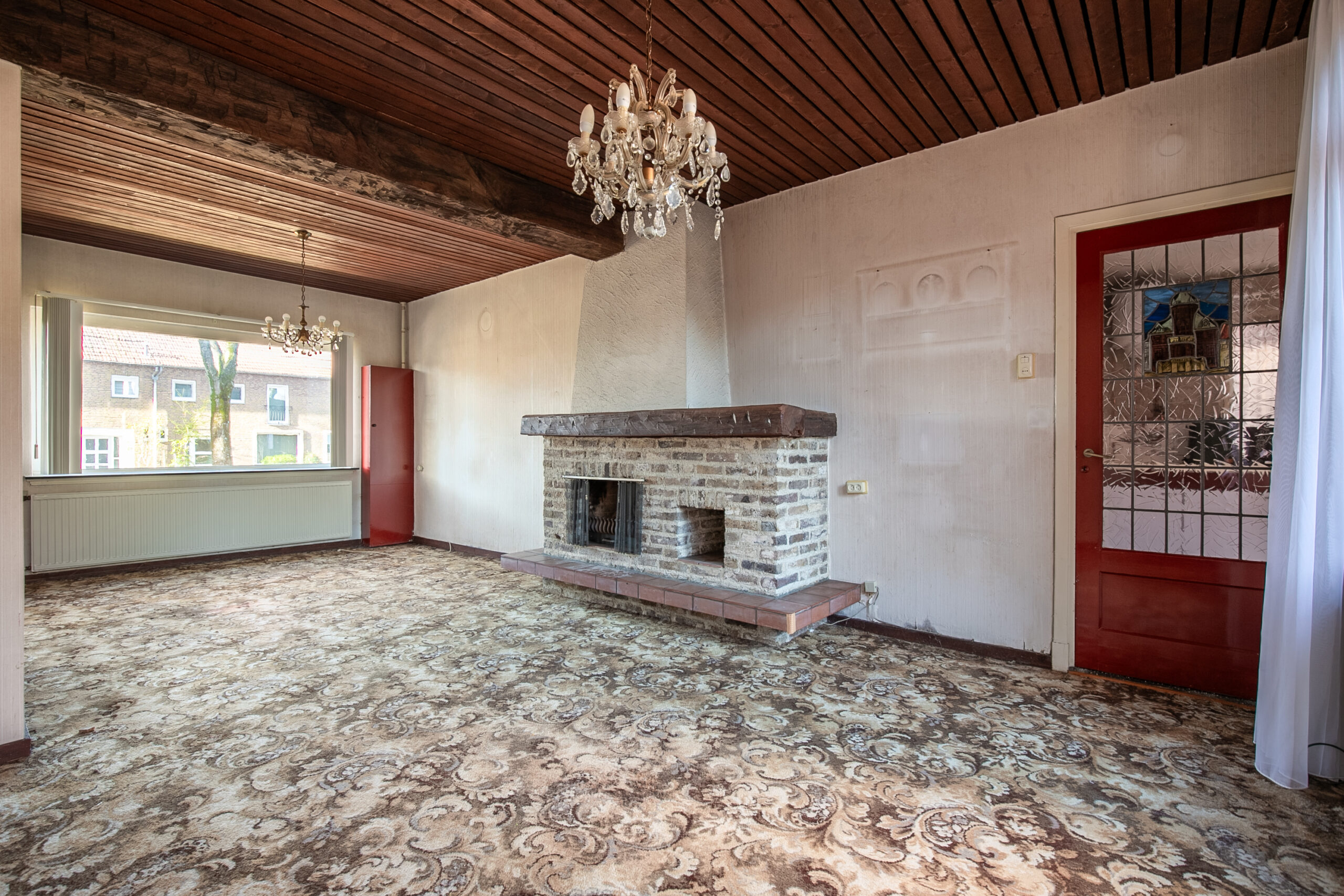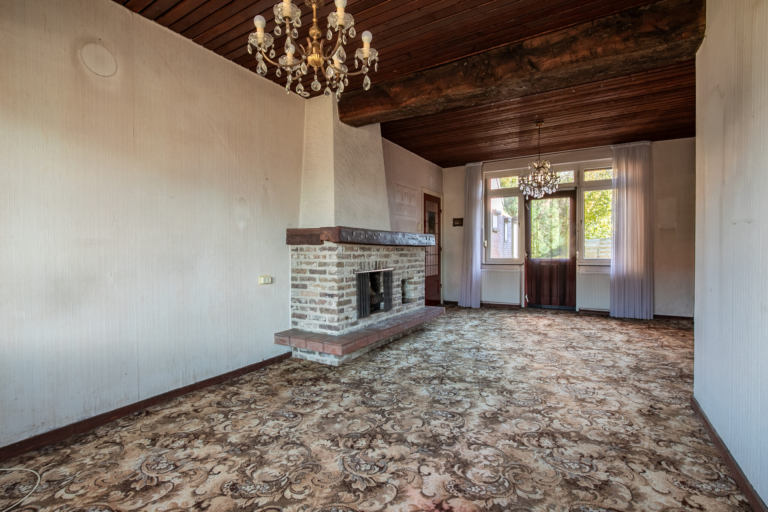 Via de overdekte entree komt u in de hal, die toegang biedt tot de woonkamer. De woonkamer (ca. 25 m²) is voorzien van een sfeervolle open haard, een glas-in-loodraam in de deur en een karakteristieke draagbalk in het plafond. De grote ramen zorgen voor veel natuurlijk licht en geven de ruimte een open, ruimtelijk gevoel.