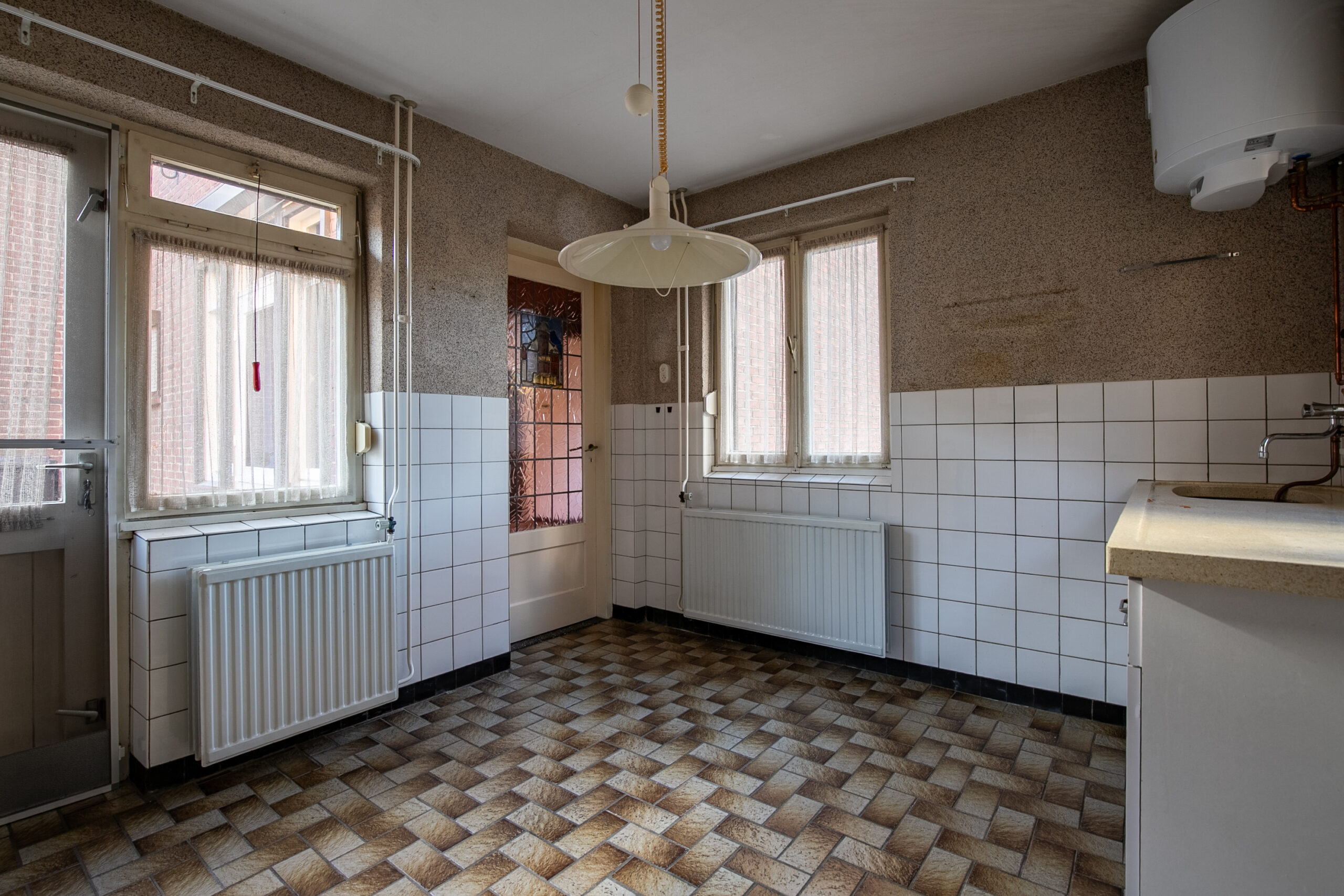 De keuken is ca.13 m² groot en geeft eveneens toegang tot de tuin. Vanuit de keuken loopt u naar het achterste gedeelte van de woning. Hier bevindt zich de badkamer, het apart toilet en de eerste bergingsruimte (11 m²). Via deze bergingsruimte kan eveneens de tuin bereikt worden.