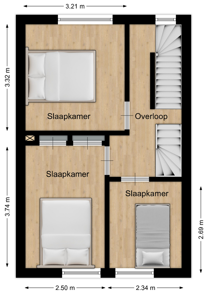 De ruime overloop biedt toegang tot drie slaapkamers. De eerste twee slaapkamers zijn beiden ca. 10 m² groot. De laatste slaapkamer is ca. 6 m².