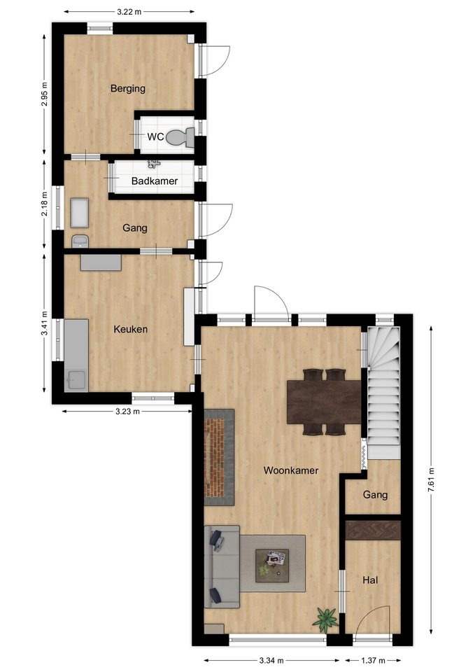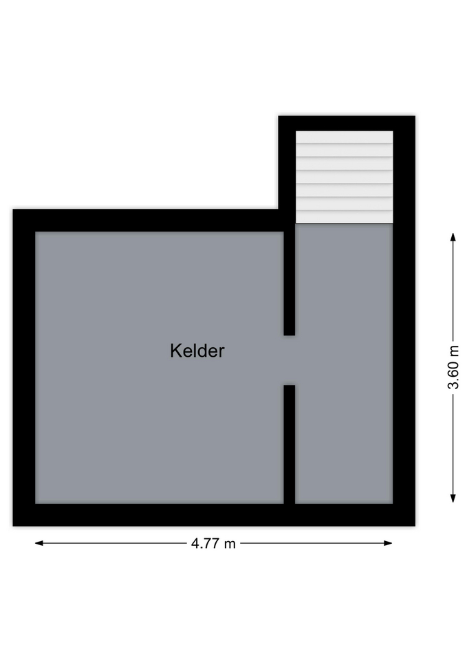 De tweede bergingsruimte is te bereiken via een luik (in plafond van de gang) en is naar schatting 18 m². Teruggekomen in de woonkamer bevindt zich de trap naar de kelder en trap naar de eerste verdieping.