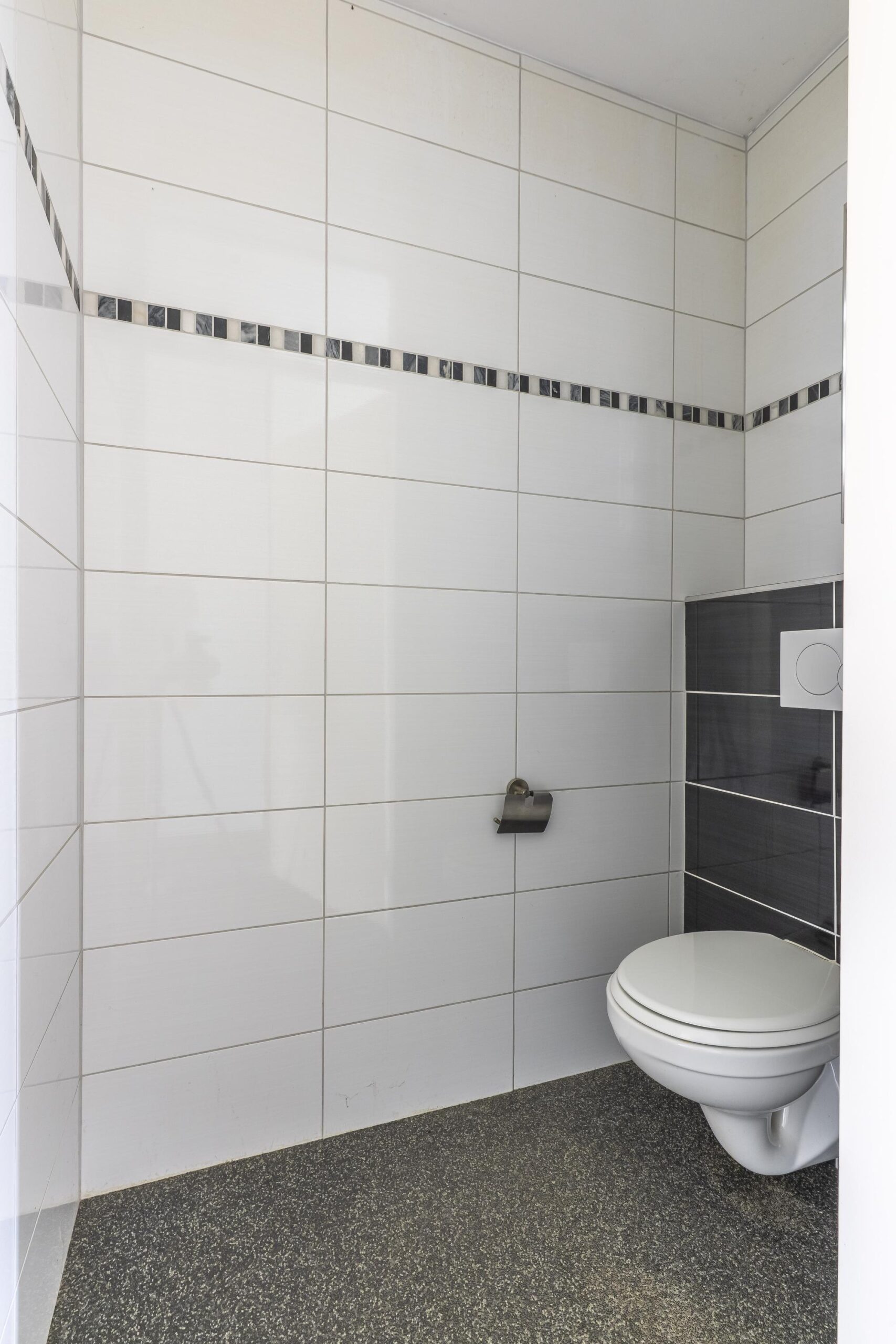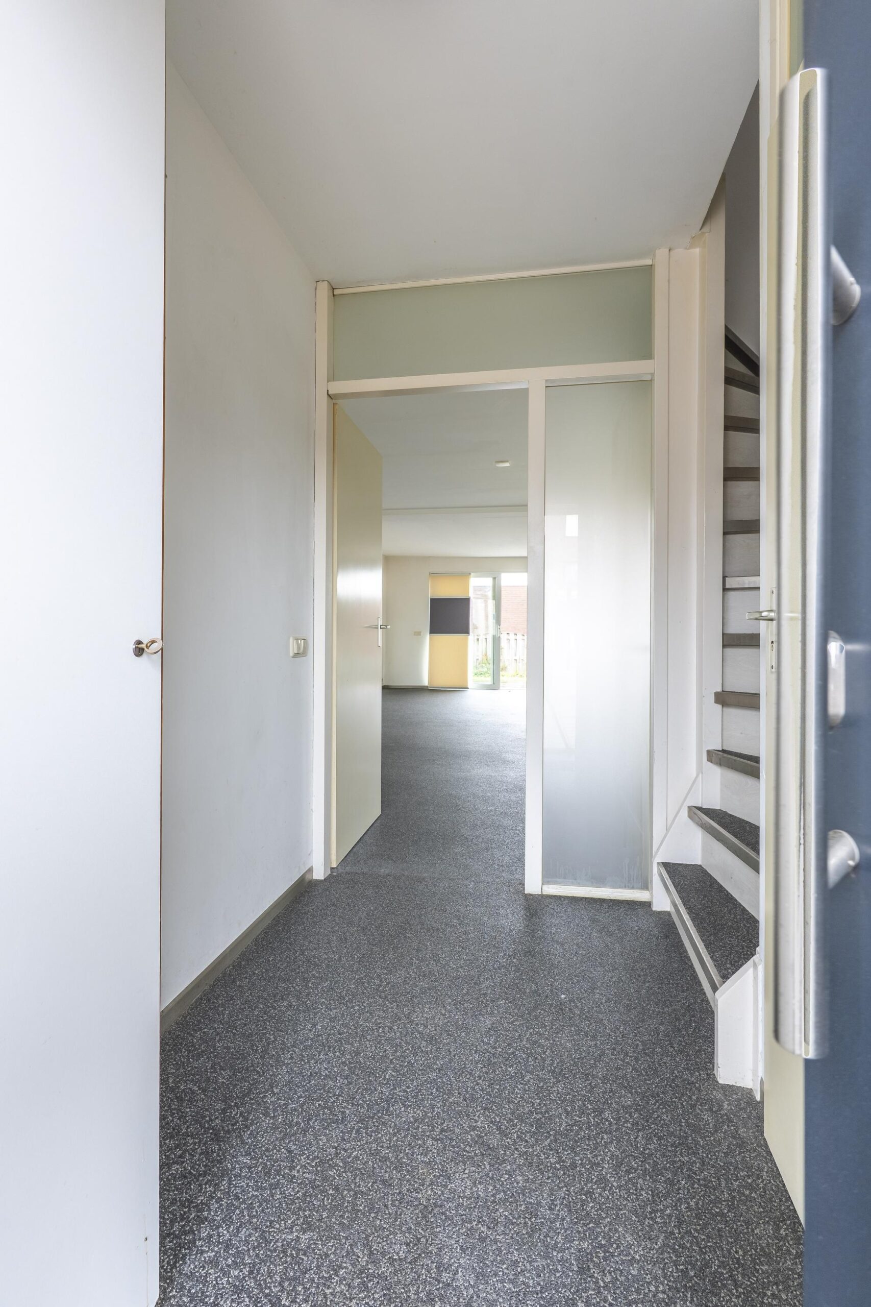 Voortuin met oprit voor het plaatsen van één of twee auto’s en zijingang naar de achtertuin. Overdekte entree. Hal met meterkast, geheel betegelde toiletruimte met zwevend toilet en trapopgang naar de eerste verdieping.