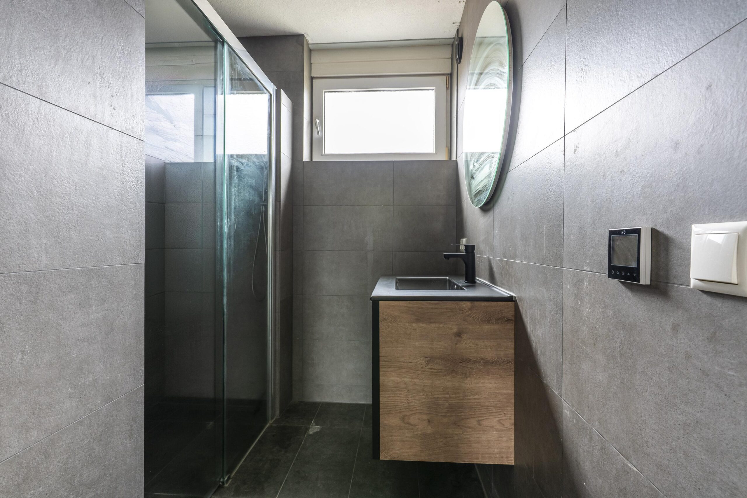 Overloop met toegang naar drie slaapkamers, allen voorzien van een laminaatvloer. De badkamer is modern ingericht met een grote inloopdouche met glazen schuifdeur, wastafel met meubel en spiegel en vloerverwarming.