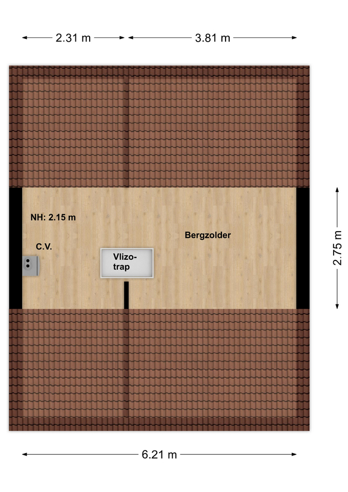 Via vlizotrap bereikbare bergzolder alwaar opstelling cv-ketel (merk Remeha, bouwjaar 2023, huur).