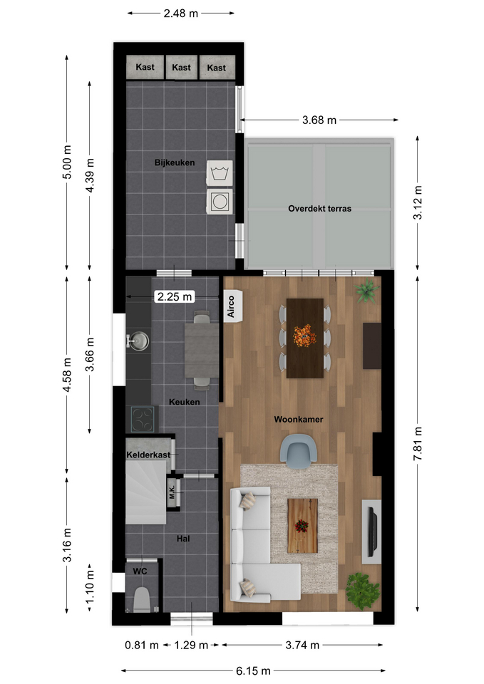 Overdekte entree, hal met meterkast (vernieuwde groepenkast met 12 groepen en 3 aardlekschakelaars) en modern toilet met wandcloset. Doorzonwoonkamer (ca. 29.3m²) met airco, tuindeuren, laminaatvloer en schoorsteenmantel ten behoeve van een kachel. Keuken (ca. 10.4m²) met aanrechtcombinatie voorzien van de volgende apparatuur: inductiekookplaat, oven, vaatwasser, spoelbak en afzuigkap. De keuken geef tevens toegang tot een kelderkast. In de aanbouw gerealiseerde bijkeuken alwaar witgoedaansluitingen en drie muurkasten. Overdekt terras (ca. 11.7m²) te bereiken via de woonkamer en de bijkeuken. Eenvoudige garage (ca. 15.6m²). Geheel omsloten, op het oosten georiënteerde tuin.