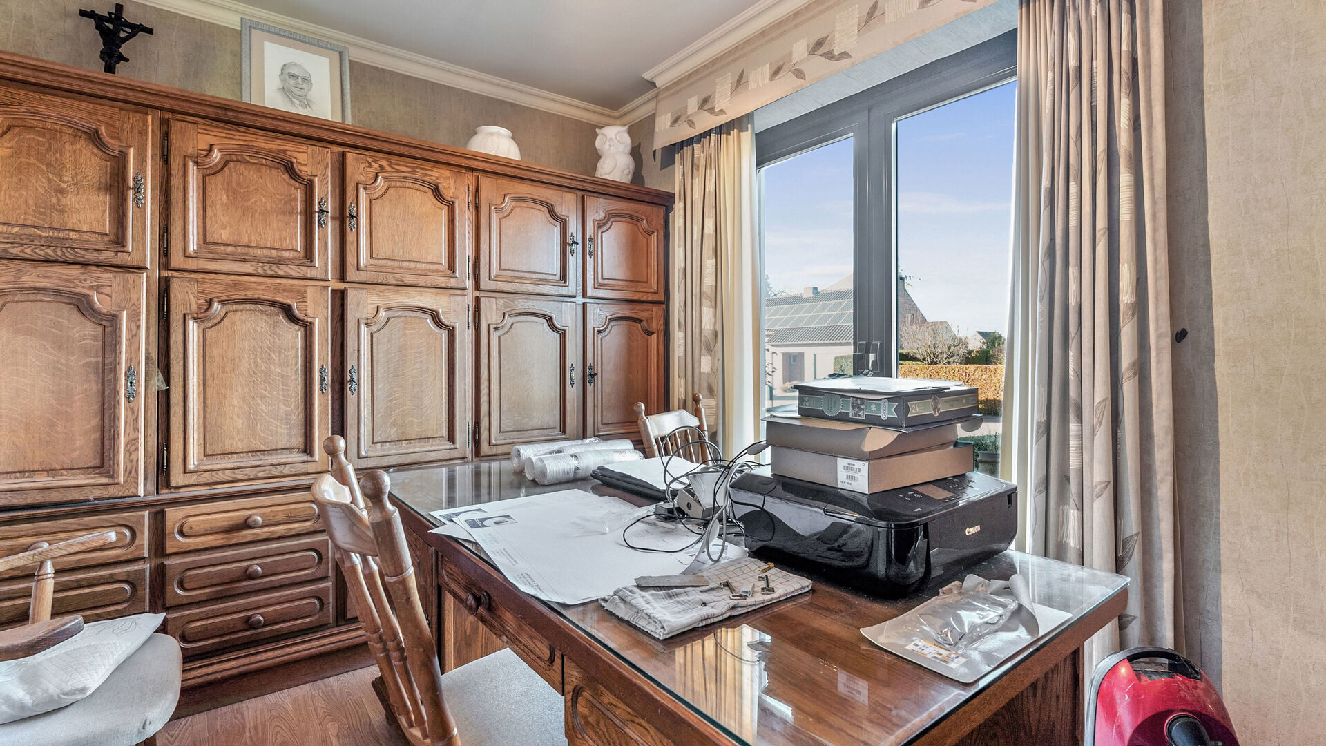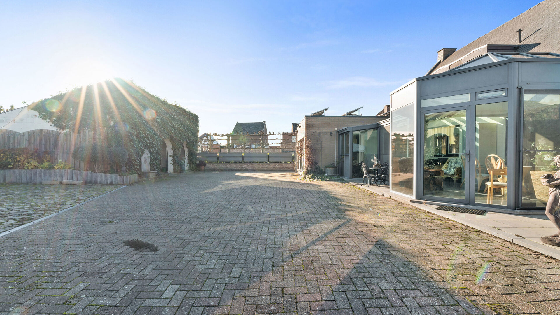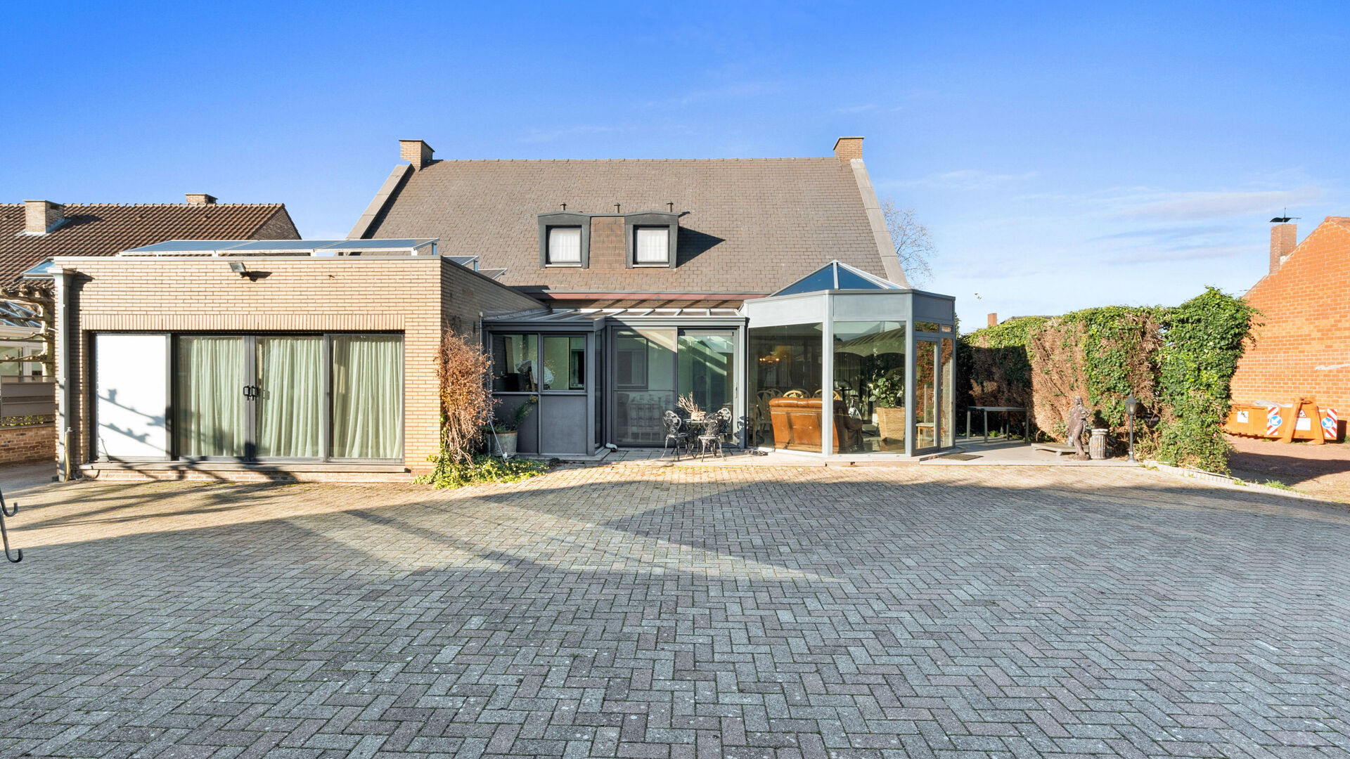 Achter de keuken bevindt zich nog een sas met achterdeur. Hieraan grenst een extra kamer die perfect kan dienen als hobbyruimte of bijkomende badkamer. Deze ruimte is voorzien van airco en een grote schuifraam naar buiten. De veranda zelf is volledig omringd door glas, met tegelvloer, zonwerend dak glas, vliegenramen, verwarming en spotjes—een heerlijke plek om het hele jaar door te genieten.