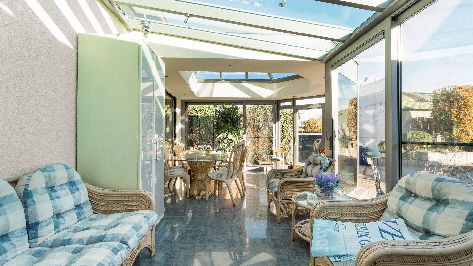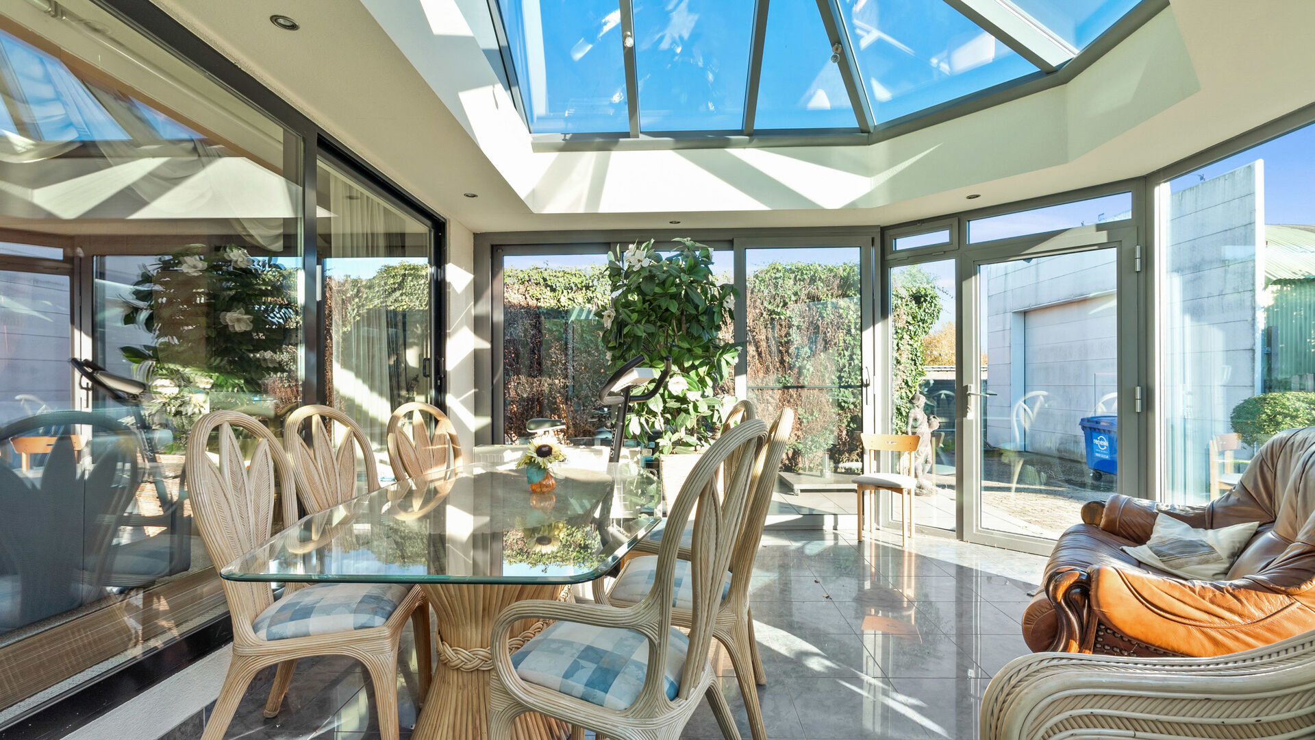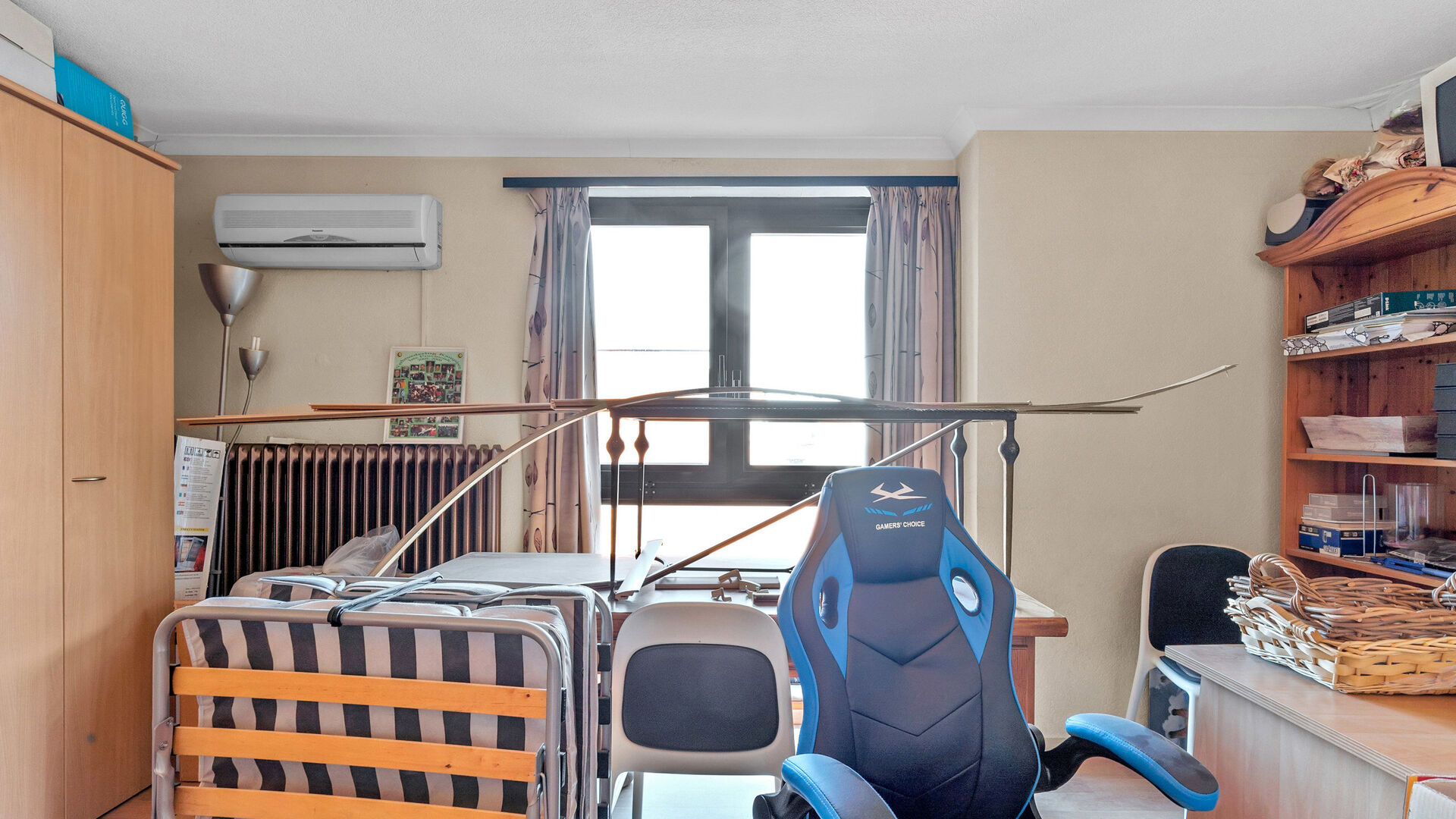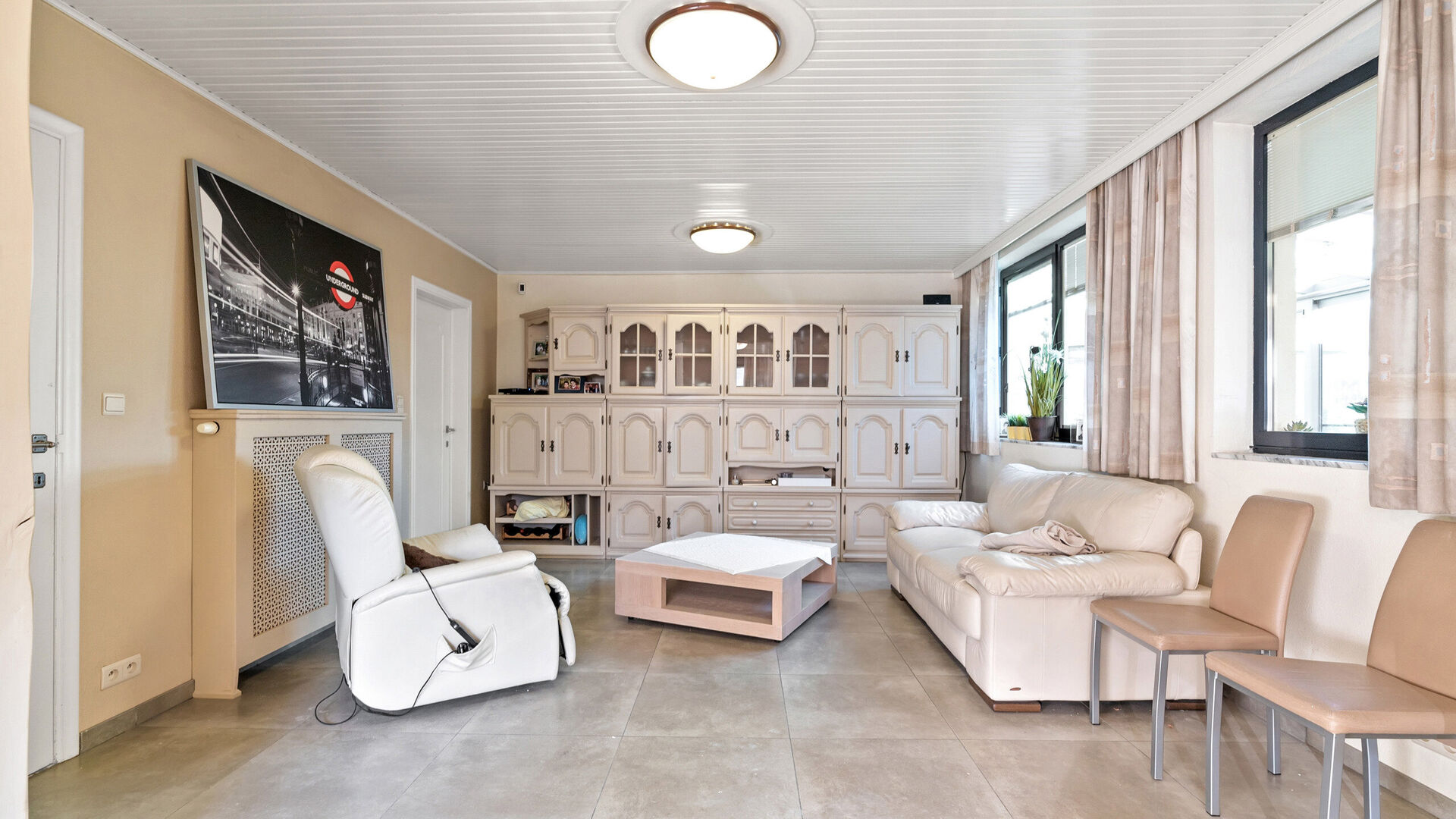 Achter de keuken bevindt zich nog een sas met achterdeur. Hieraan grenst een extra kamer die perfect kan dienen als hobbyruimte of bijkomende badkamer. Deze ruimte is voorzien van airco en een grote schuifraam naar buiten. De veranda zelf is volledig omringd door glas, met tegelvloer, zonwerend dak glas, vliegenramen, verwarming en spotjes—een heerlijke plek om het hele jaar door te genieten.
