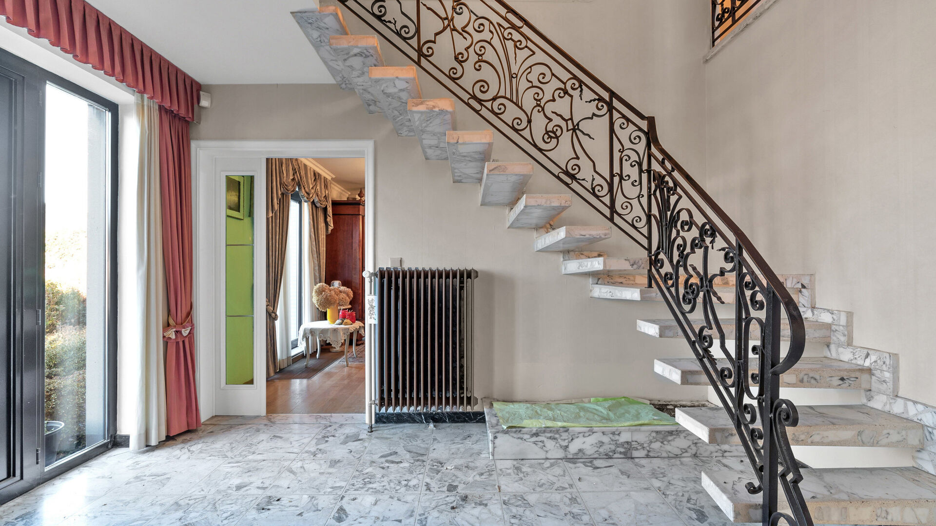 Je wordt verwelkomd in een royale inkomhal met een prachtige marmeren trap en handgemaakte smeedijzeren leuning. De marmerenvloer en het open zicht naar boven creëren meteen een stijlvol en luchtig gevoel. Rechts bevindt zich een lichte bureauruimte met groot raam tot op de vloer—ideaal als thuiskantoor.