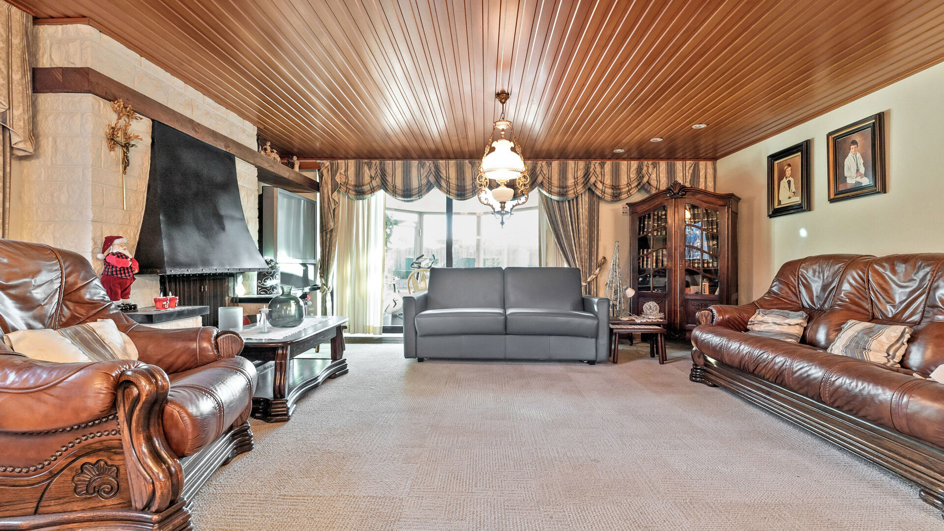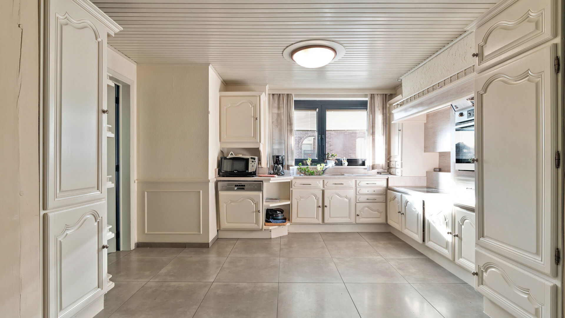 De ruime keuken is volledig uitgerust met alle hedendaags comfort en veel kastruimte. Grote ramen kijken uit op de veranda. Vanuit de keuken én de inkomhal bereik je de gezellige leefruimte met eetplaats en salon. Dankzij de grote ramen geniet je hier de hele dag van natuurlijke lichtinval. De eetruimte heeft parket, het salon een zacht tapijt, en de echte hou gestookte haard zorgt voor extra sfeer. Een grote schuifraam leidt naar de veranda.