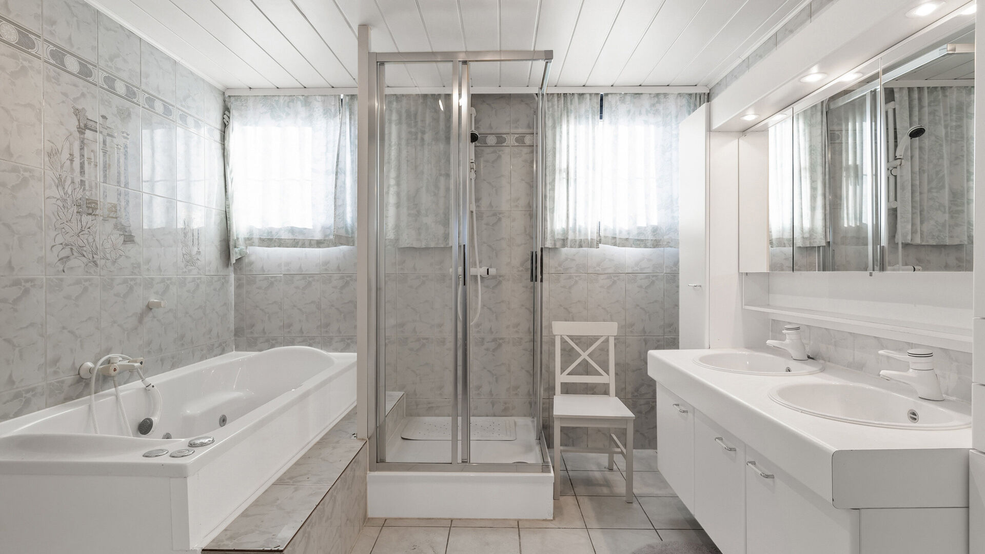 De badkamer is volledig betegeld, ze beschikt over een bubbelbad, een aparte douchecabine, dubbele lavabo, verwarming en een draai/kiepraam met vliegenraam.