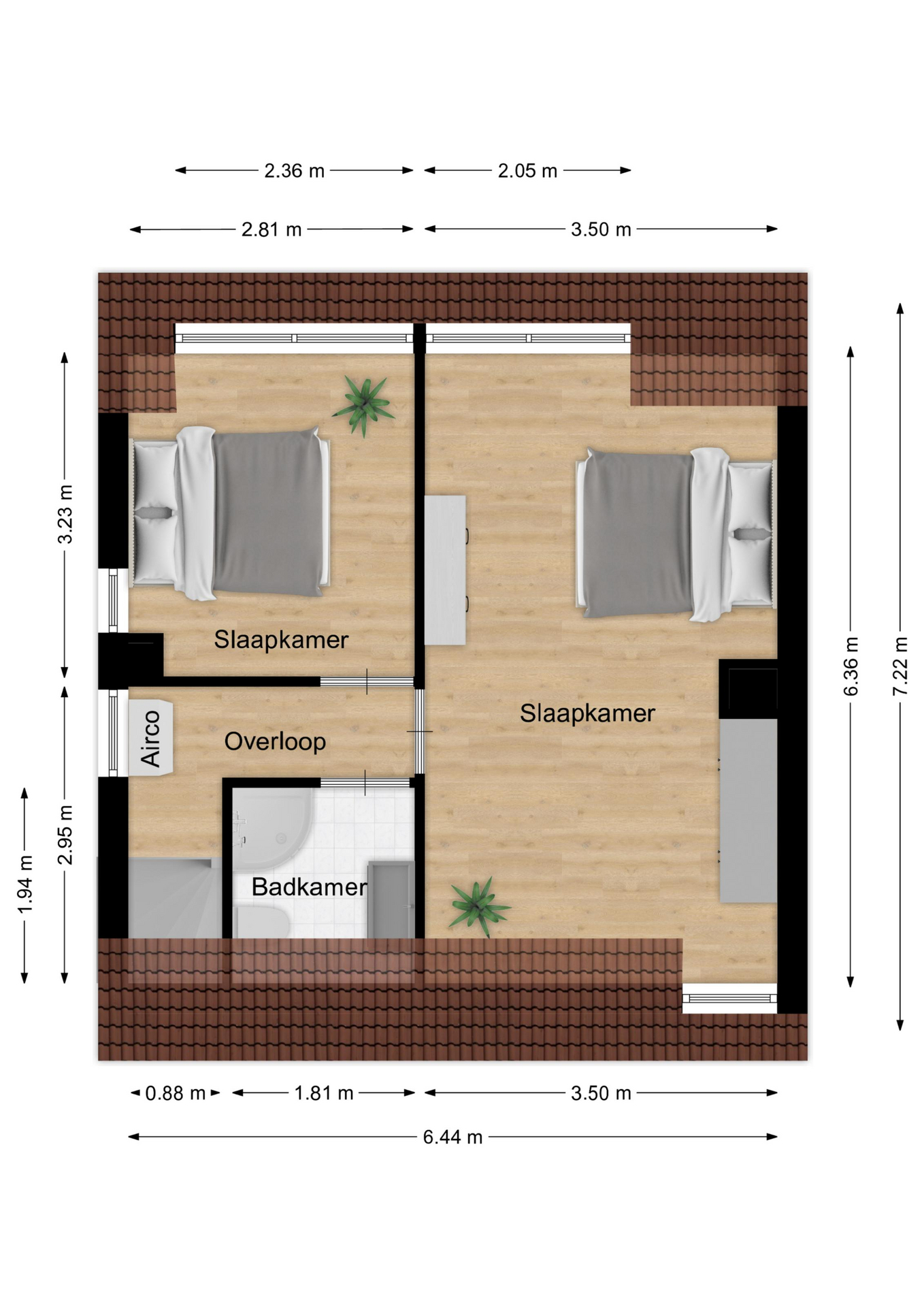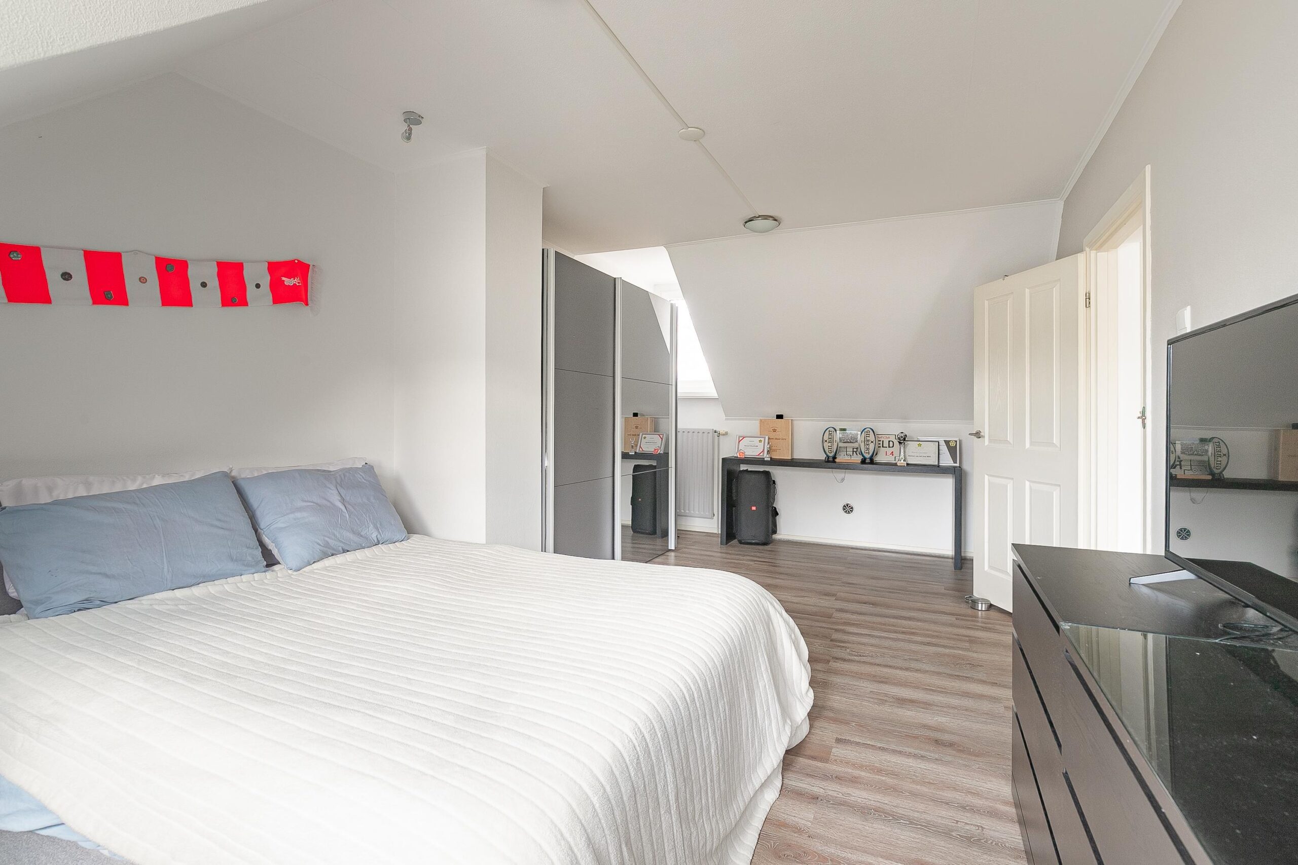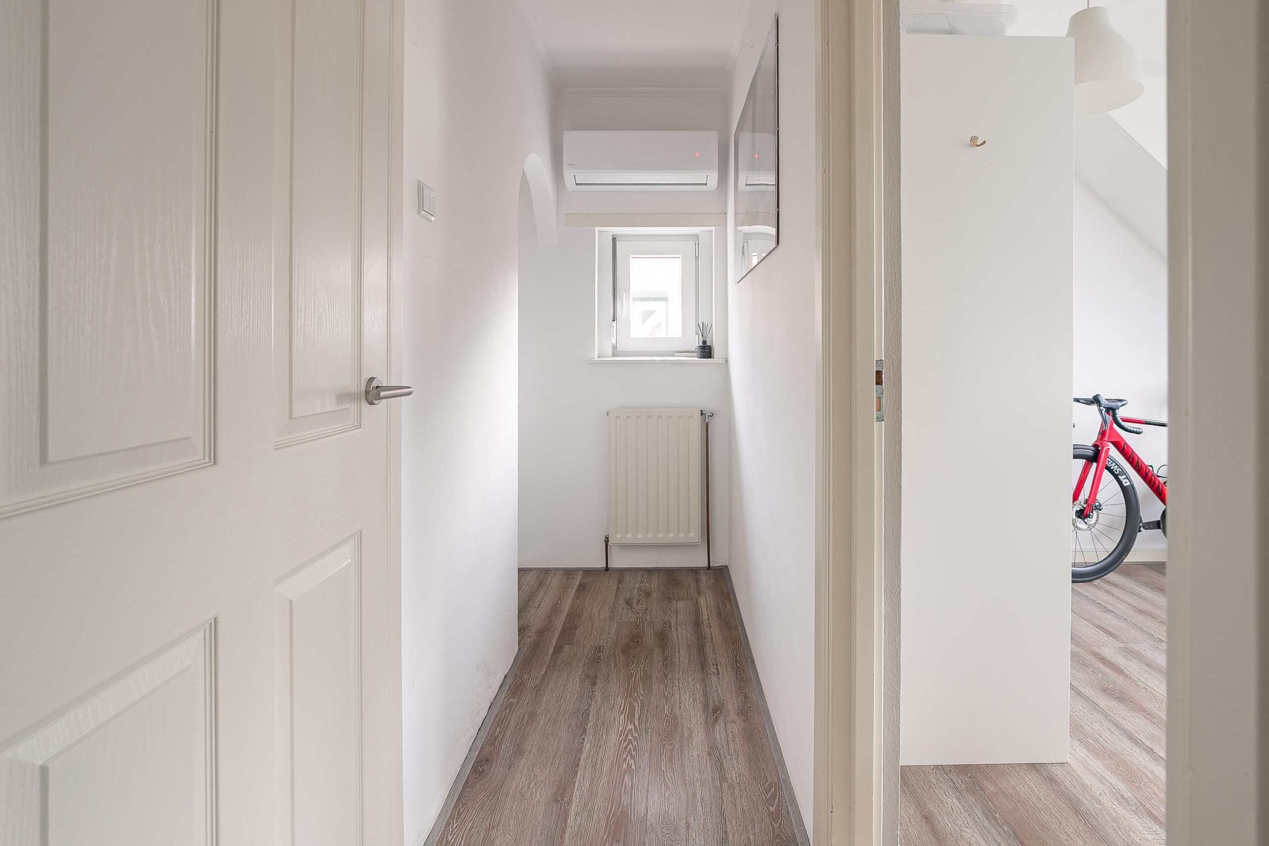 Overloop met airco. Twee (voorheen drie) slaapkamers (resp. ca. 22m² en ca. 9m²), voorzien van laminaatvloeren. Op beide slaapkamers is in 2020 een ruime dakkapel geplaatst, de dakkapel op de kleine slaapkamer is over nagenoeg de hele breedte van de slaapkamer. Moderne badkamer (ca. 3.5m²) met dakraam, douche, wandcloset en badmeubel met wastafel.