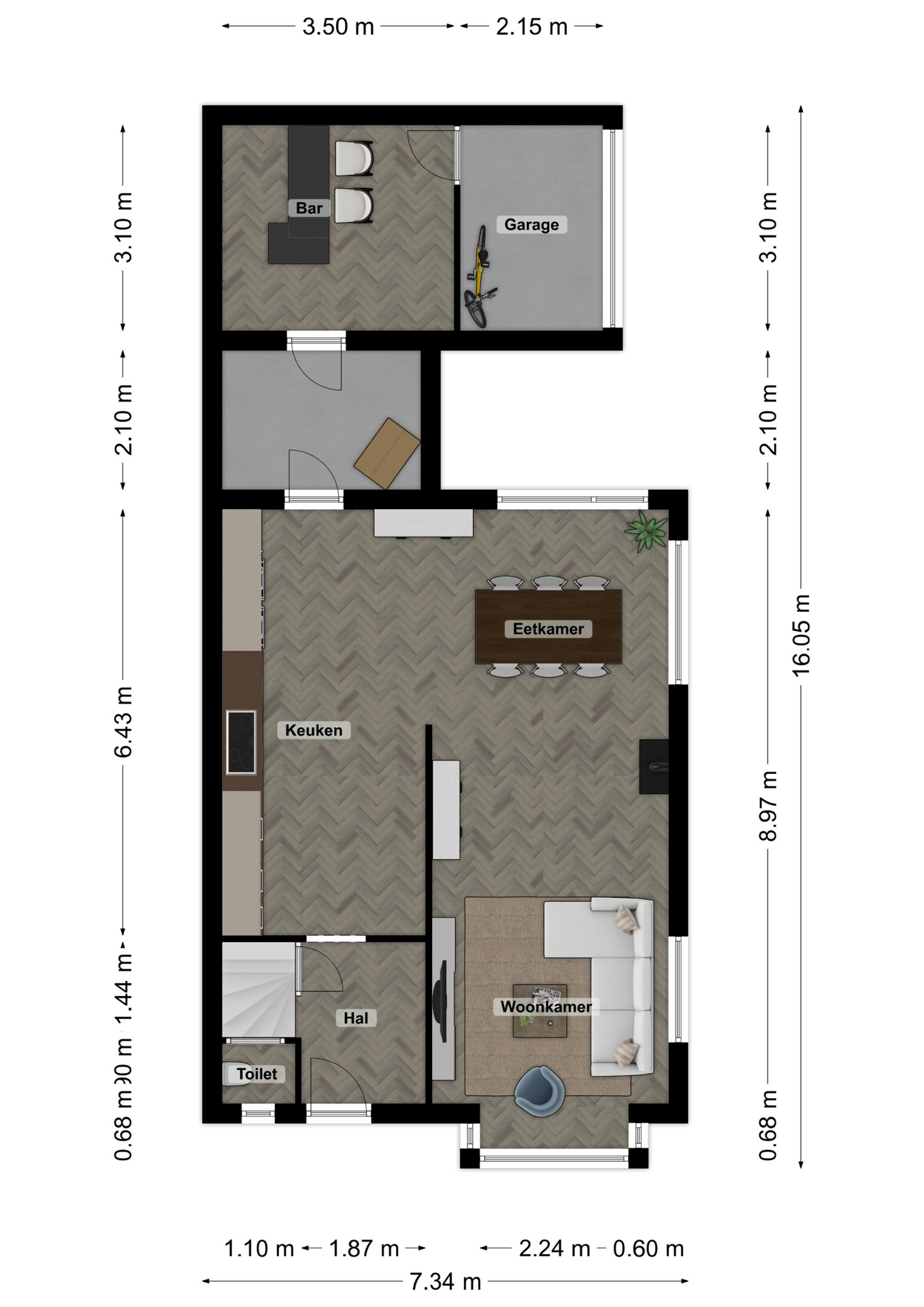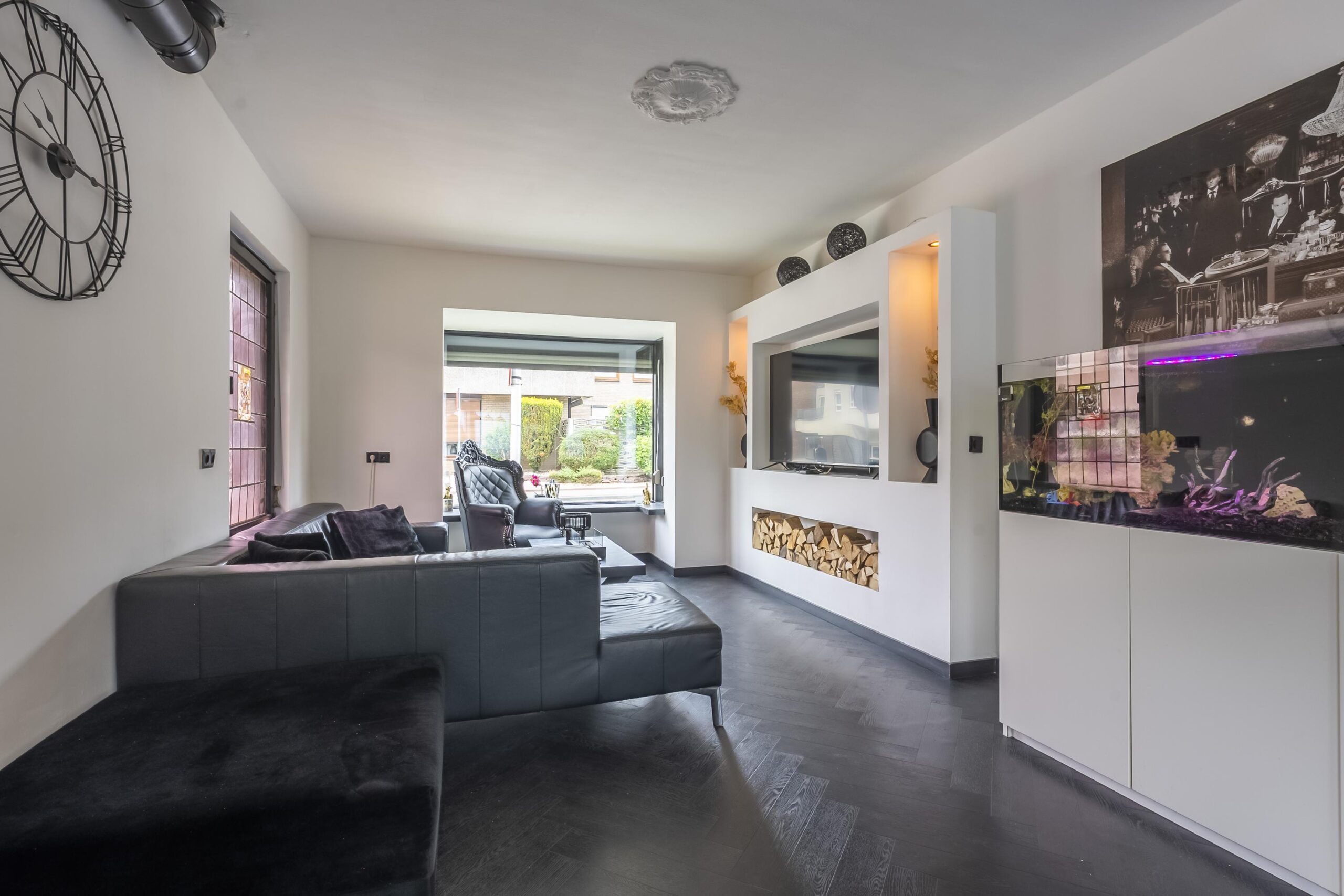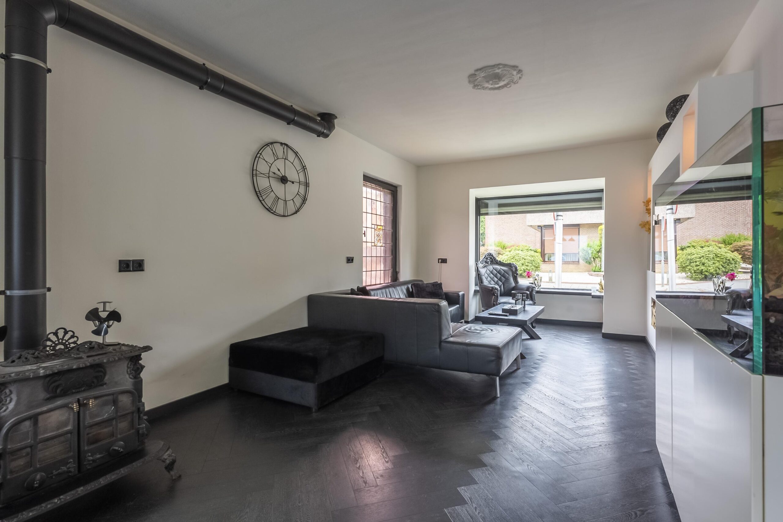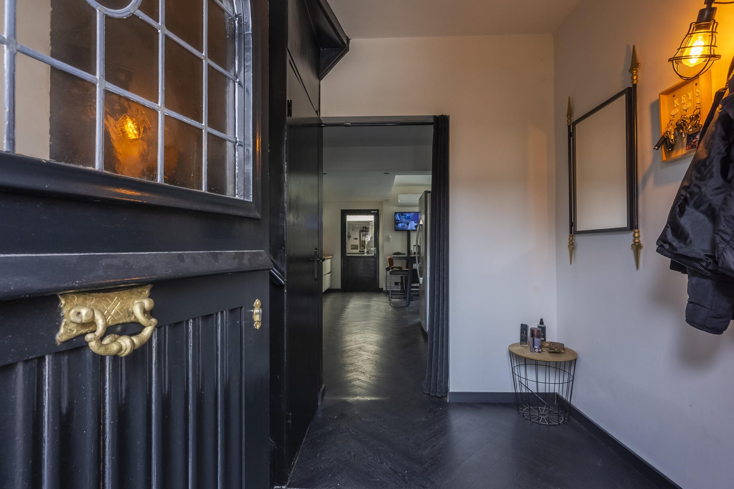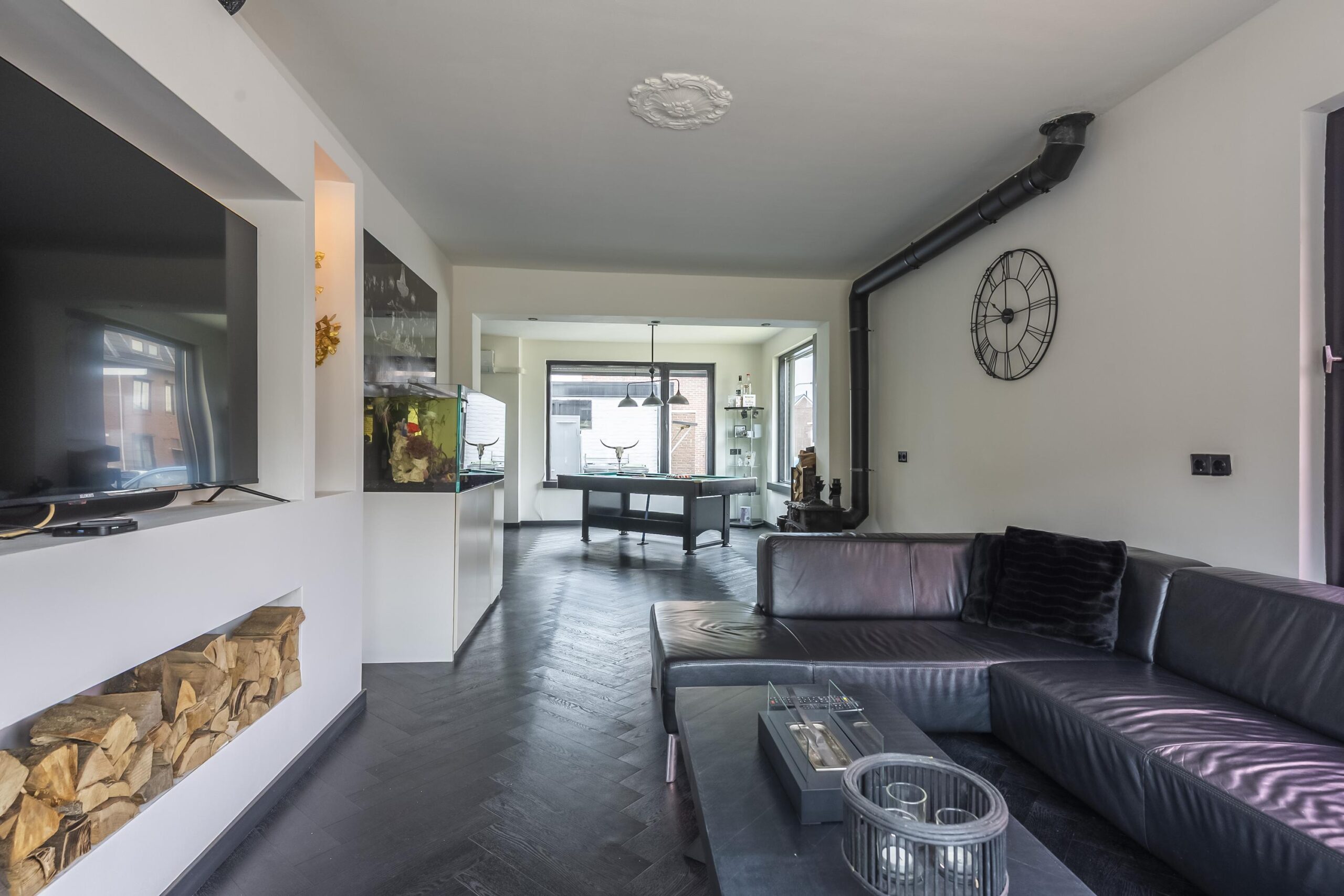 Via onderhoudsvriendelijke voortuin te bereiken entree. Ontvangsthal met trap naar eerste verdieping, garderobe, vernieuwde meterkast en geheel betegeld vrijhangend toilet. Vanuit hier betreedt men de sfeervolle, moderne en ruime woonkamer voorzien van zwarte, visgraat pvc vloer, wanden in glad stucwerk, houtkachel en airco. De ingebouwde cinemawall geeft de woonkamer een luxe uitstraling.