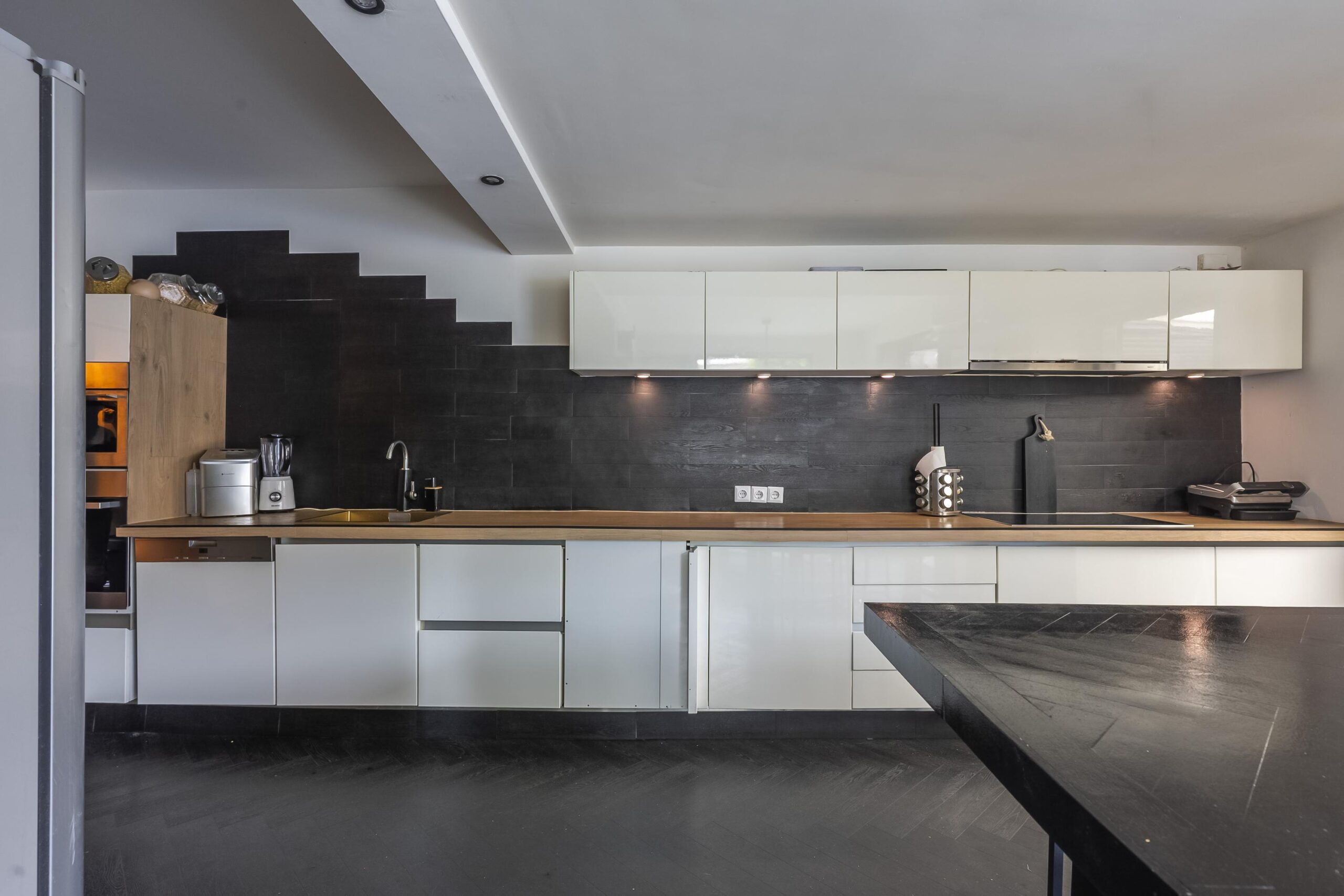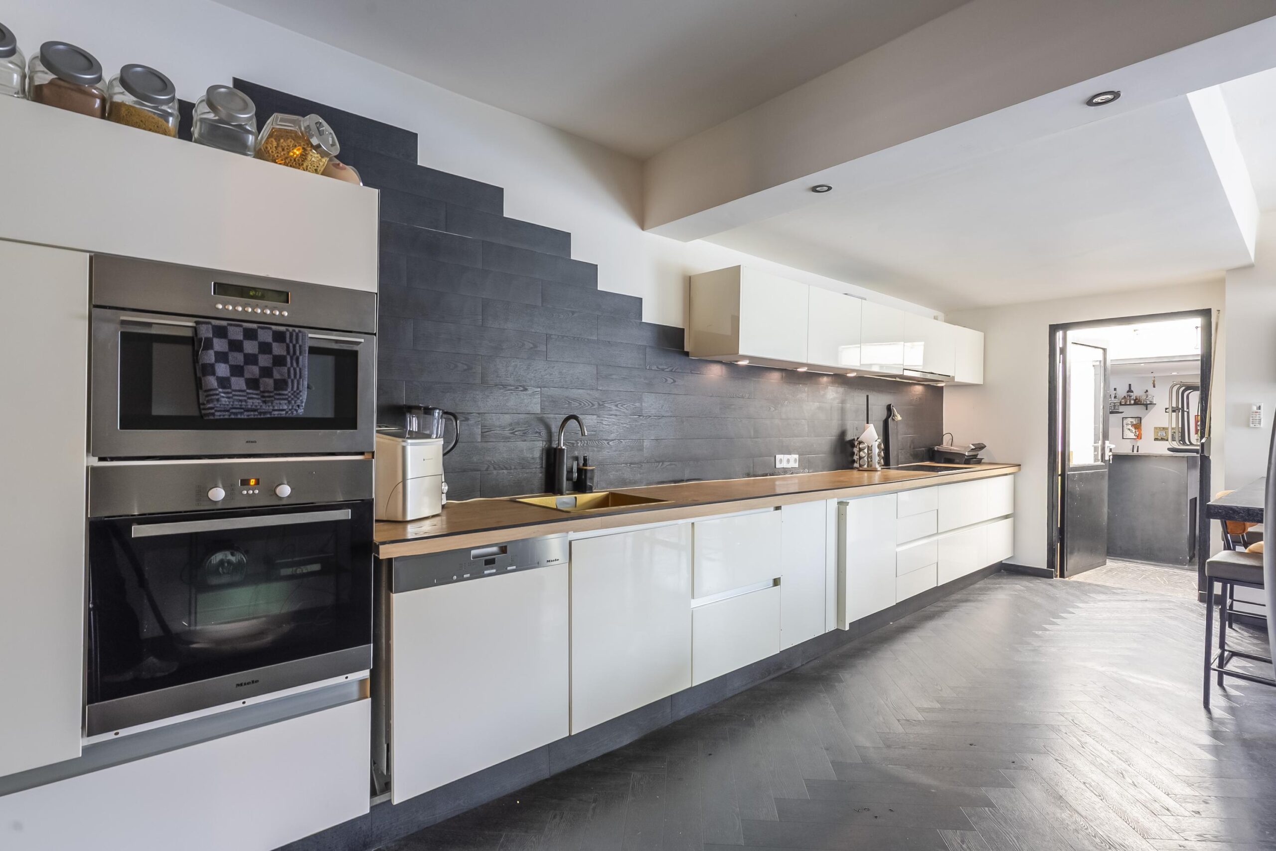 De witte open keuken is royaal van opzet, heeft een aanrechtblad van ca. 5 meter en beschikt over de navolgende inbouwapparatuur: magnetron, oven, vaatwasser, inductiekookplaat en afzuigkap.