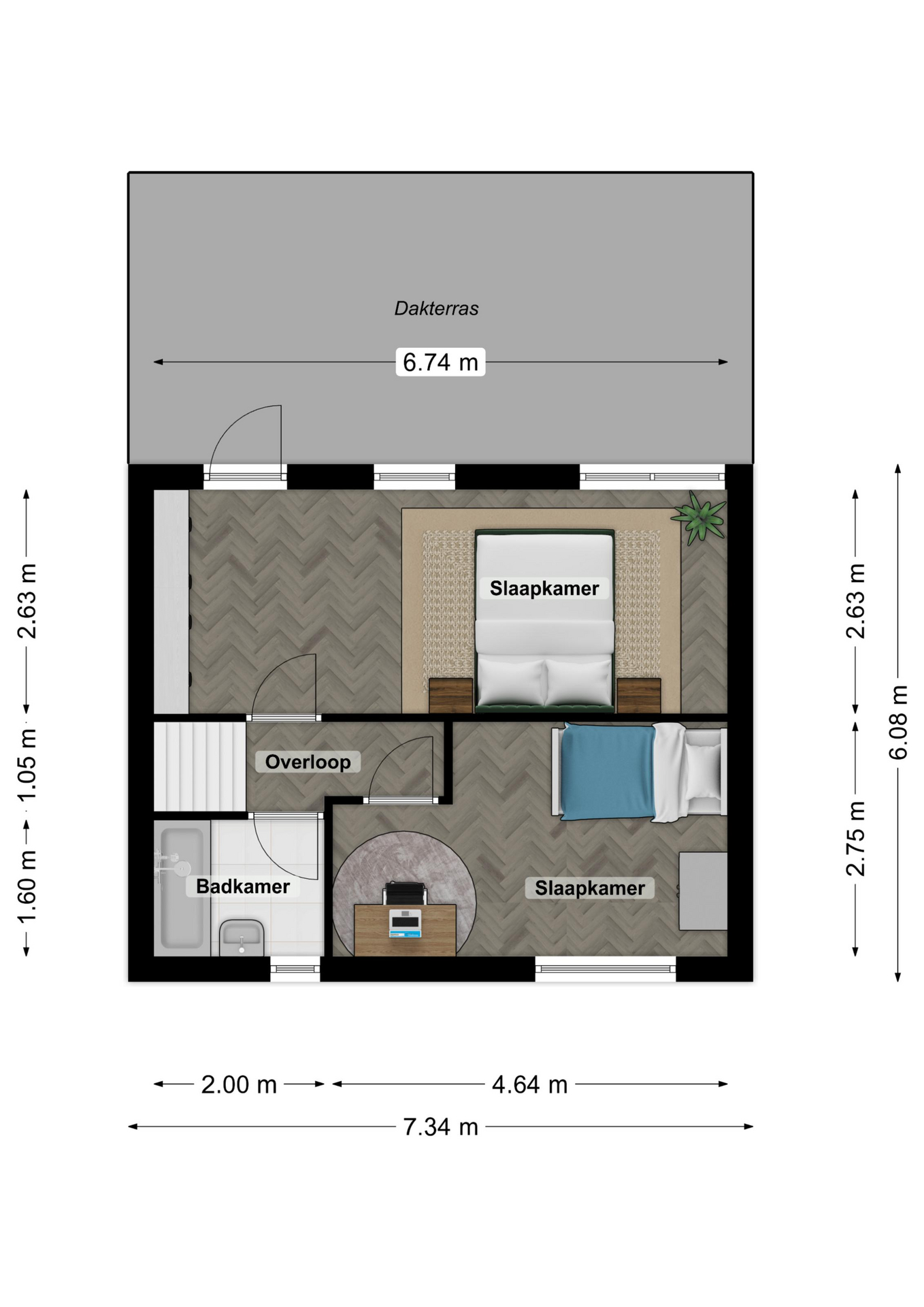 Via de grote slaapkamer bereikt men het royale dakterras met panoramisch uitzicht over de wijk.
