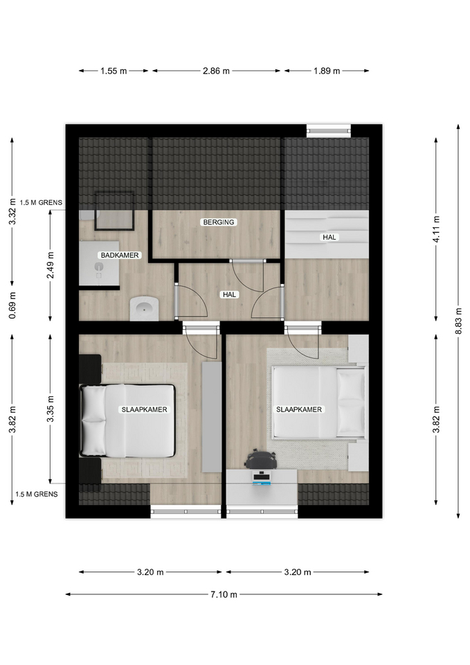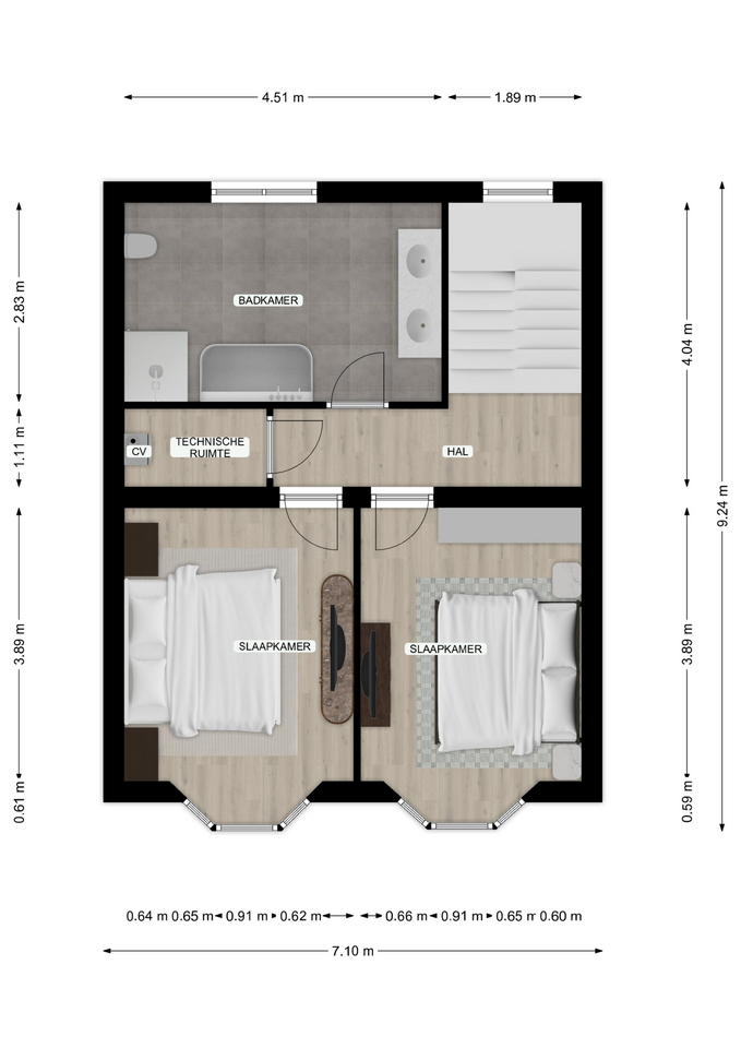 Middels vaste trap toegang tot de tweede verdieping met nog twee slaapkamers en een tweede badkamer.