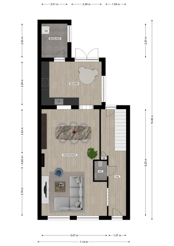 De woonkamer heeft twee grote raampartijen die zorgen voor veel lichtinval en biedt ruimte voor zowel een royale zithoek als een eethoek. Vanuit de woonkamer is de keuken bereikbaar, uitgevoerd met een plavuizenvloer en een moderne L-opstelling. De keuken beschikt over de volgende inbouwapparatuur: koelkast, vaatwasser, combi-oven, inductiekookplaat en afzuigkap. Via openslaande deuren is er toegang tot de tuin. Aan de achterzijde bevindt zich een praktische bijkeuken met aansluiting voor het witgoed.