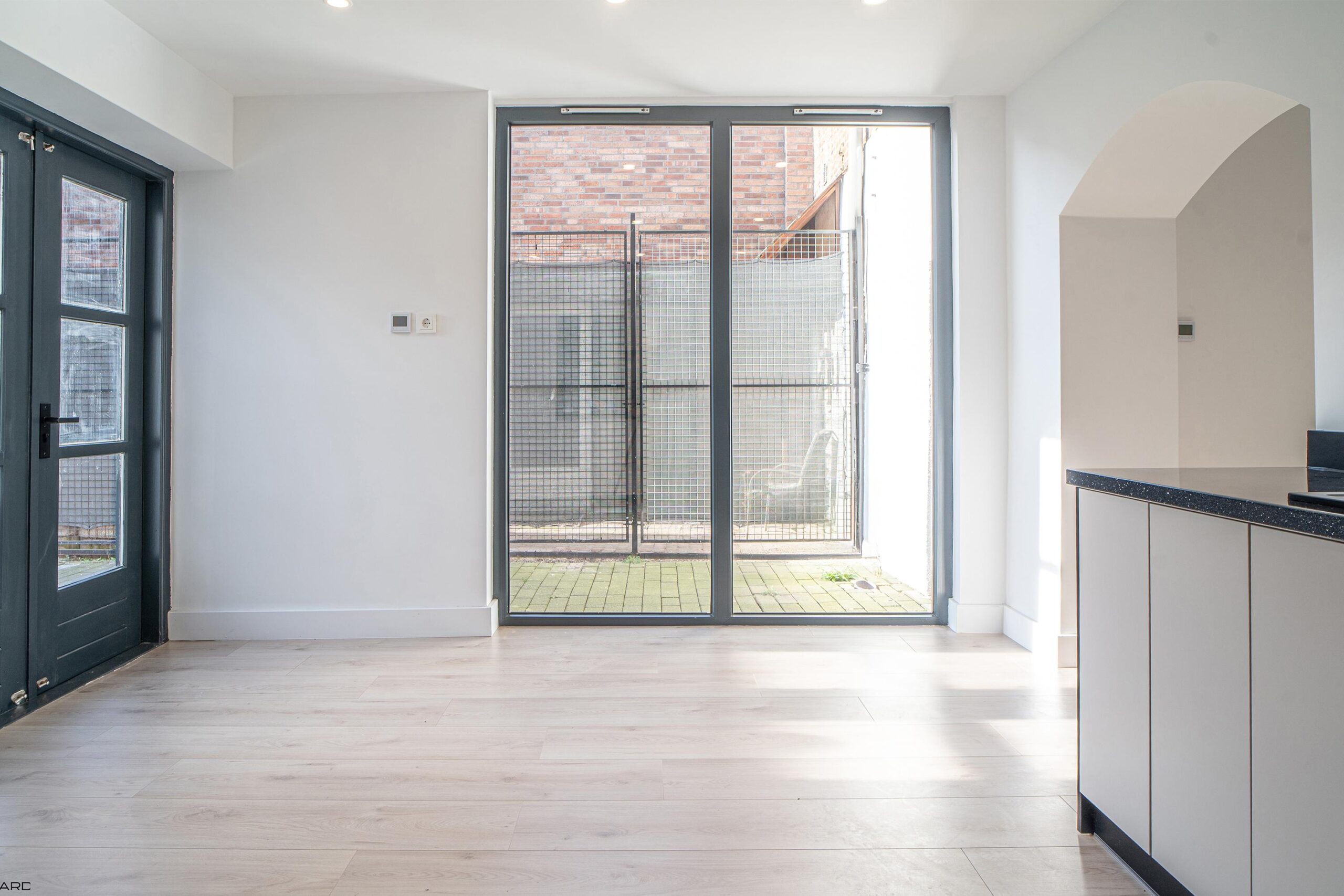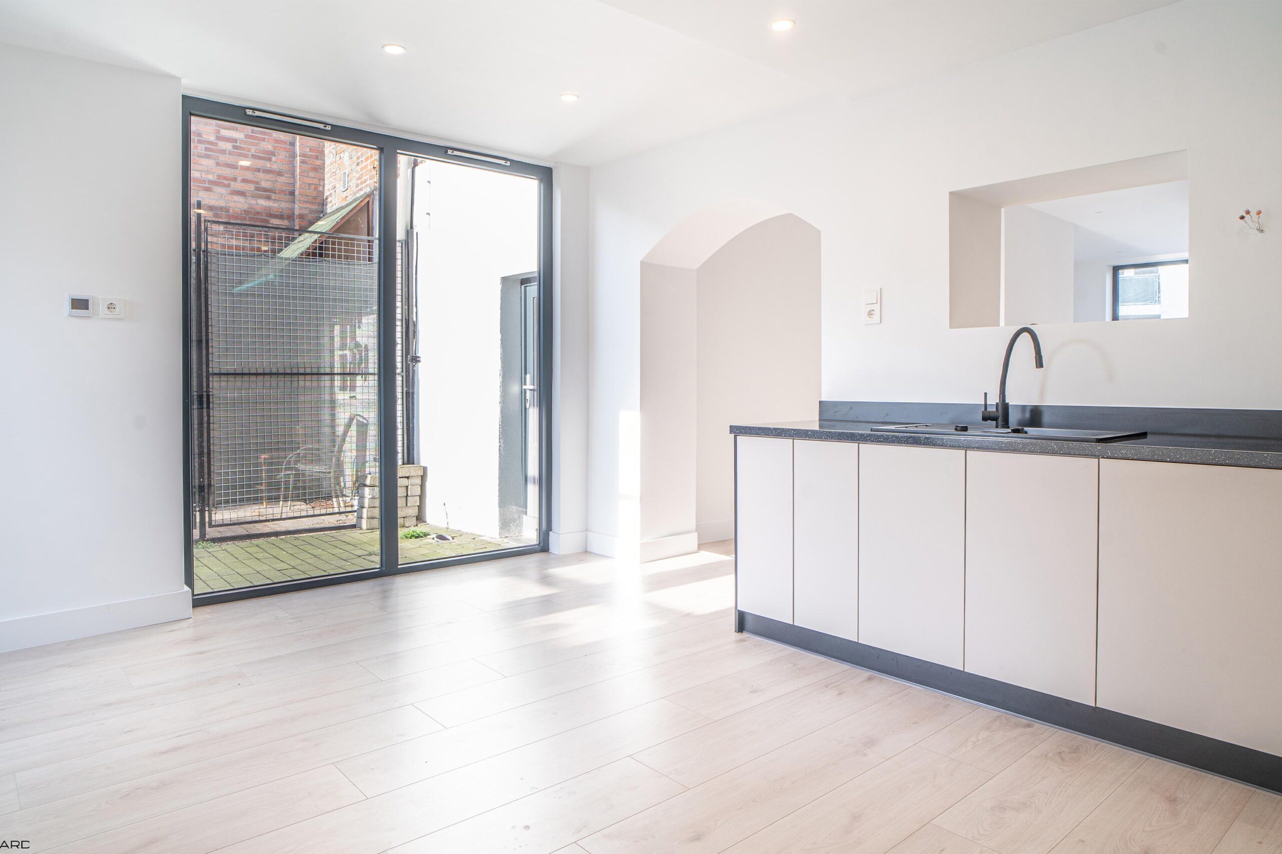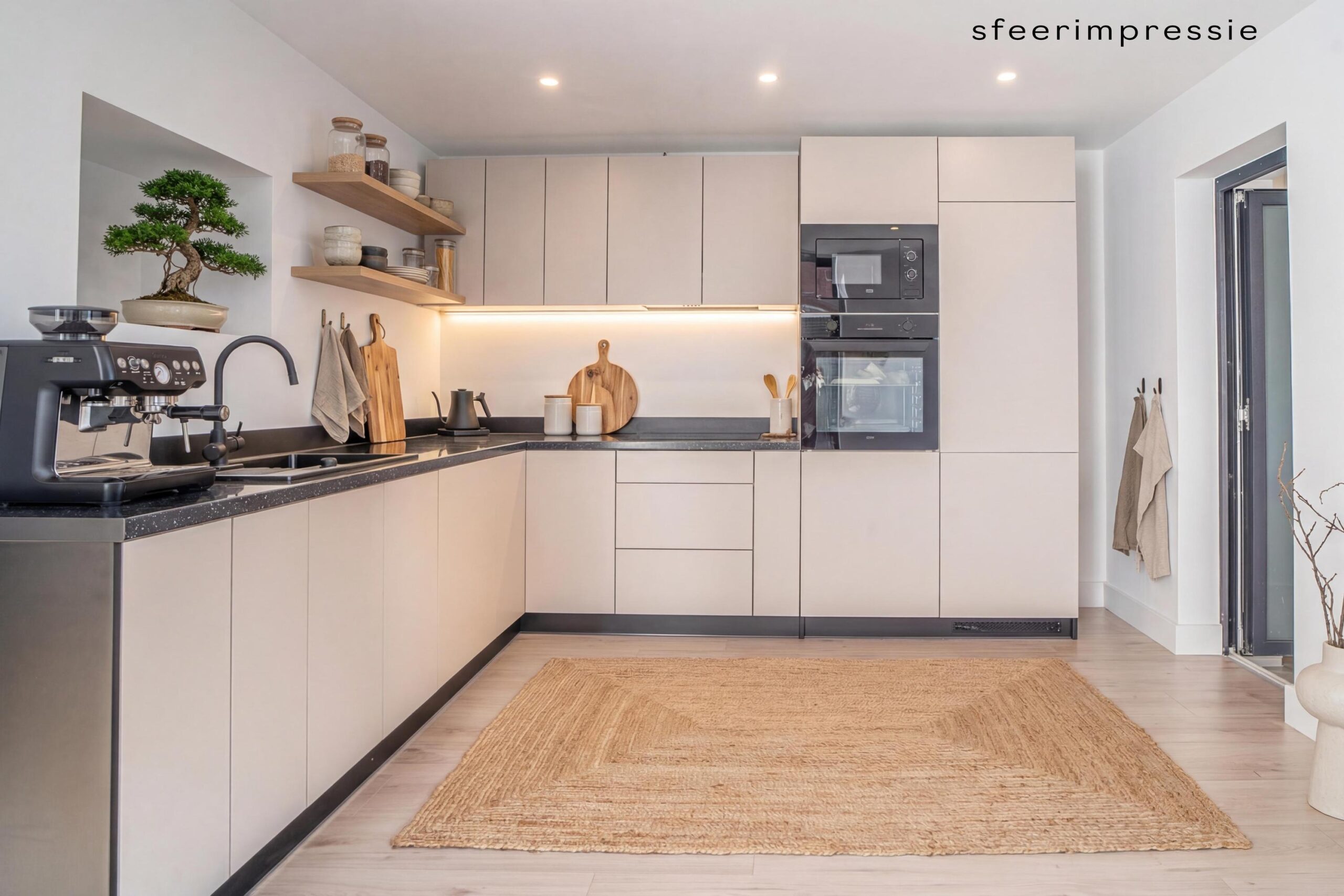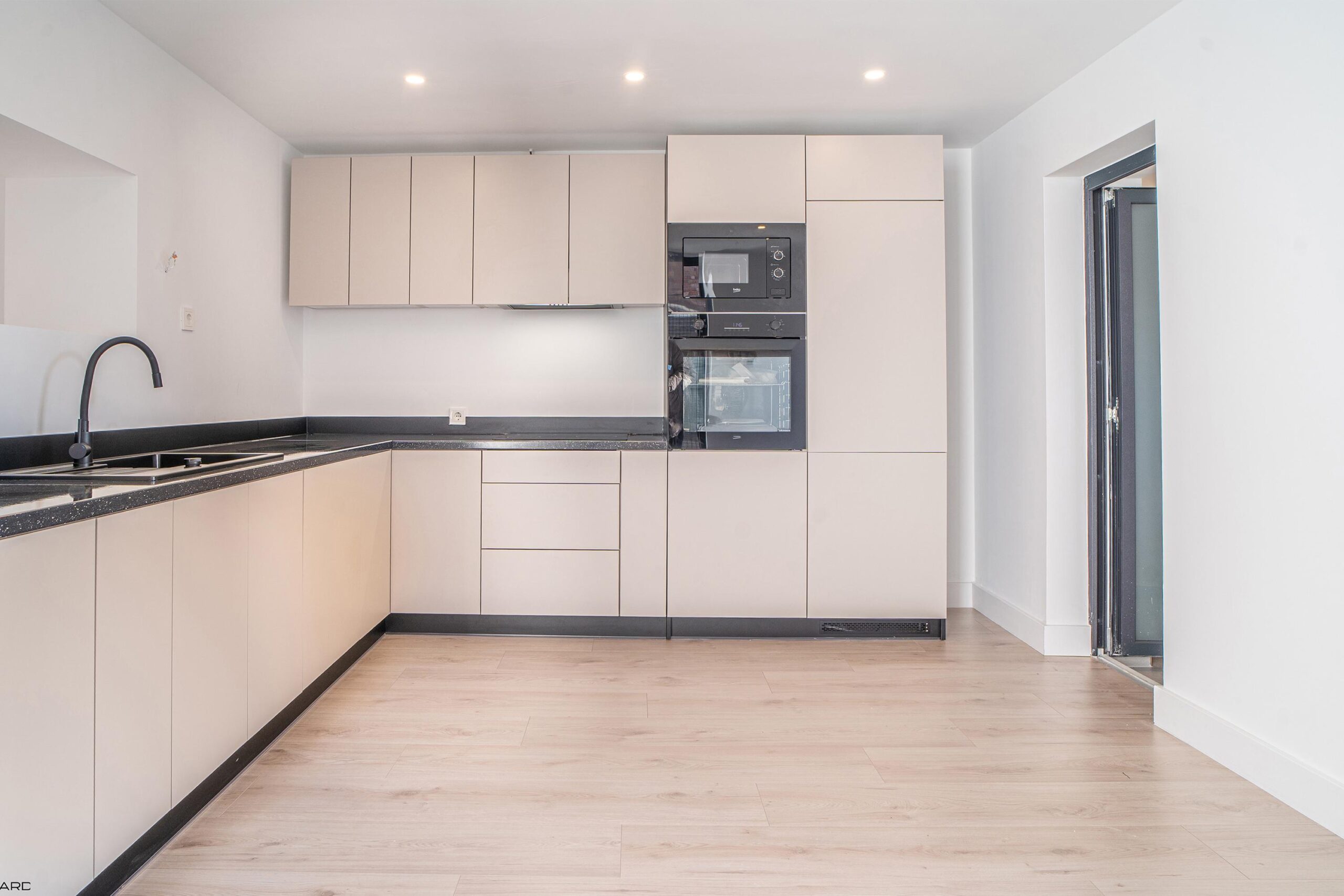 De lichte woonkamer biedt plaats aan zowel een royale zithoek als eethoek en is volledig afgewerkt met inbouwspots en een pvc-vloer. De woonkamer staat in open verbinding met de moderne keuken in L-opstelling, uitgerust met nieuwe inbouwapparatuur: koelkast, vaatwasser, combi-oven, magnetron, inductiekookplaat en afzuigkap. Grote ramen en openslaande deuren zorgen voor veel lichtinval en directe toegang tot de tuin. Aangrenzend bevindt zich een praktische bijkeuken met witgoedaansluiting.