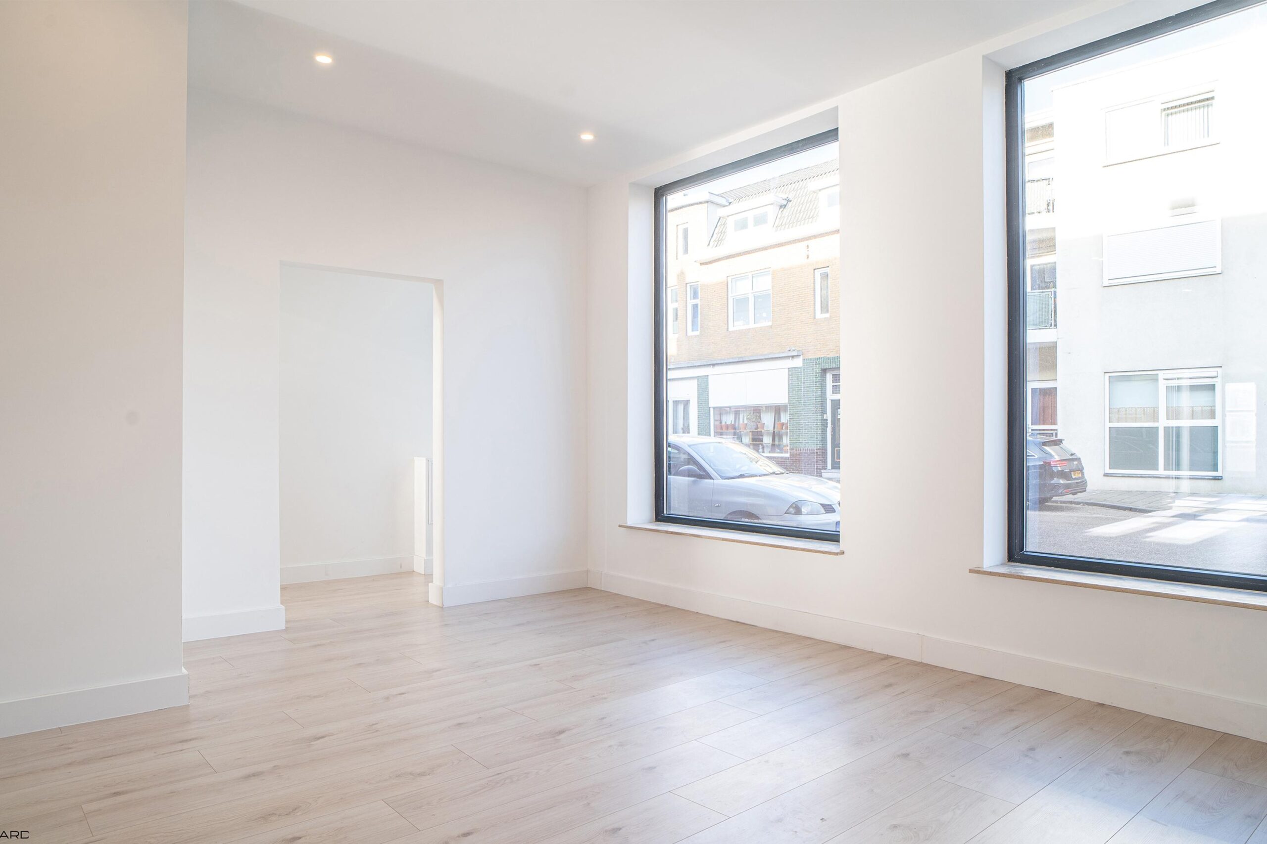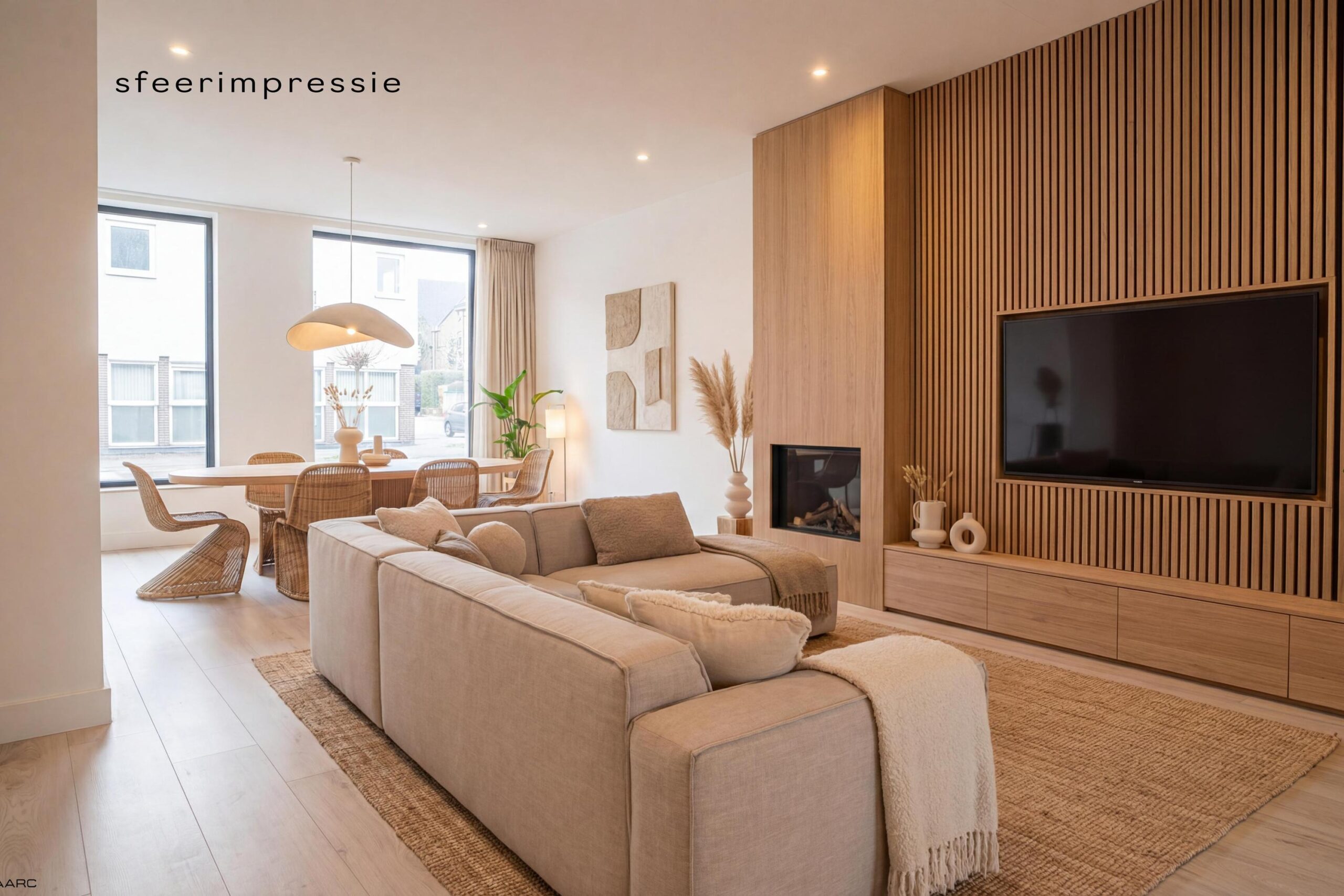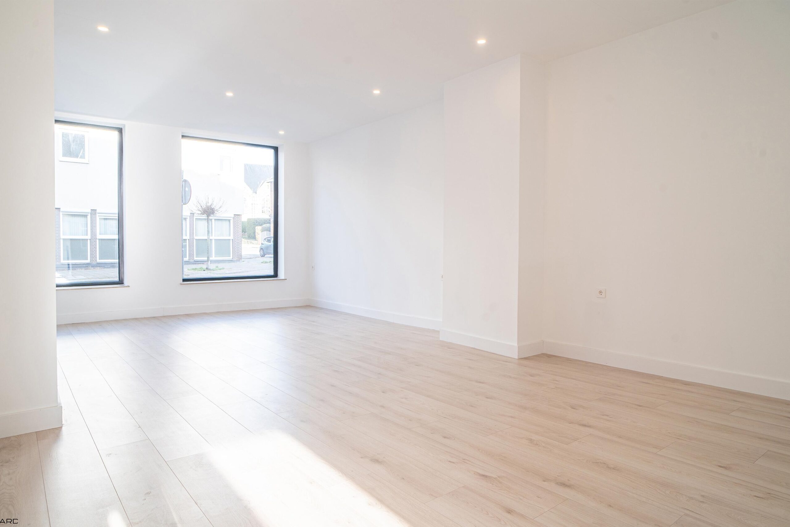 De lichte woonkamer biedt plaats aan zowel een royale zithoek als eethoek en is volledig afgewerkt met inbouwspots en een pvc-vloer. De woonkamer staat in open verbinding met de moderne keuken in L-opstelling, uitgerust met nieuwe inbouwapparatuur: koelkast, vaatwasser, combi-oven, magnetron, inductiekookplaat en afzuigkap. Grote ramen en openslaande deuren zorgen voor veel lichtinval en directe toegang tot de tuin. Aangrenzend bevindt zich een praktische bijkeuken met witgoedaansluiting.