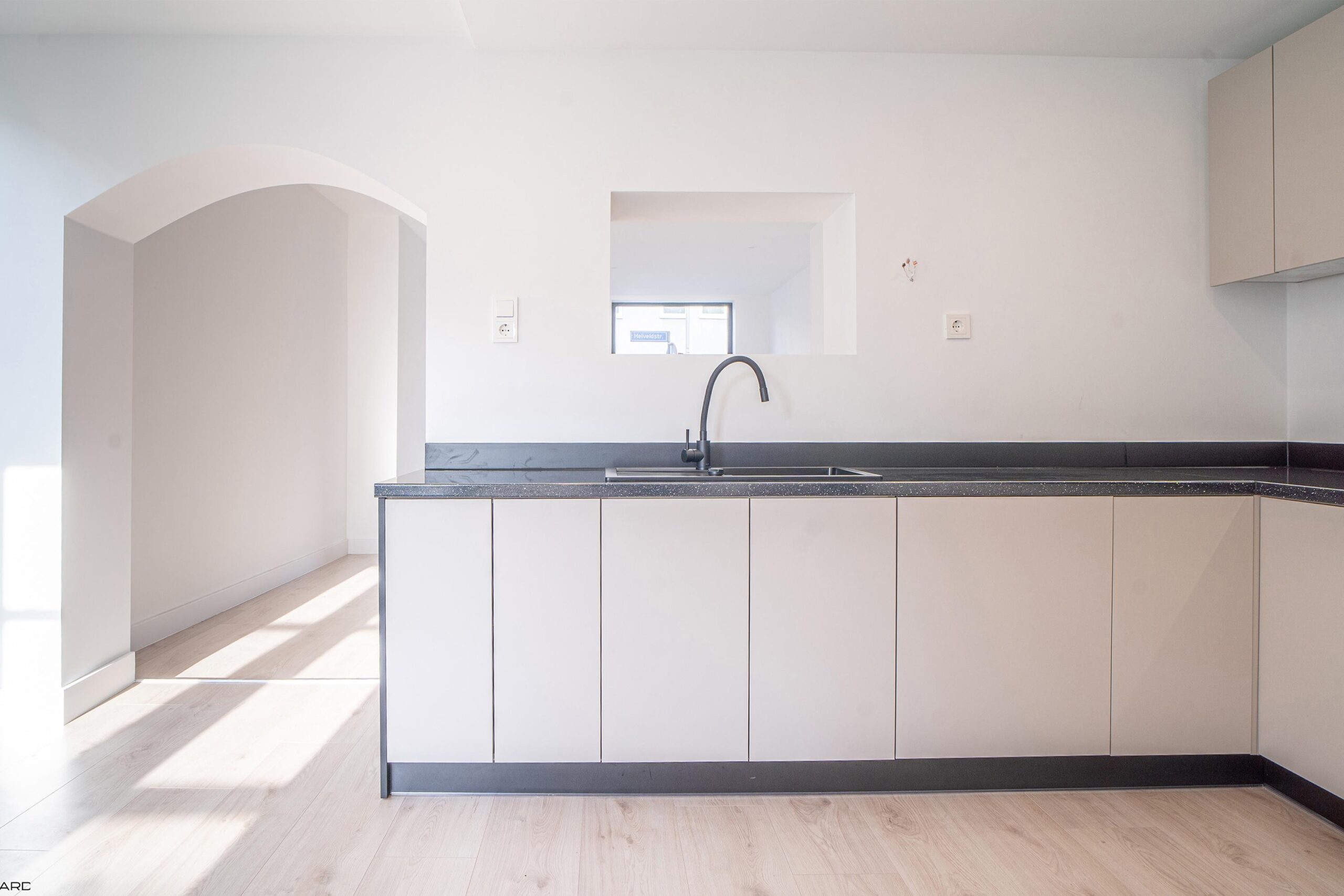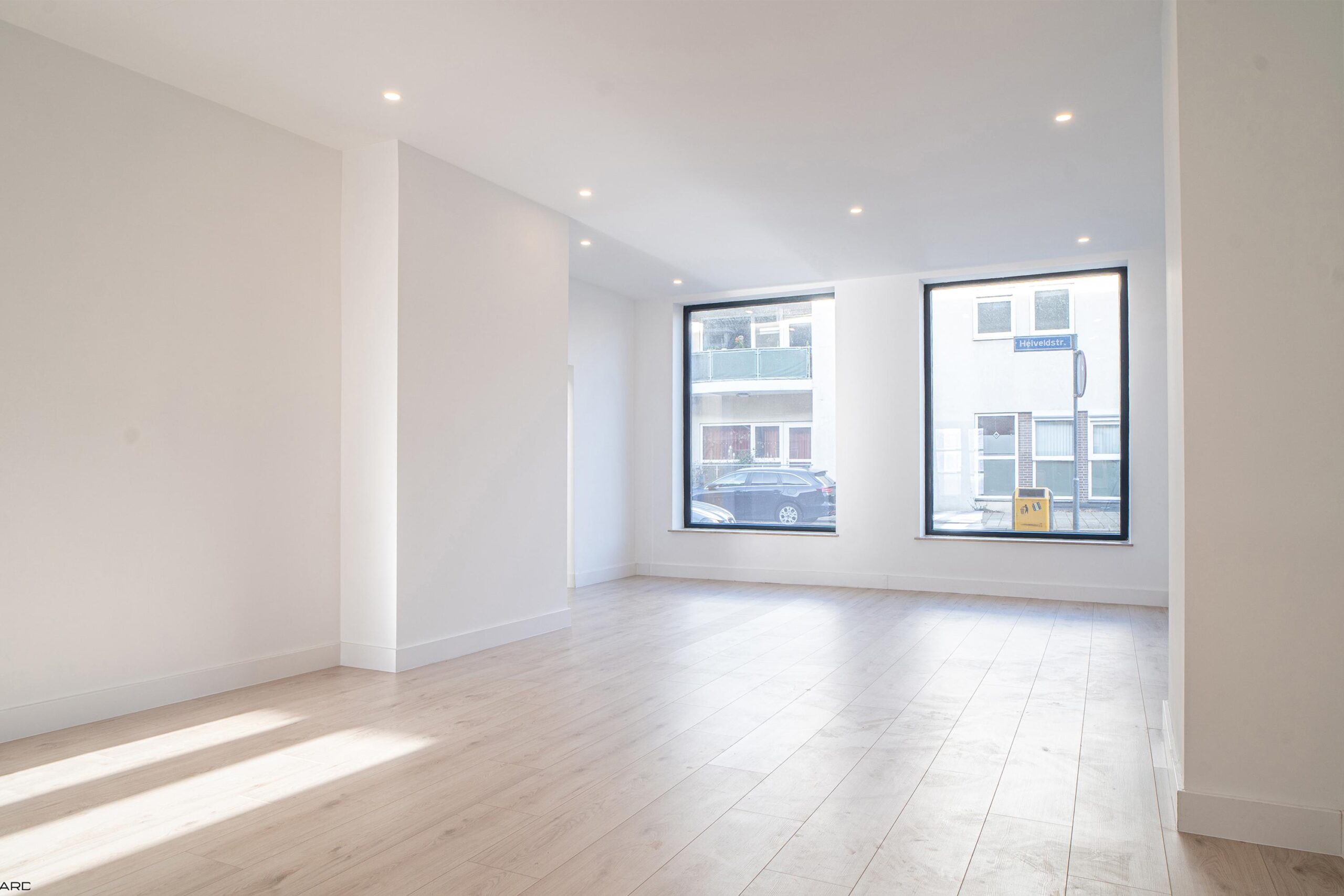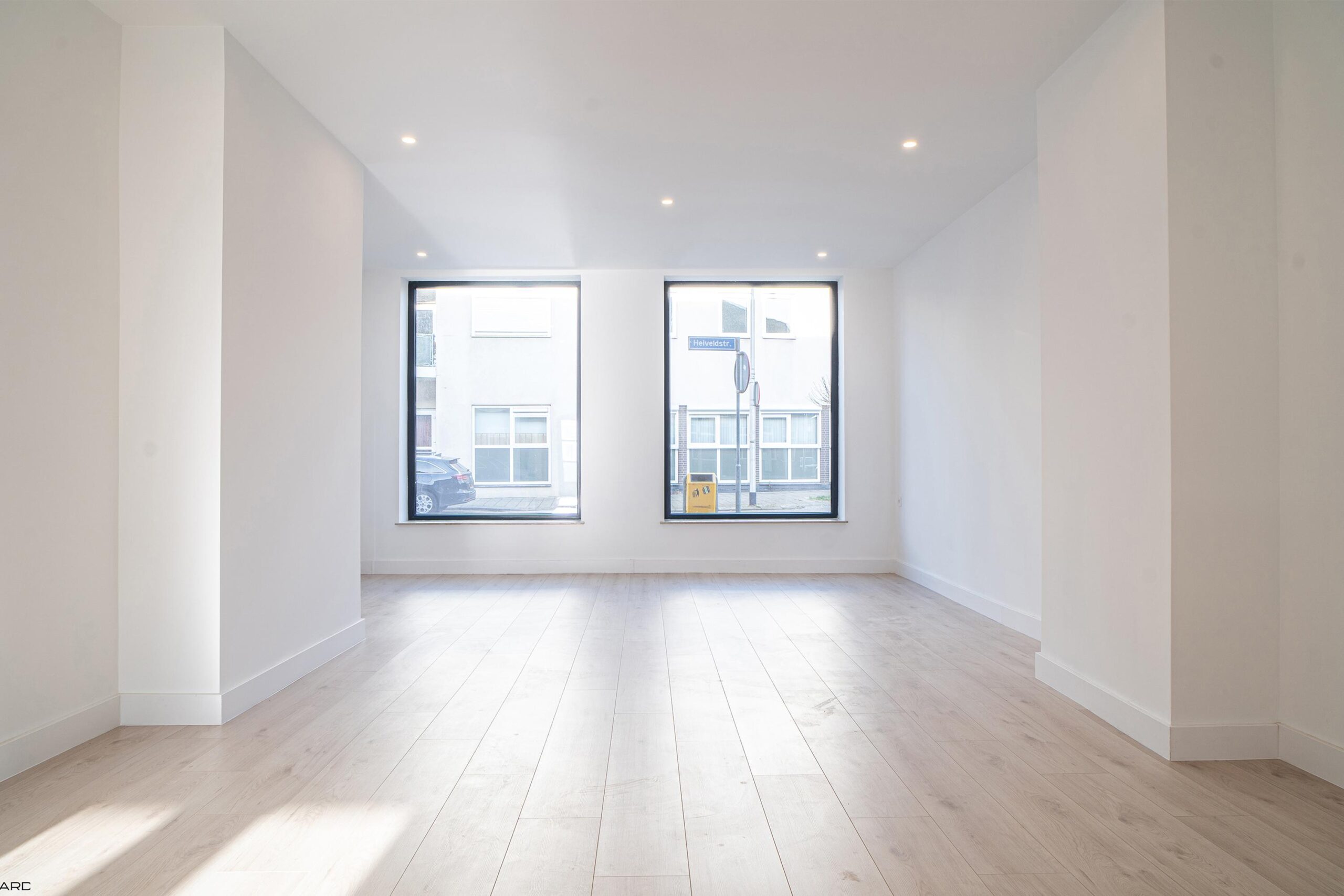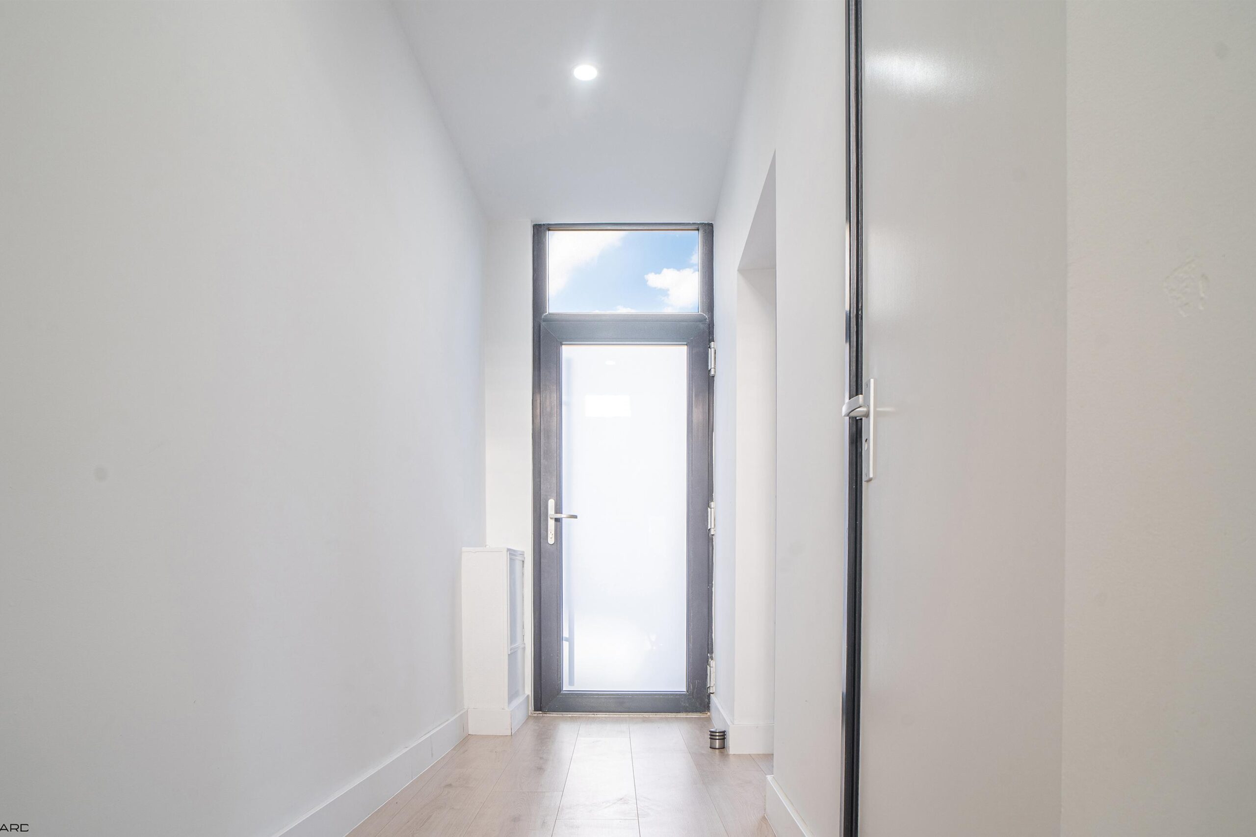 De lichte woonkamer biedt plaats aan zowel een royale zithoek als eethoek en is volledig afgewerkt met inbouwspots en een pvc-vloer. De woonkamer staat in open verbinding met de moderne keuken in L-opstelling, uitgerust met nieuwe inbouwapparatuur: koelkast, vaatwasser, combi-oven, magnetron, inductiekookplaat en afzuigkap. Grote ramen en openslaande deuren zorgen voor veel lichtinval en directe toegang tot de tuin. Aangrenzend bevindt zich een praktische bijkeuken met witgoedaansluiting.