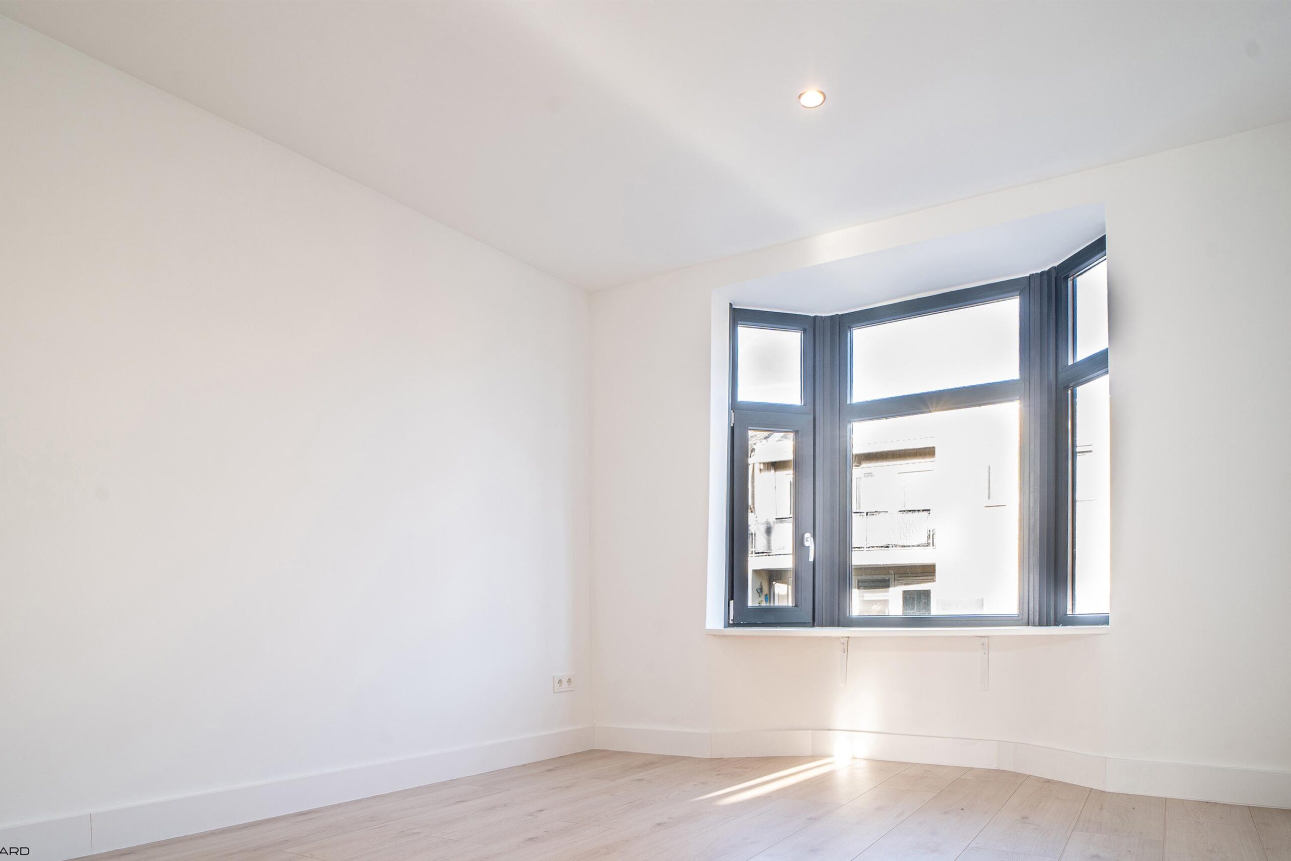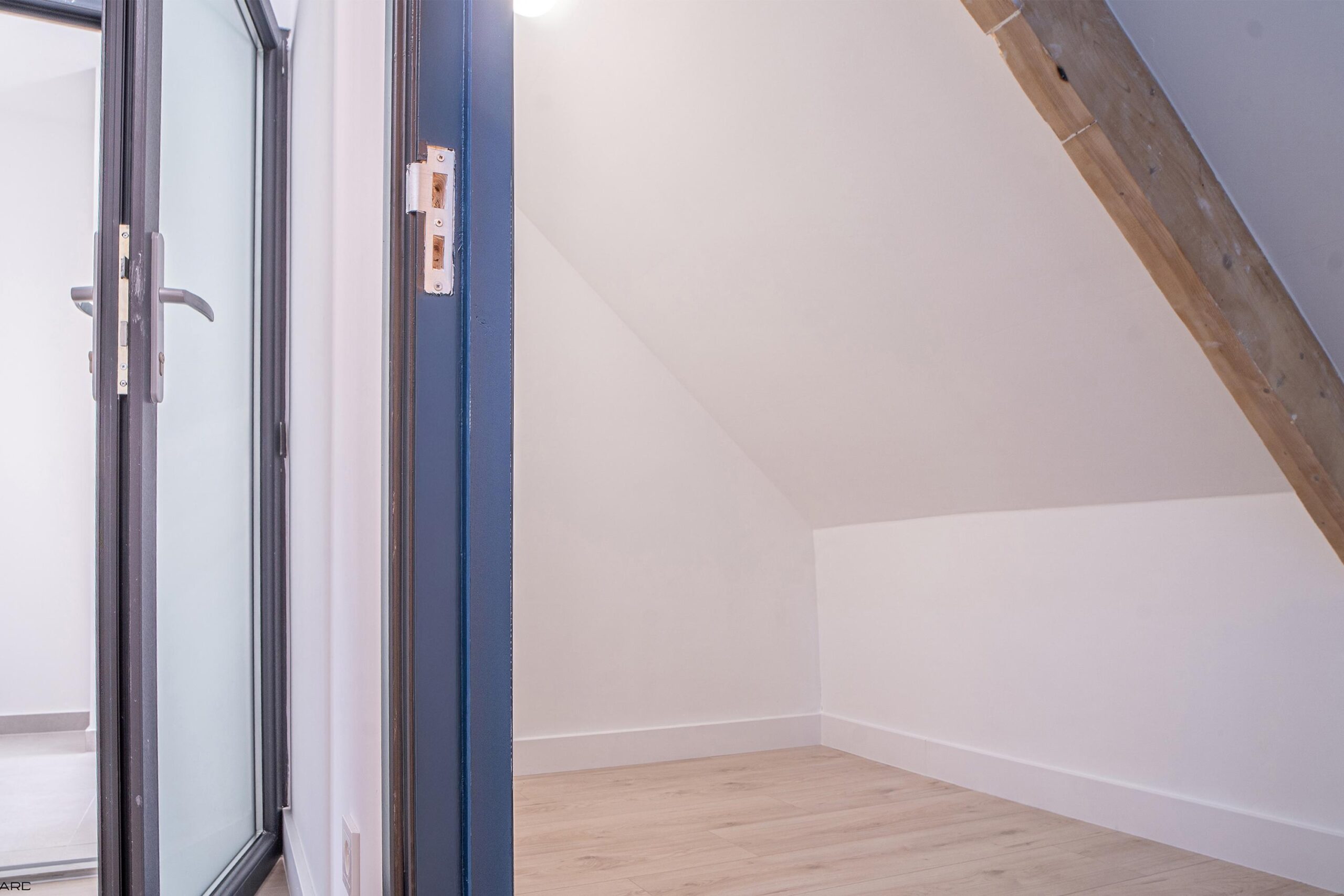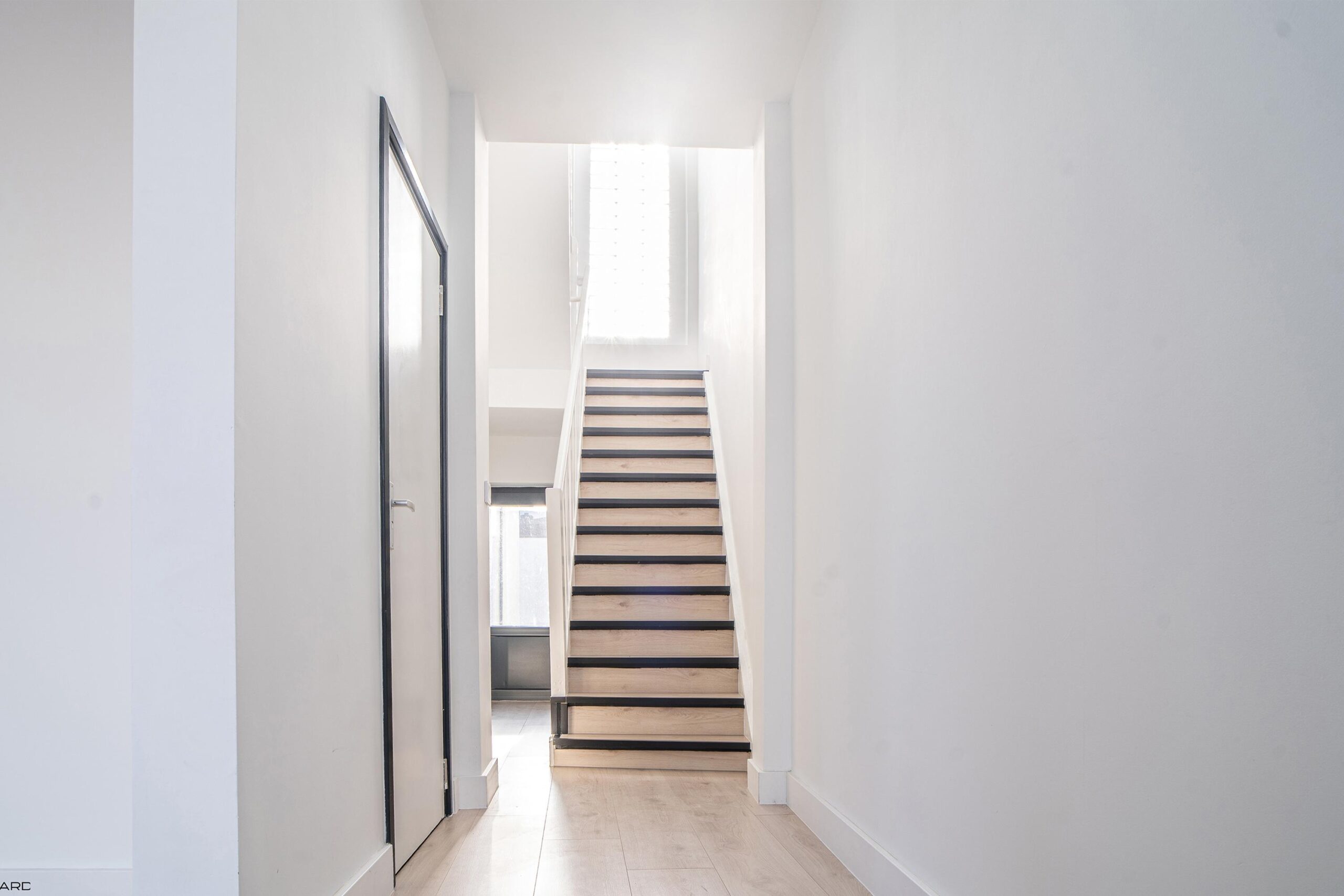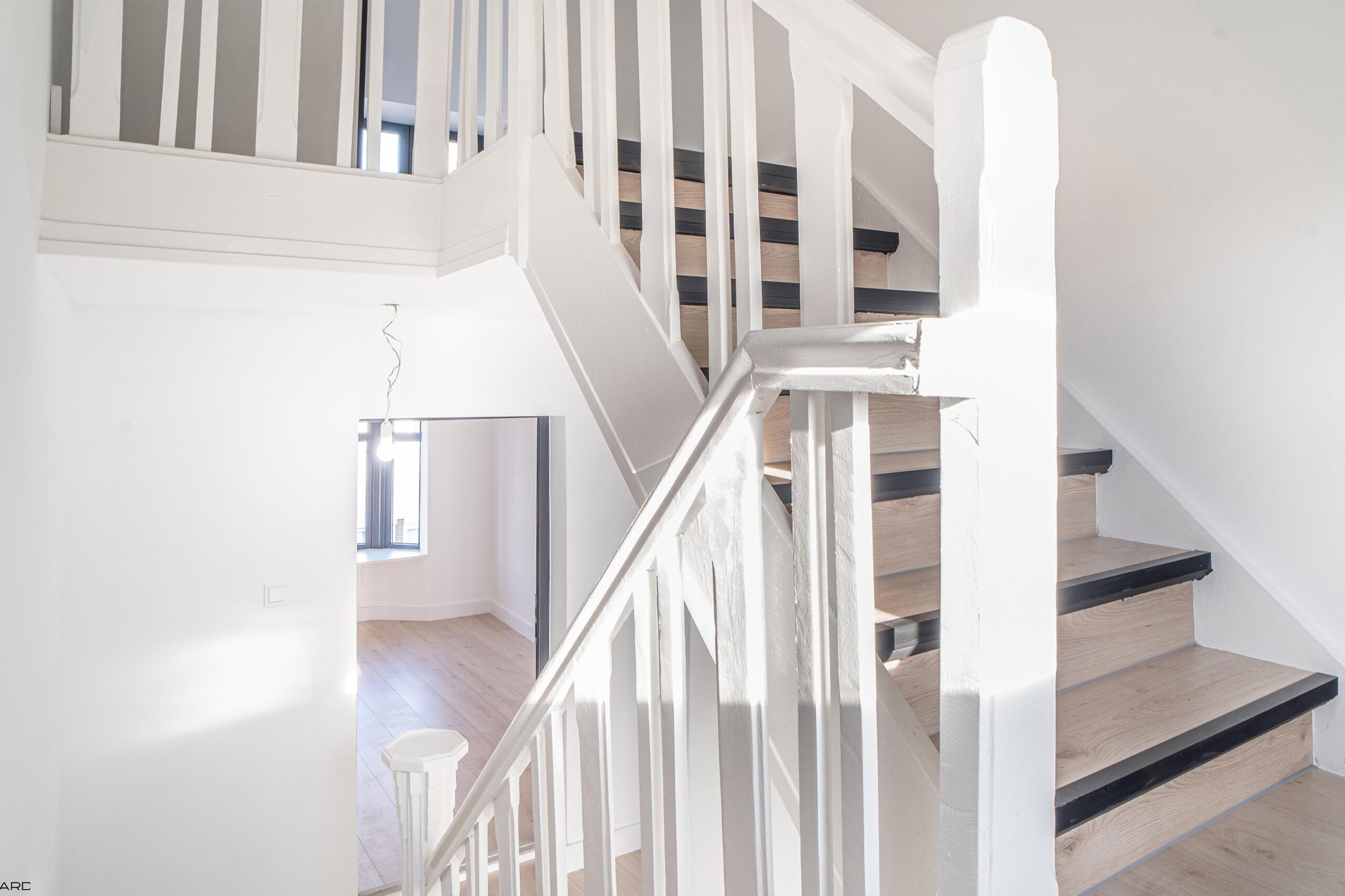 Via de houten trap met pvc-afwerking toegang tot de eerste verdieping. De overloop leidt naar twee ruime slaapkamers met karakteristieke erker, beide voorzien van pvc-vloer en inbouwverlichting (ca. 3,25 x 3,90 m en 3,15 x 3,90 m).