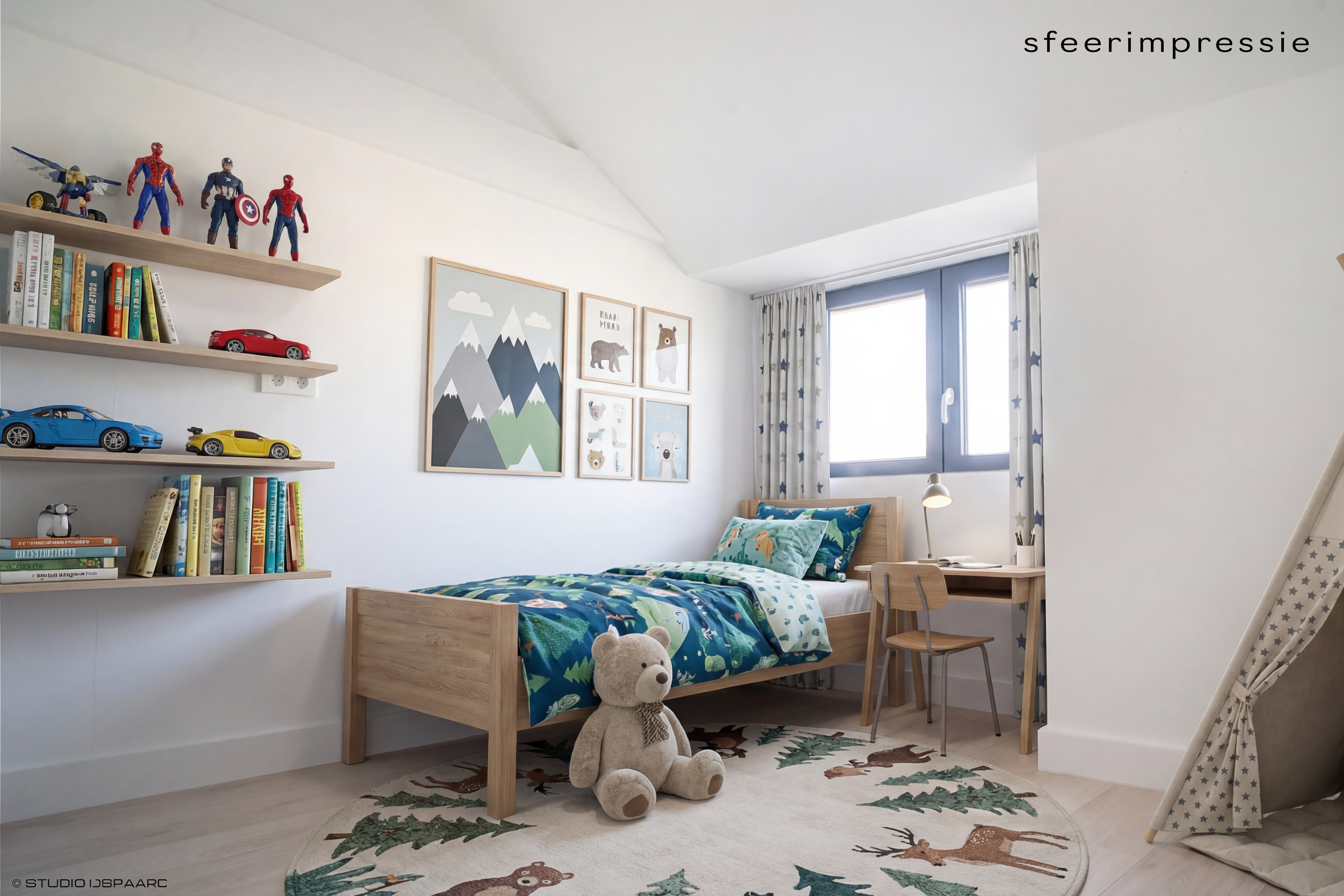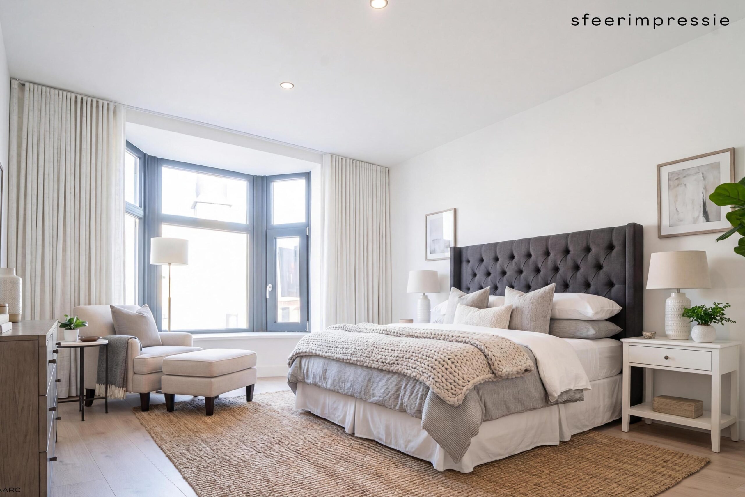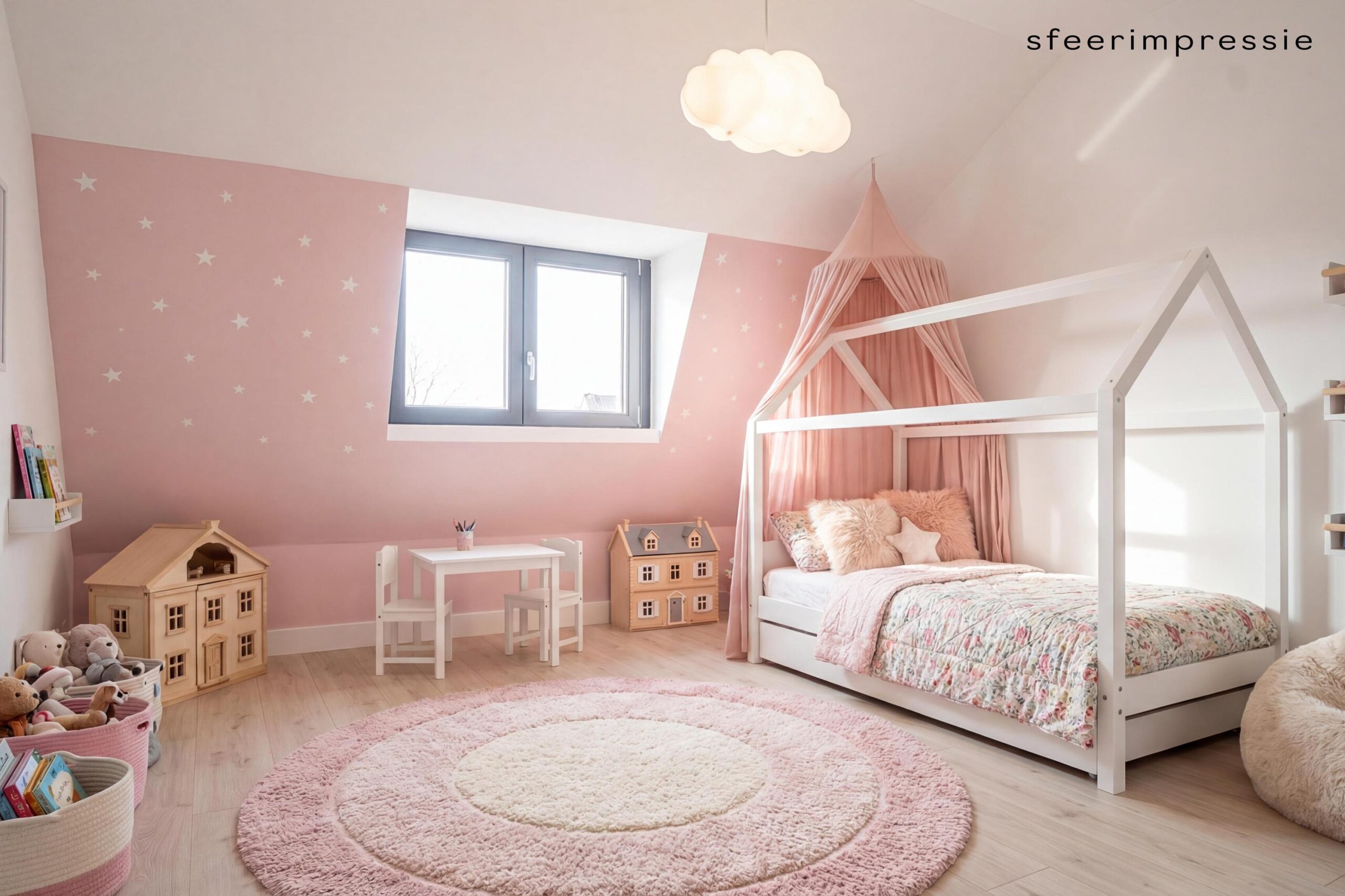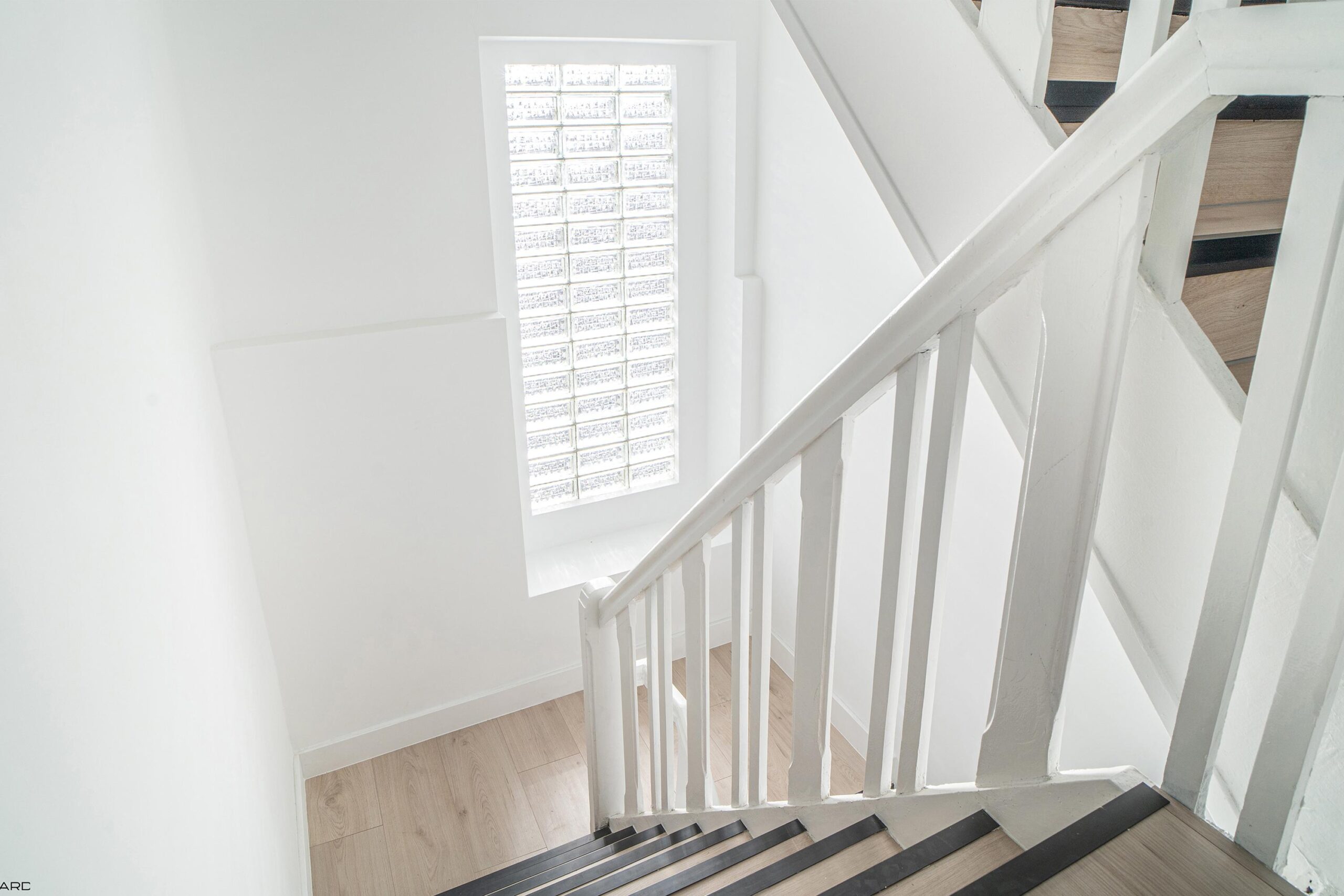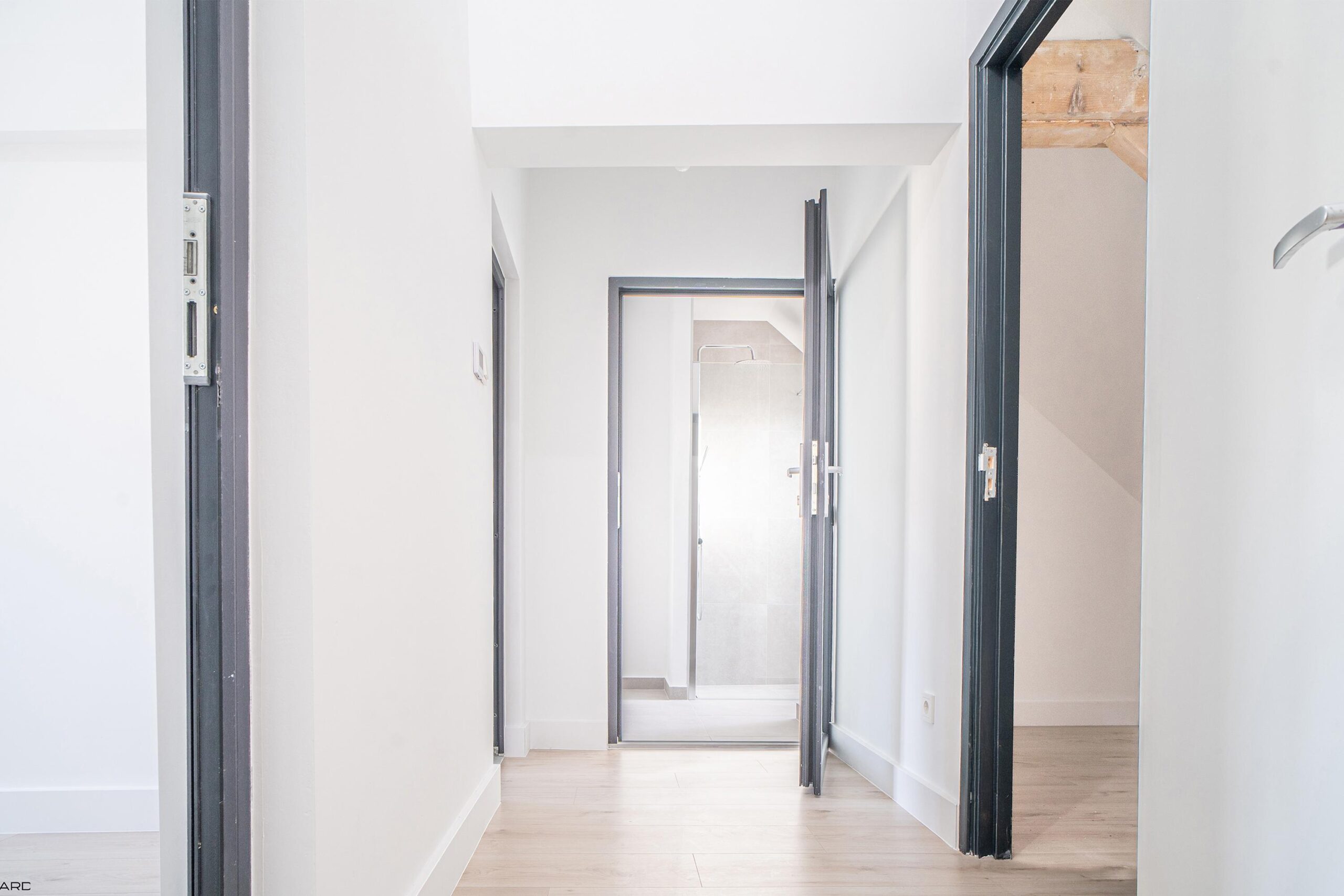 Via de houten trap met pvc-afwerking toegang tot de eerste verdieping. De overloop leidt naar twee ruime slaapkamers met karakteristieke erker, beide voorzien van pvc-vloer en inbouwverlichting (ca. 3,25 x 3,90 m en 3,15 x 3,90 m).