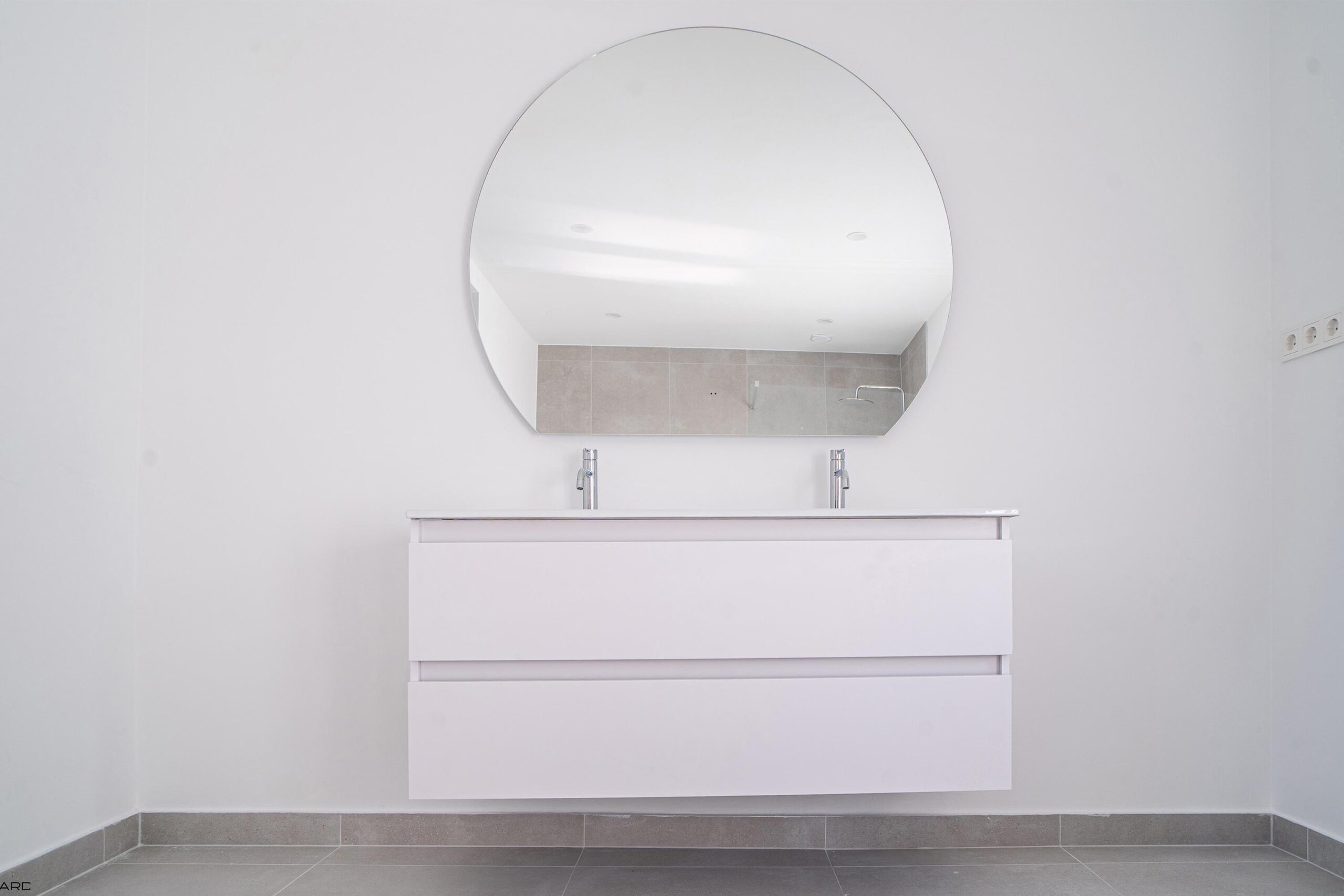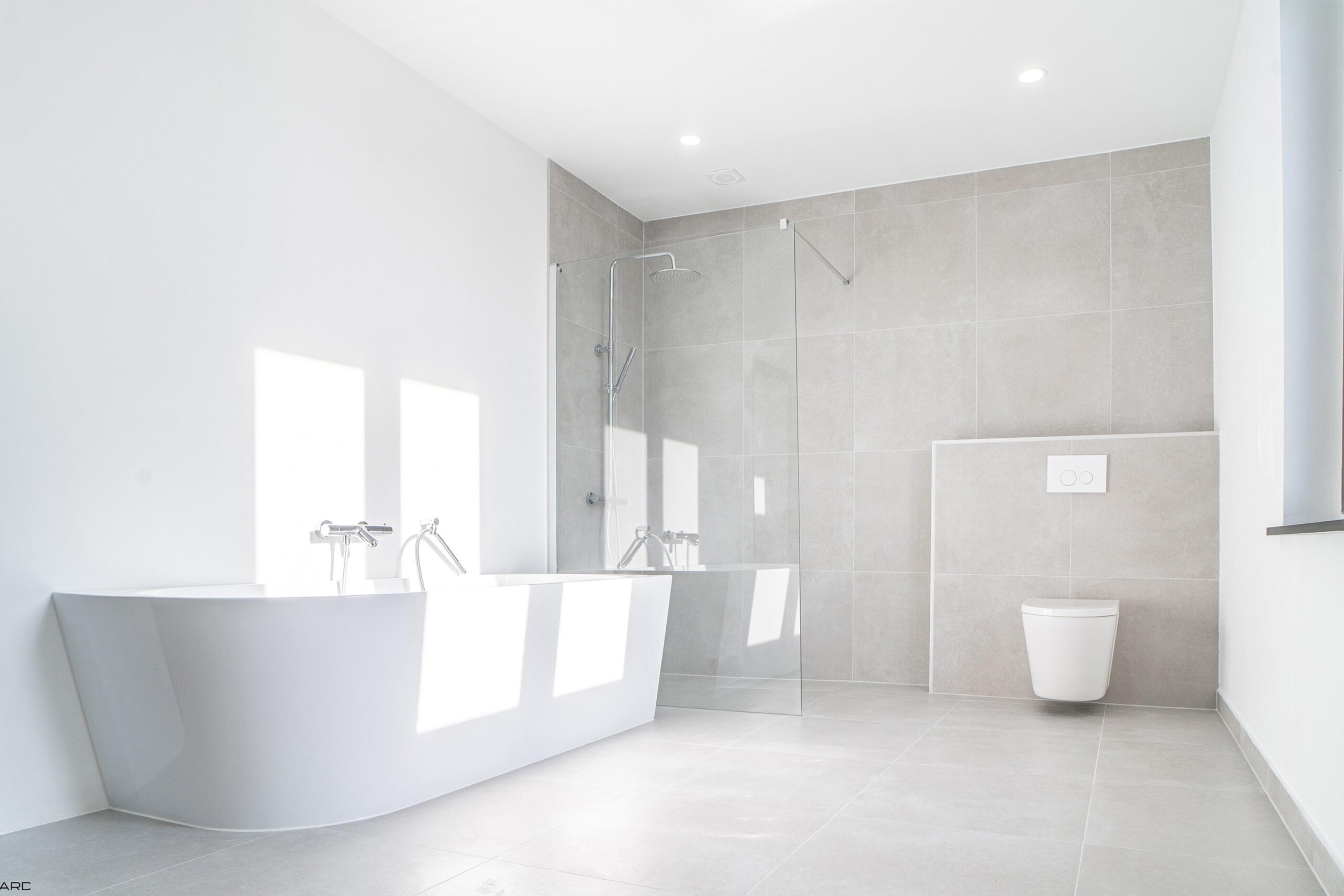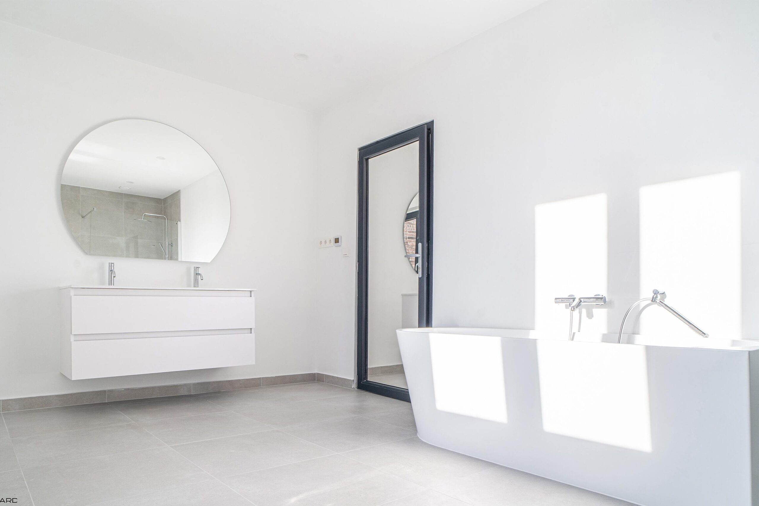 De moderne badkamer (ca. 4,50 x 2,80 m) is ingericht met een royaal ligbad, inloopdouche met hardglazen wanden, tweede zwevend toilet en dubbele wastafel met meubel en spiegel met geïntegreerde verlichting. De badkamer is stijlvol afgewerkt met natuursteentegels en inbouwspots.
