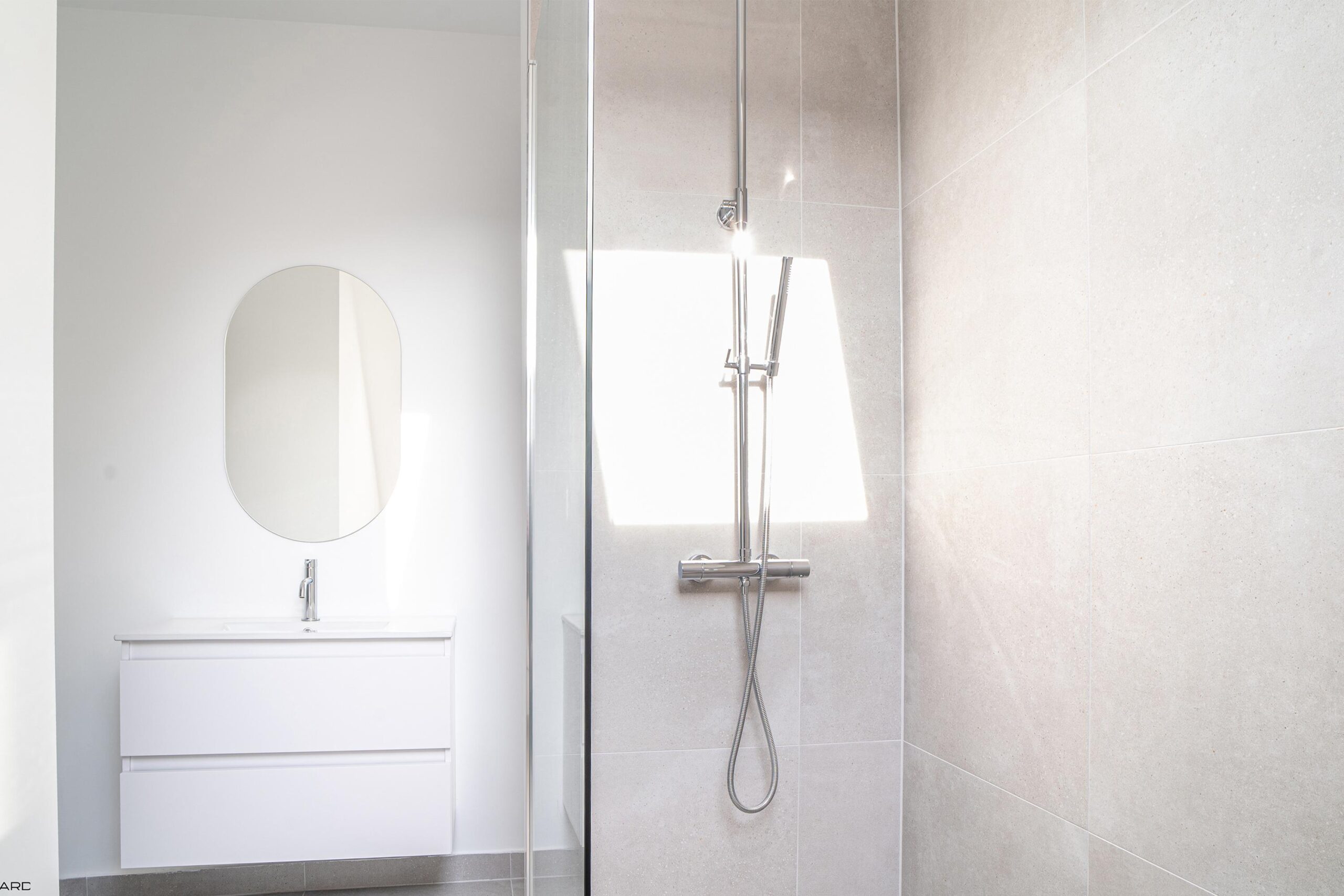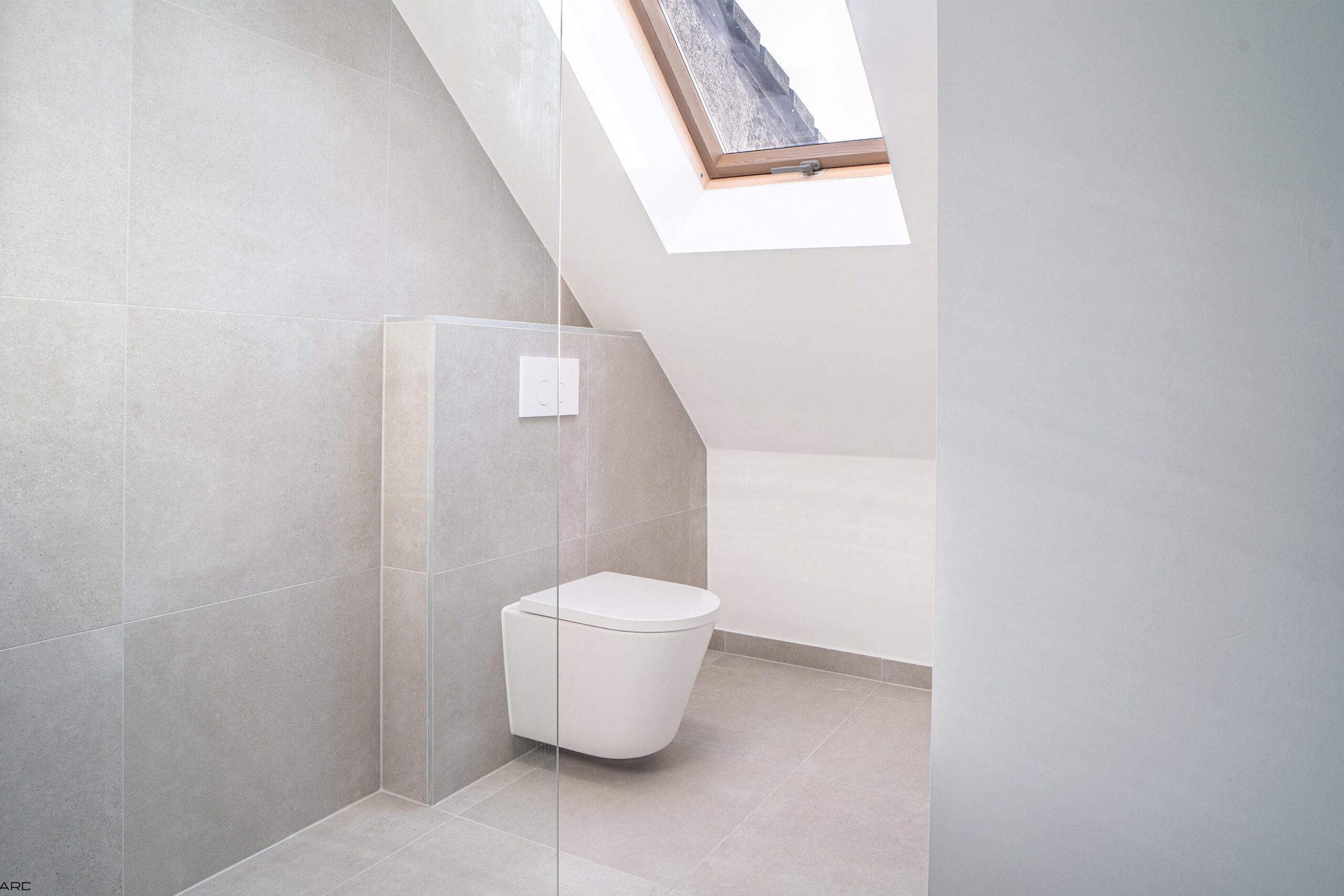 Daarnaast bevindt zich hier een tweede badkamer (ca. 2,50 x 1,50 m) met inloop-regendouche, wastafel met meubel en derde zwevend toilet. Een groot Velux-dakraam zorgt voor natuurlijke lichtinval. Tevens is er een separate berging (ca. 2,90 x 3,00 m) aanwezig.
