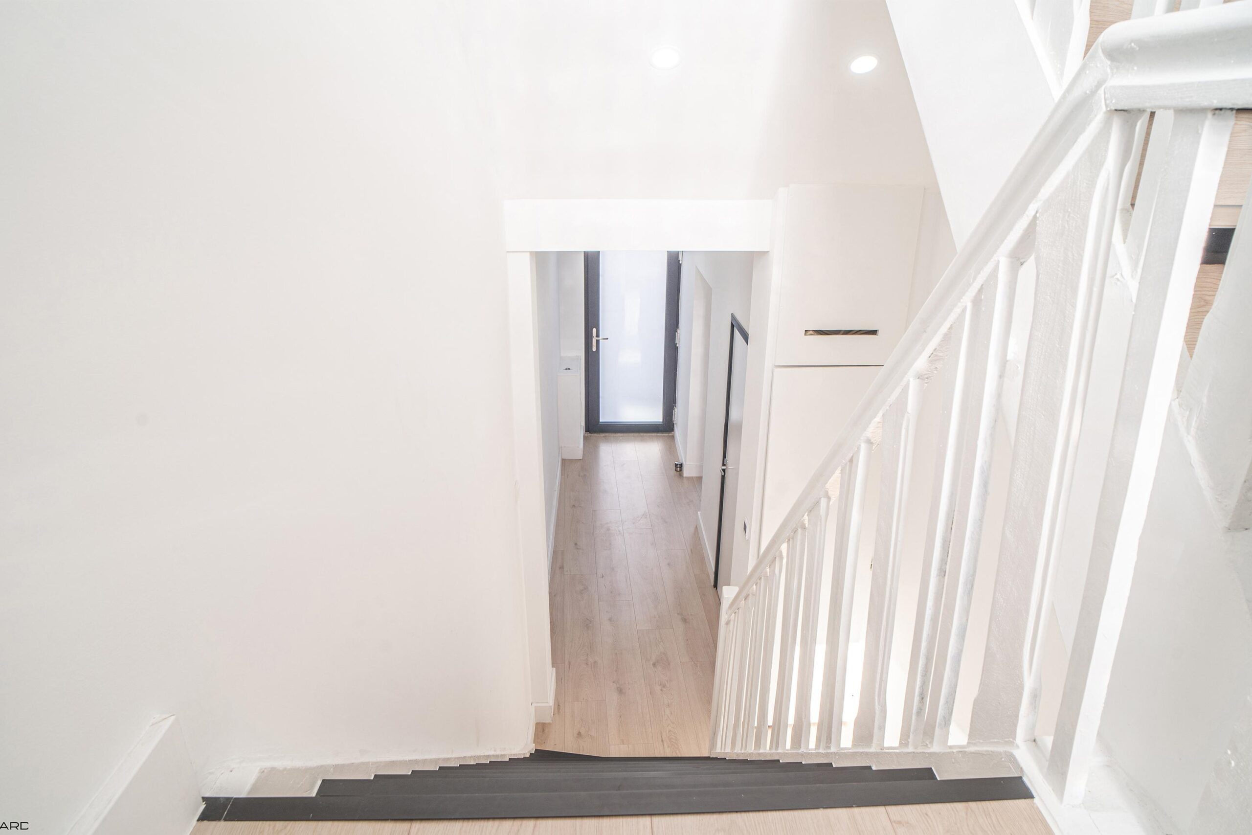 Via de ruime ontvangsthal toegang tot de woonkamer, toiletruimte, kelder, tuin, trapopgang en de vernieuwde meterkast (3-fase aansluiting). Het betegelde toilet is voorzien van een fontein en een zwevend closet.