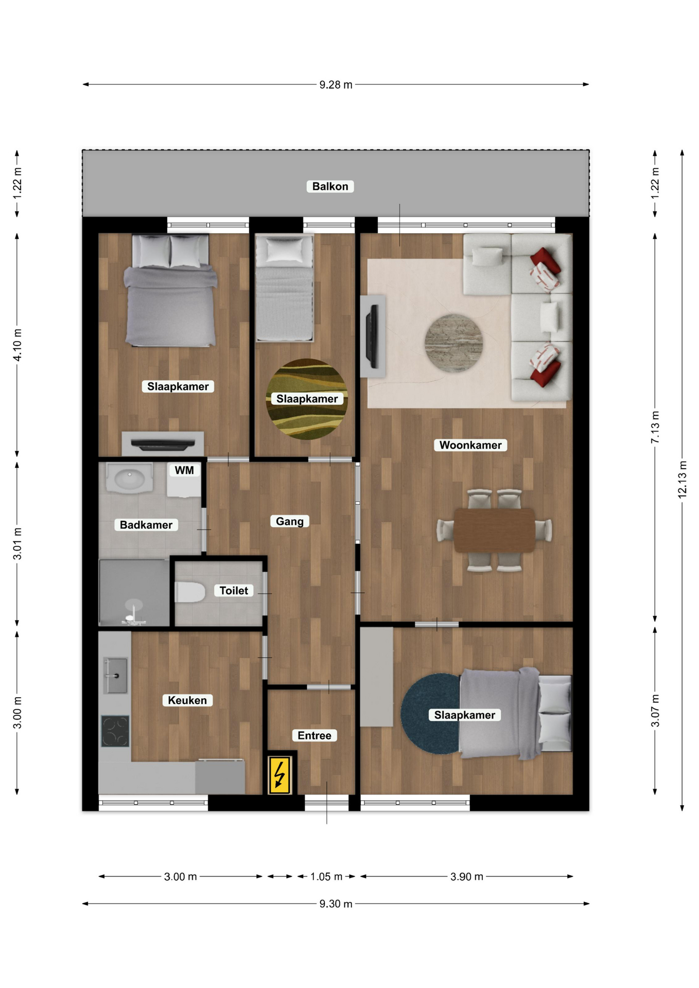 – Drie slaapkamers, waarvan één gerealiseerd in de woonkamer;