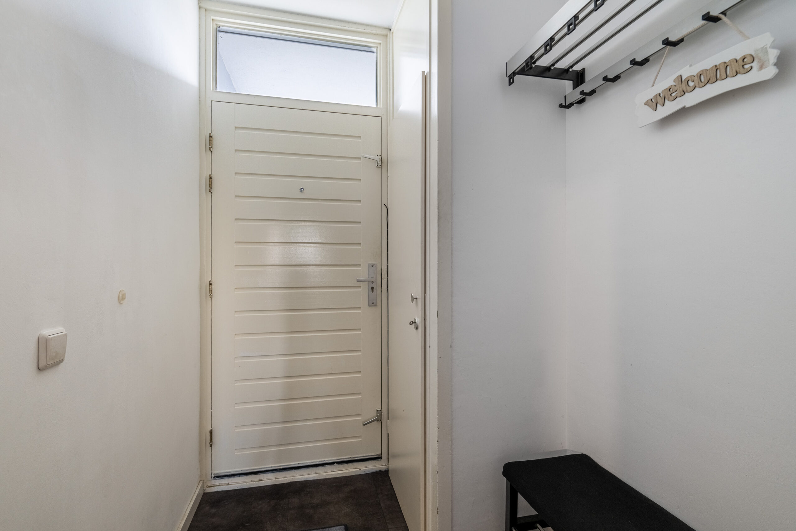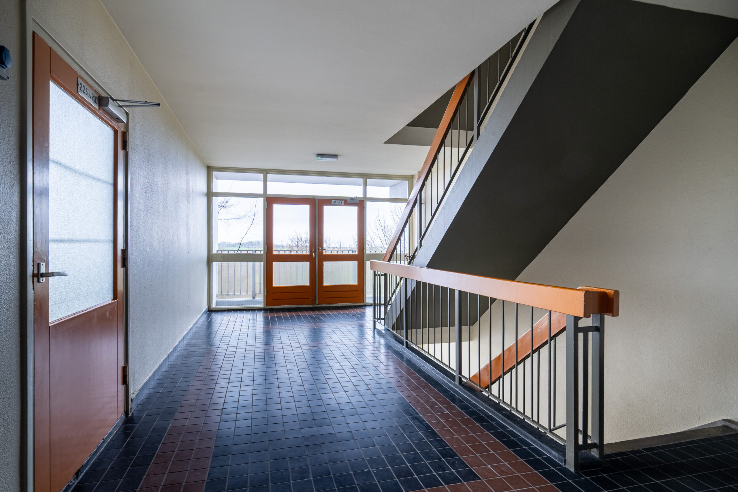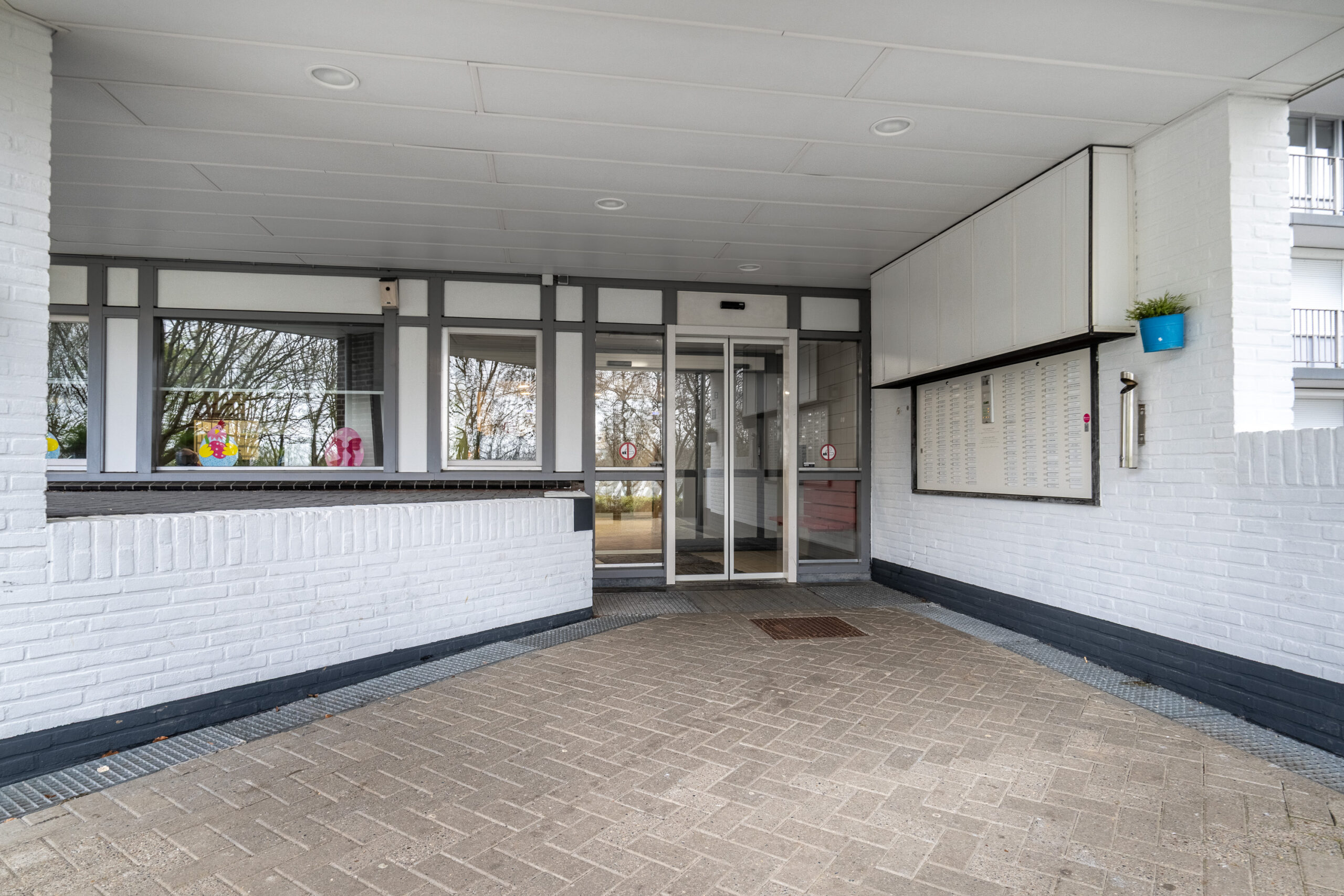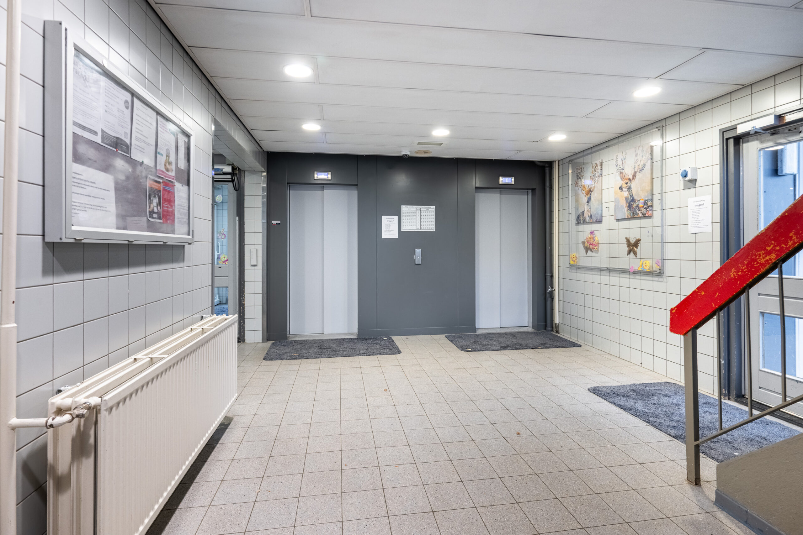 Overdekte entree met bellentableau, brievenbussen en toegang tot de nette ontvangsthal. Vanuit hier zijn middels trappenhuis en lift de verdiepingen bereikbaar.