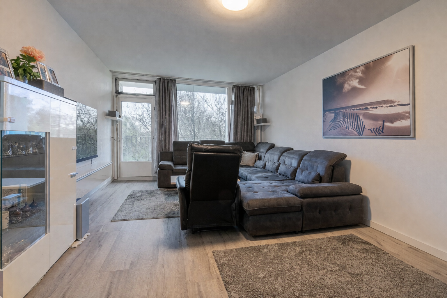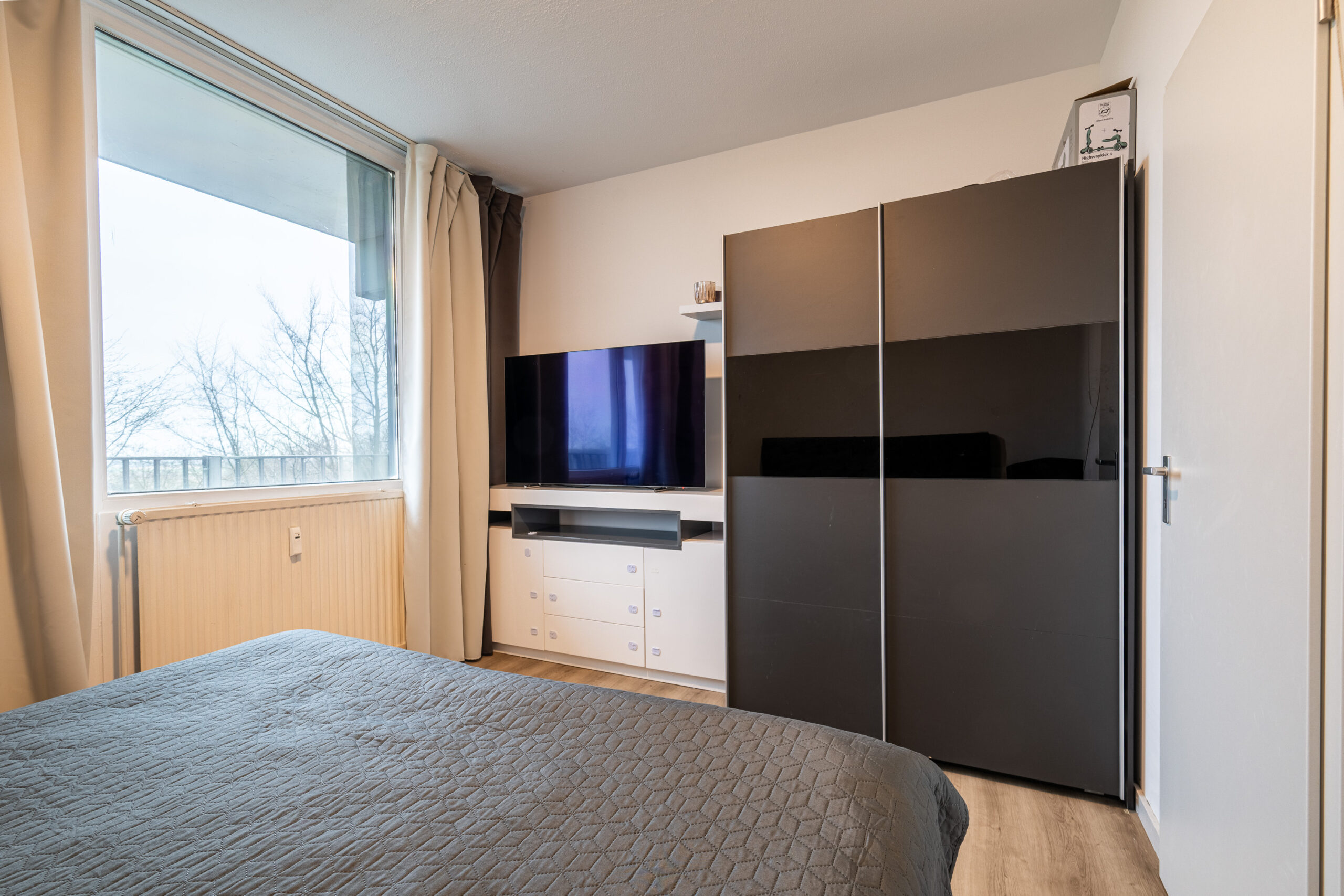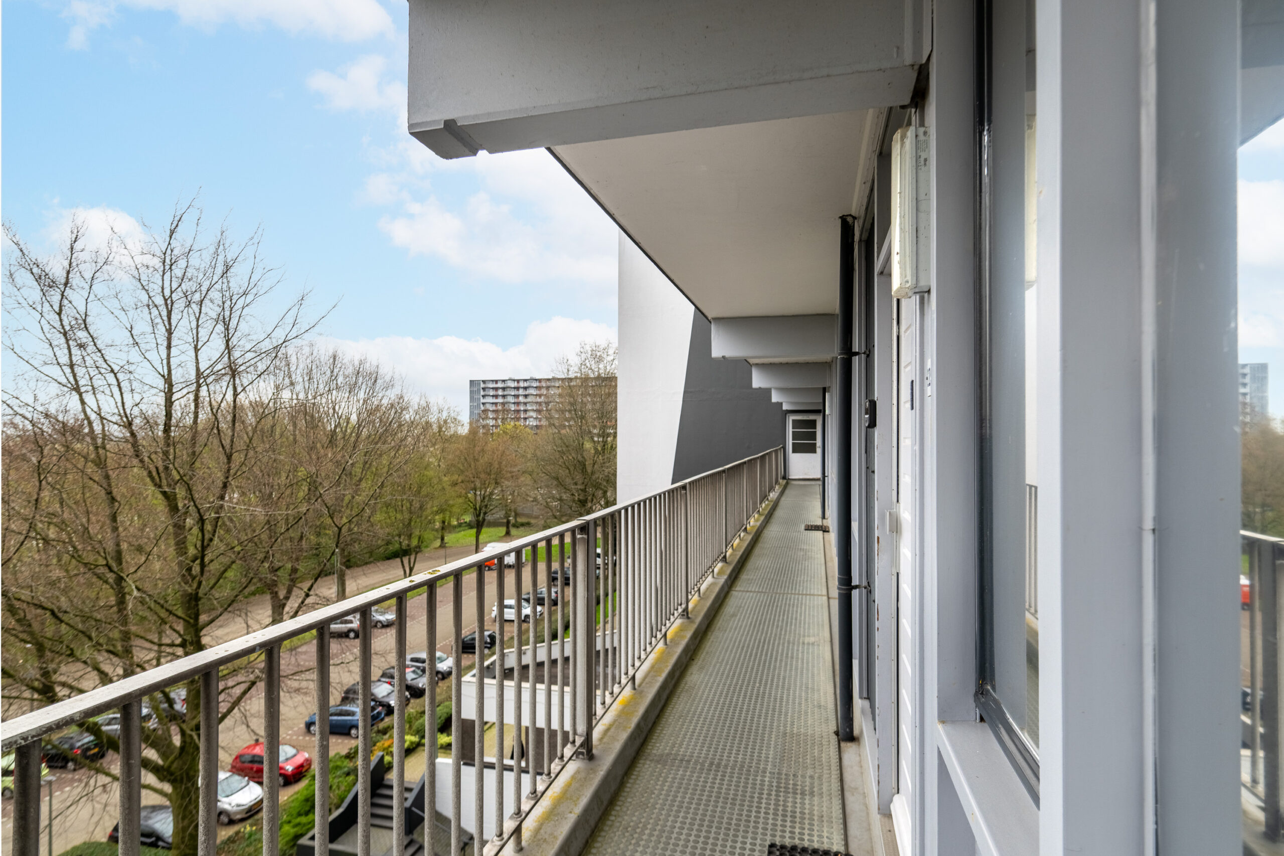 Via de galerij bereikt u de entree van het appartement. De hal is voorzien van een moderne groepenkast en garderobe en geeft toegang tot de centrale verdeelhal. De ruime woonkamer kenmerkt zich door een prettige lichtinval en een praktische indeling. Door het royale formaat hebben de huidige eigenaren een deel van de woonkamer afgescheiden, waardoor een extra (master) slaapkamer is gerealiseerd:
