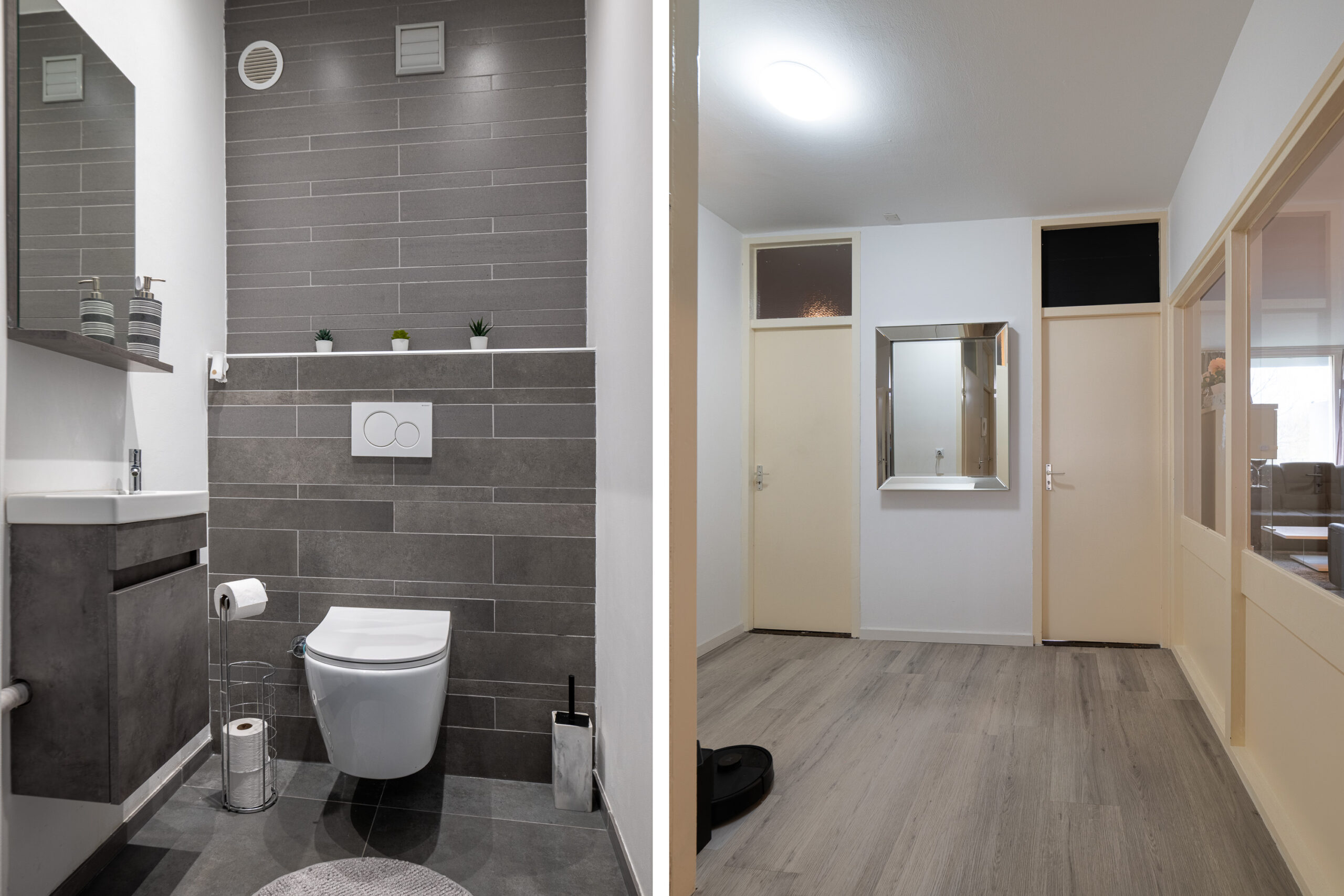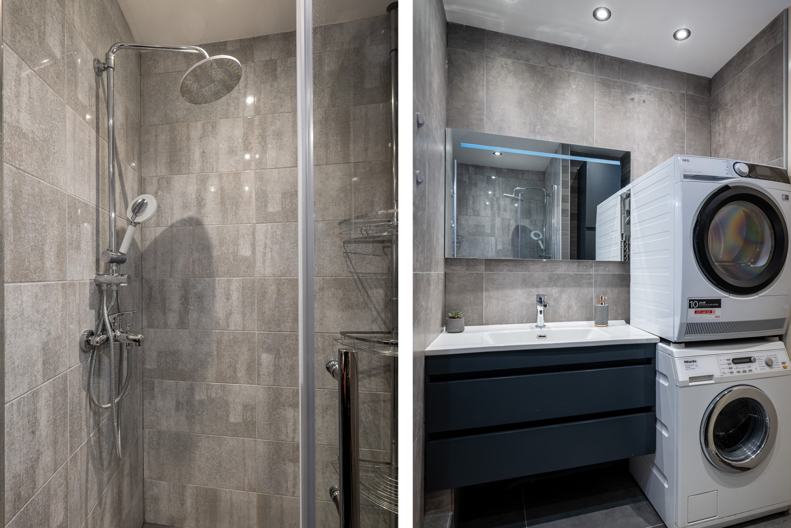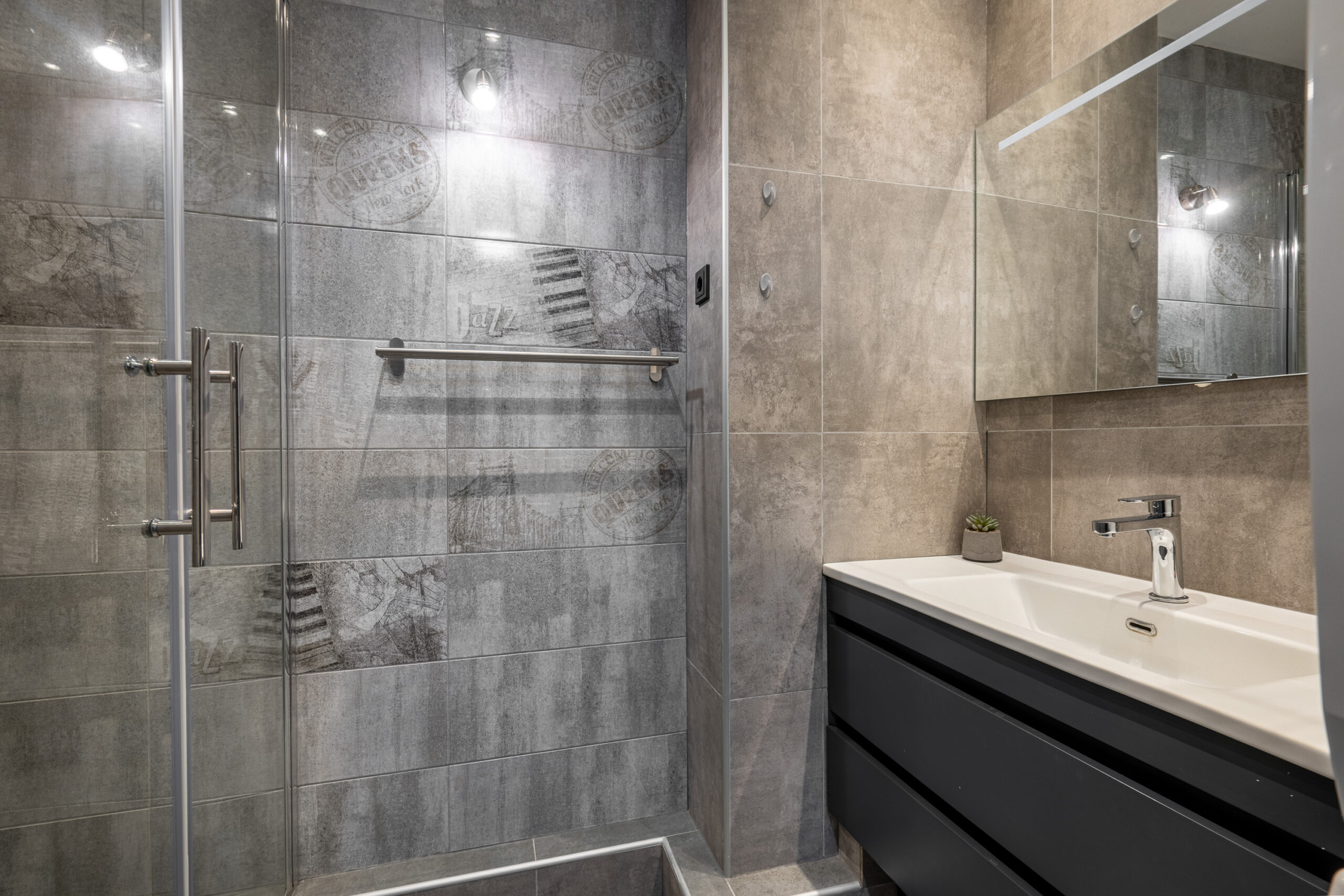 De eveneens in 2023 vernieuwde badkamer is modern en compleet uitgevoerd met een ruime inloop regendouche met glazen deuren, wastafel met meubel, extra bergruimte, witgoedaansluitingen, ventilatie en een verlaagd plafond met inbouwverlichting.