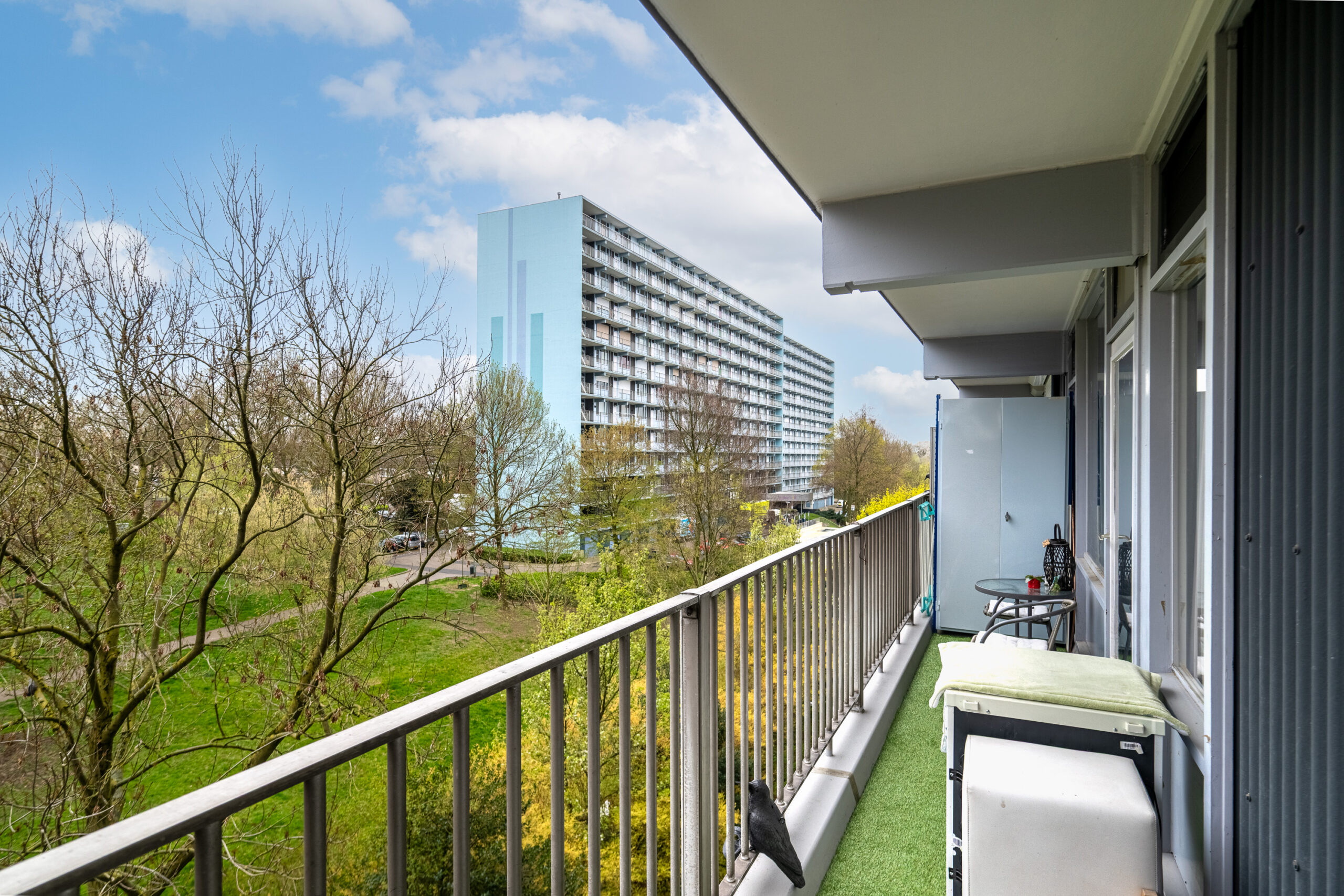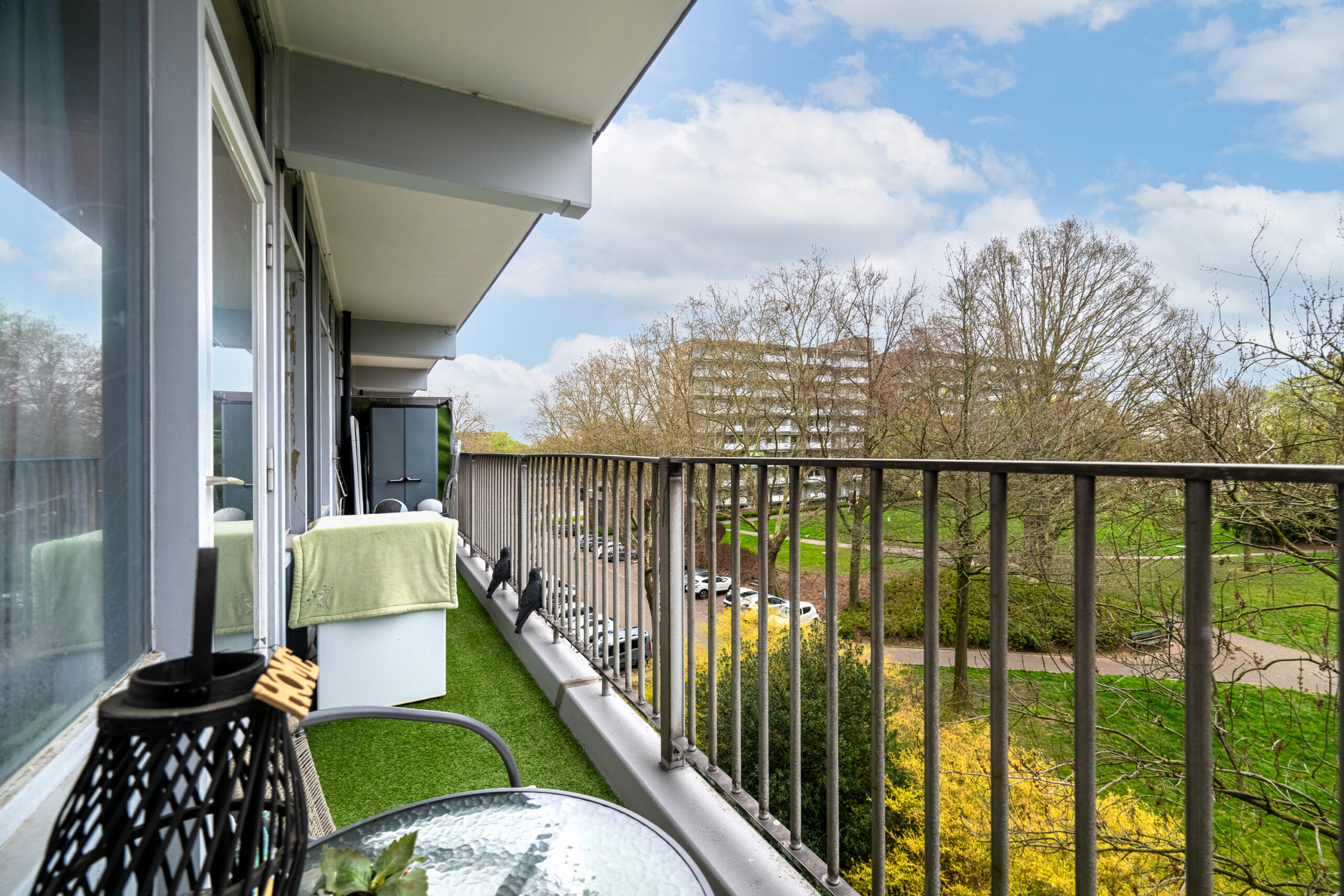 Het royale en zonnige balkon is bereikbaar vanuit zowel de woonkamer als de tweede slaapkamer en vormt een fijne plek om buiten te genieten.