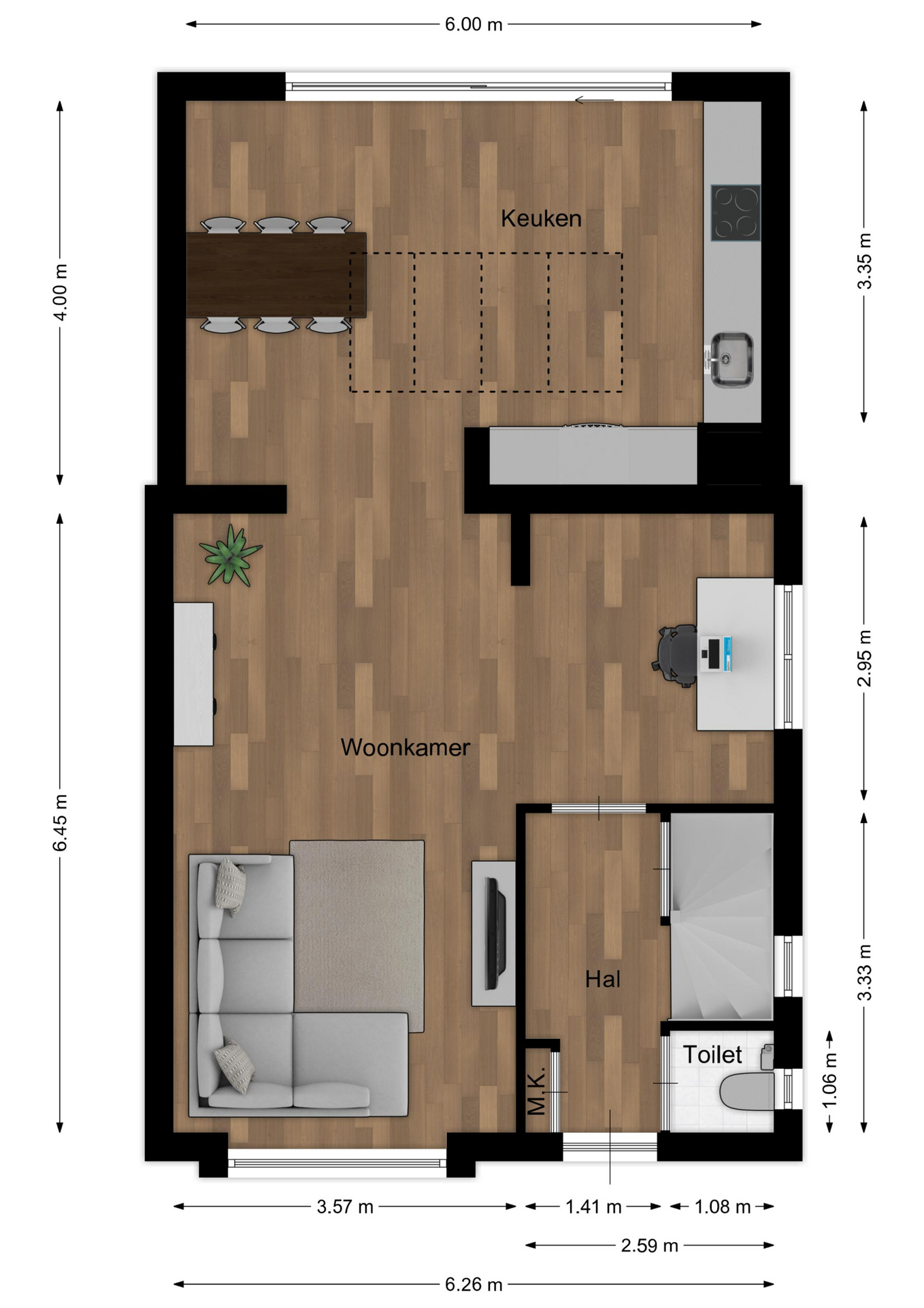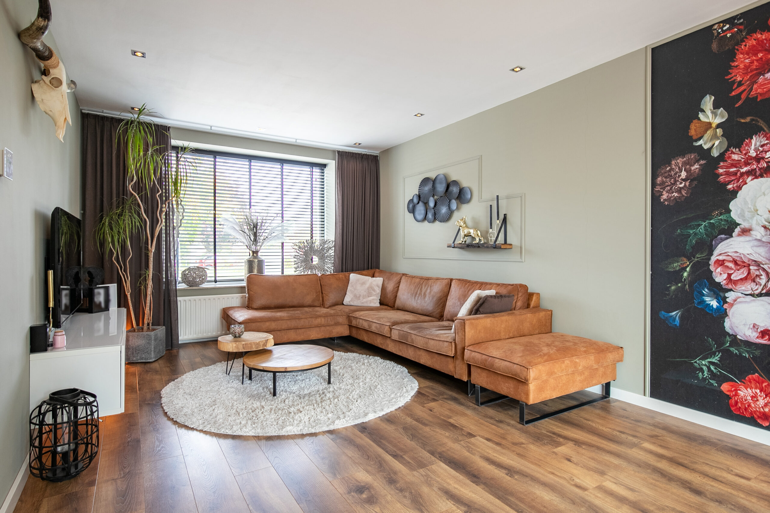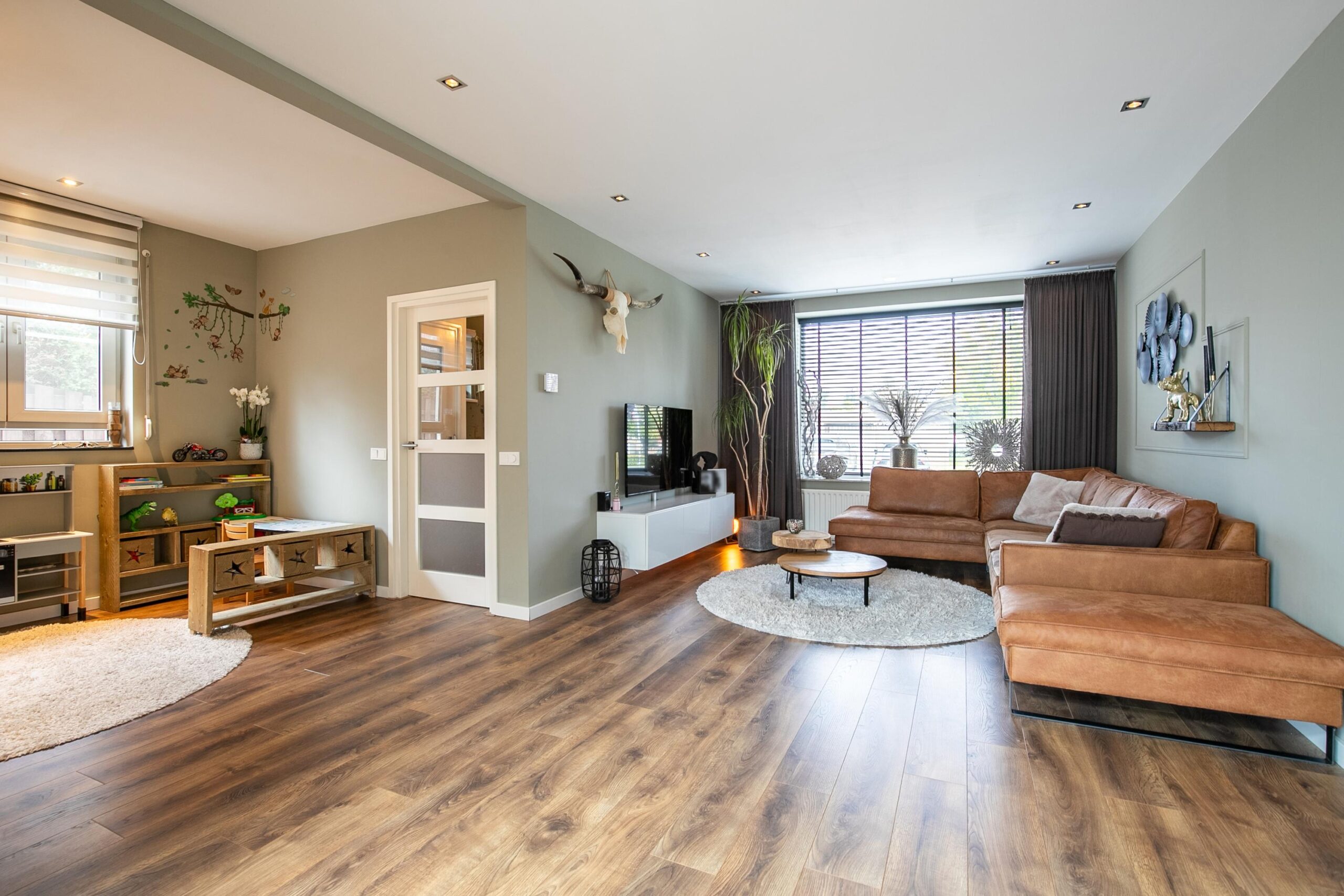 Hal met meterkast (11 groepen, 1 aardlekschakelaar) en modern toilet met wandcloset. L-vormige woonkamer (ca. 31.2m²) met bloemenkozijn en laminaatvloer. In de aanbouw gerealiseerde keuken (ca. 24m²) met moderne aanrechtcombinatie voorzien van de volgende apparatuur: Quooker, inductie kookplaat, combimagnetron, stoomoven, vaatwasser, hoge koelkast, hoge vriezer, spoelbak en afzuigkap. Tevens is in de keuken veel lichtinval vanwege de lichtstraat en de schuifpui naar de achtertuin. Geheel omsloten, op het oosten georiënteerde achtertuin. Op het achterste gedeelte van de tuin is een houten tuinberging (ca. 11m²) met een ruime overkapping (ca. 17m²).