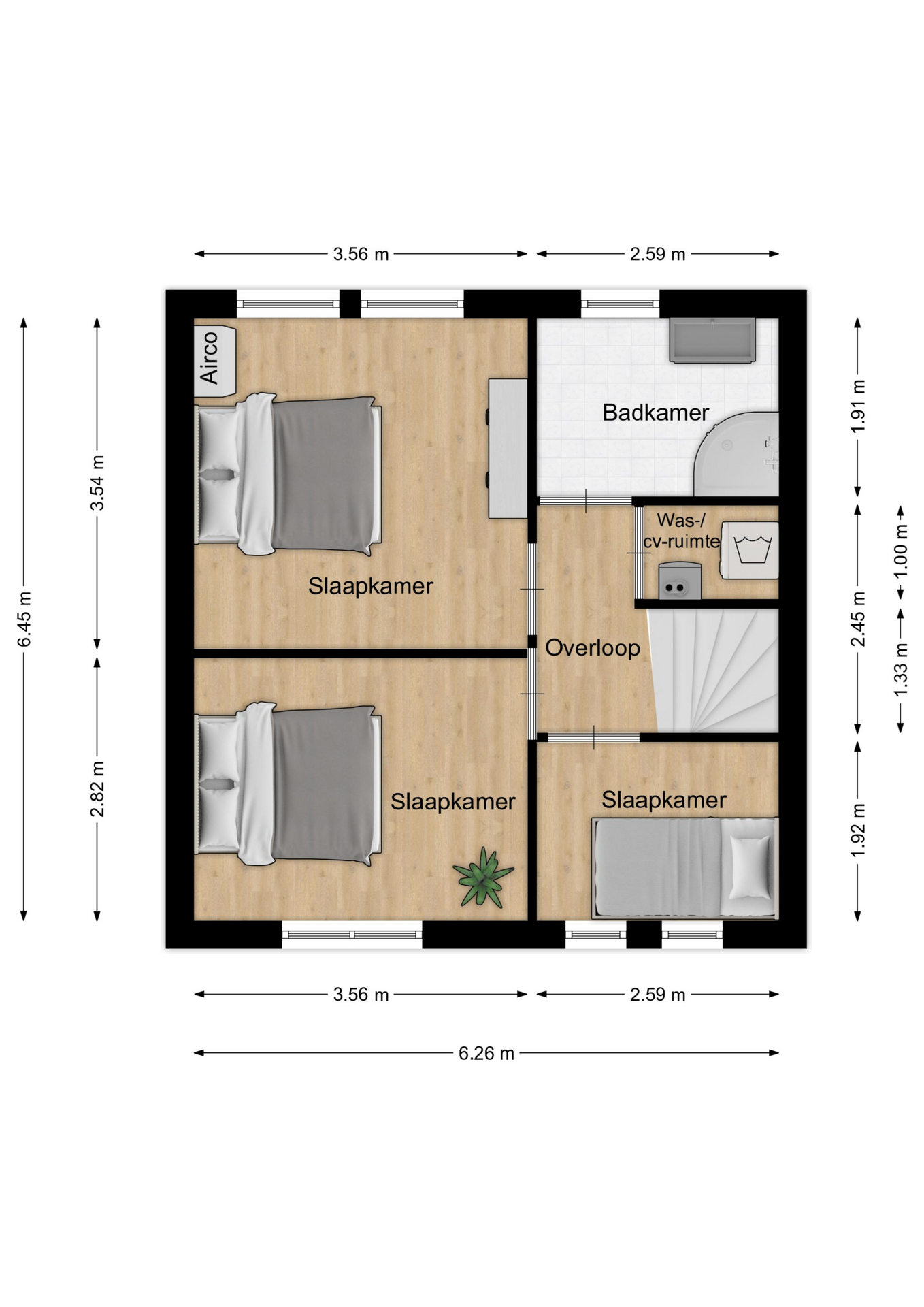 Overloop. Drie slaapkamers (resp. ca. 12.6 m², 10m² en 4.9m²), allen voorzien van laminaatvloeren. Op de grootste slaapkamer is een airco geplaatst. Badkamer (ca. 5m²) met badkachel, douche en badmeubel met wastafel. Verder is op deze verdieping de was/cv ruimte met witgoedaansluitingen en opstelling CV-Combiketel (merk Remeha Avanta, bouwjaar 2015, eigendom).