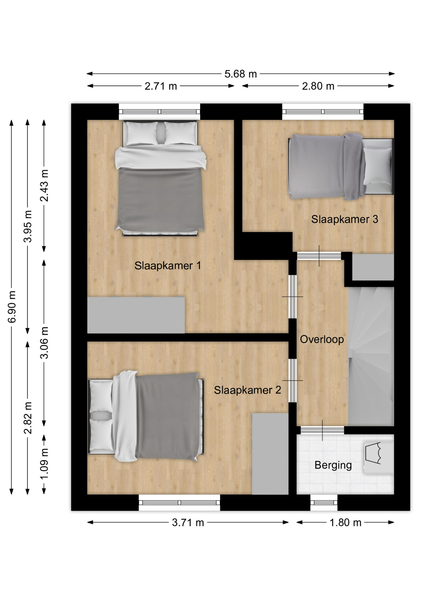 Via de overloop zijn drie slaapkamers en de badkamer bereikbaar. Aan de voorzijde ligt een slaapkamer van circa 11 m² en een kleine berging met de aansluiting voor het witgoed. Aan de achterzijde bevinden zich twee slaapkamers van circa 12 m² en 7 m². Via een mangat is de bergzolder bereikbaar (Nokhoogte: 1,33 m) waar de cv-installatie is geplaatst.