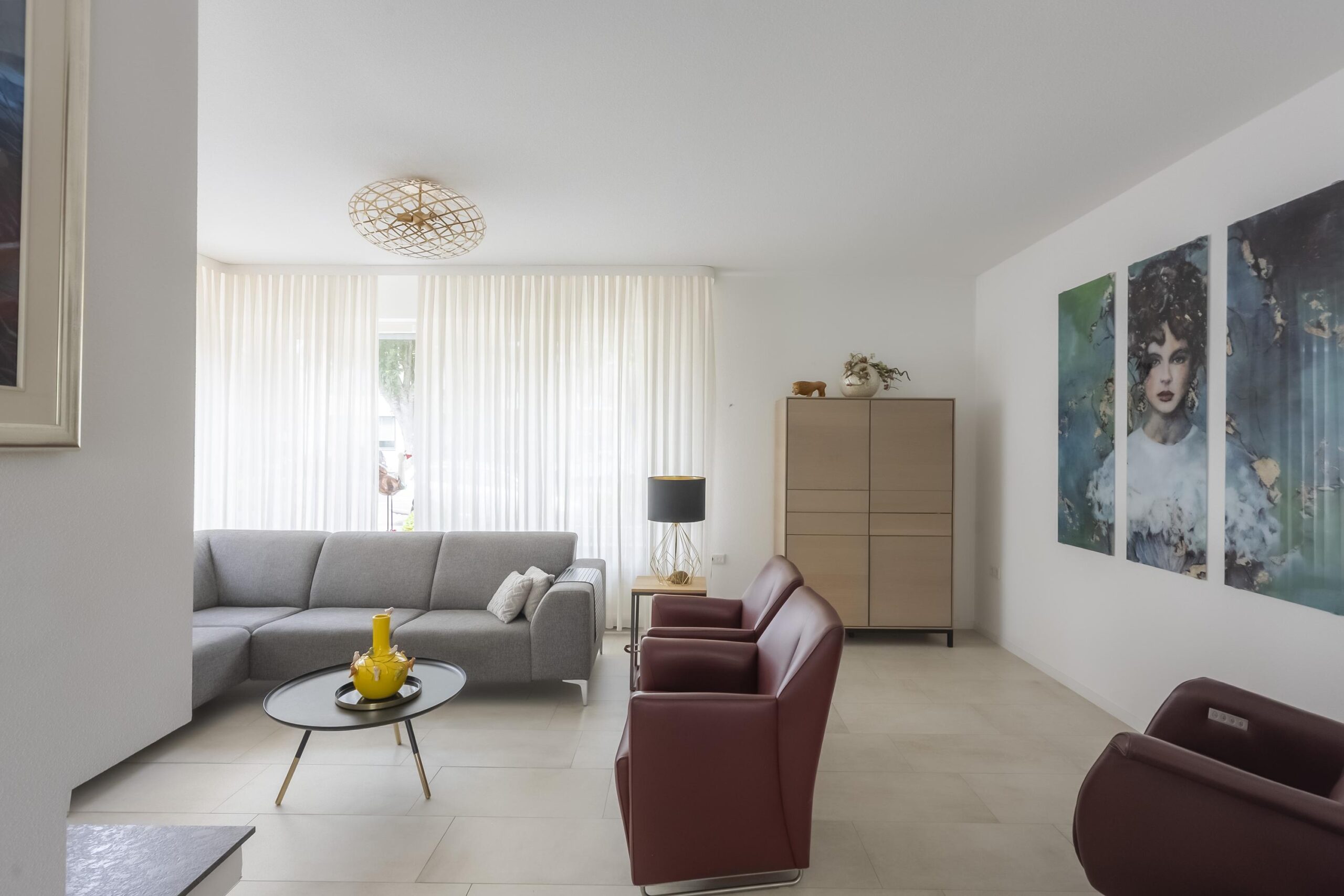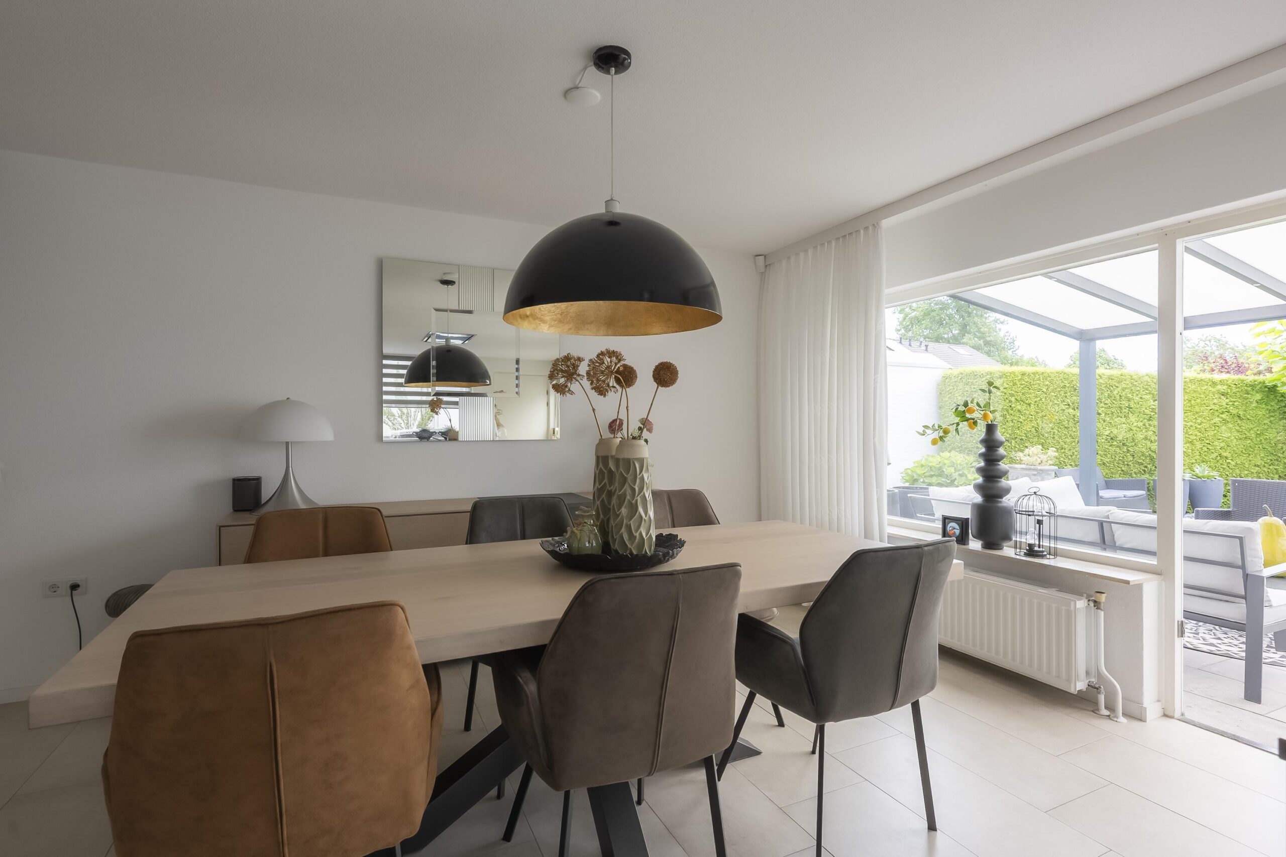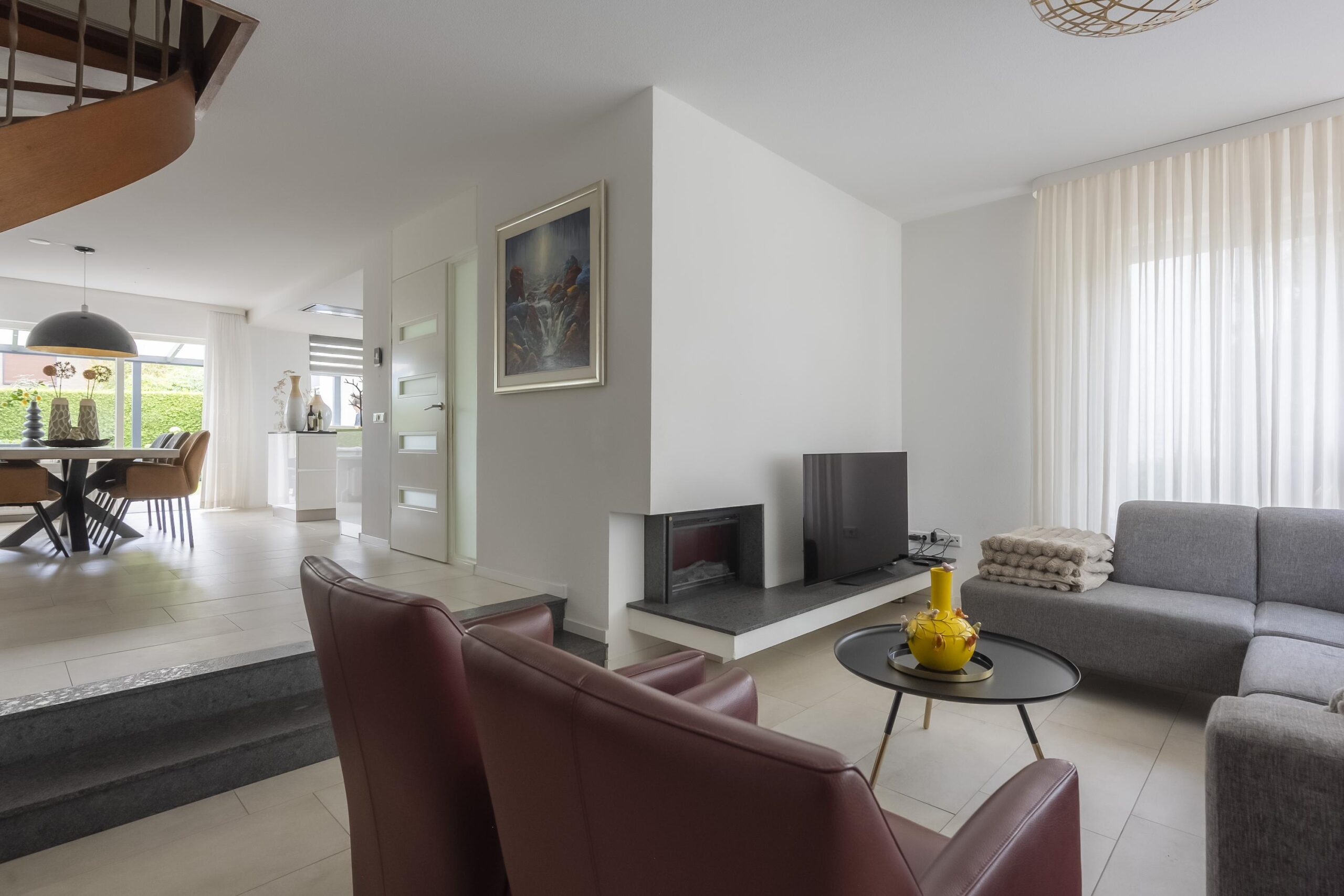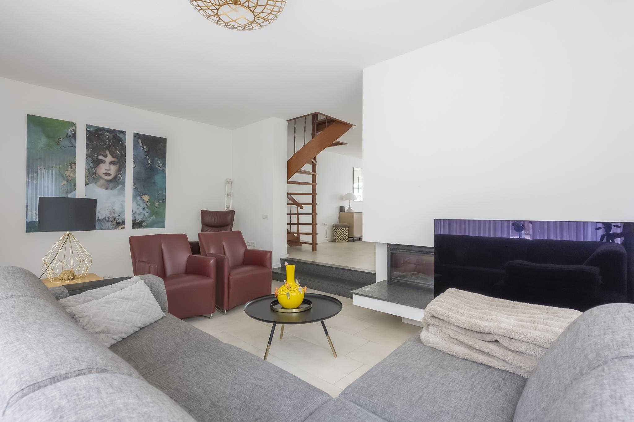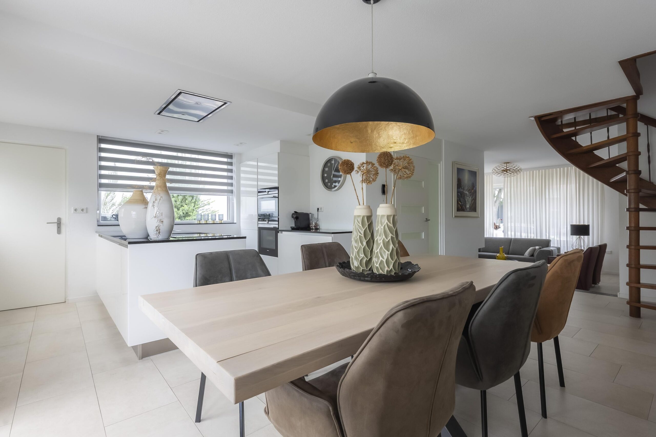 De sfeervolle zit-/tv-kamer aan de voorzijde heeft een gezellige open haard en is afgewerkt met graniet wat een luxe uitstraling geeft. De ruime leefkeuken, vernieuwd in 2018, vormt samen met de eetkamer een open en lichte ruimte. De keukeninstallatie is voorzien van hoogglans witte kasten, granieten werkblad en hoogwaardige “Siemens” inbouwapparatuur zoals een 5-pits inductiekookplaat, vaatwasser, oven, combimagnetron, koelkast en vriezer. De gehele parterre is voorzien van een moderne lichte tegelvloer met vloerverwarming. Te midden van de woonkamer bereikt men via een fraaie hardhouten wenteltrap de eerste verdieping.