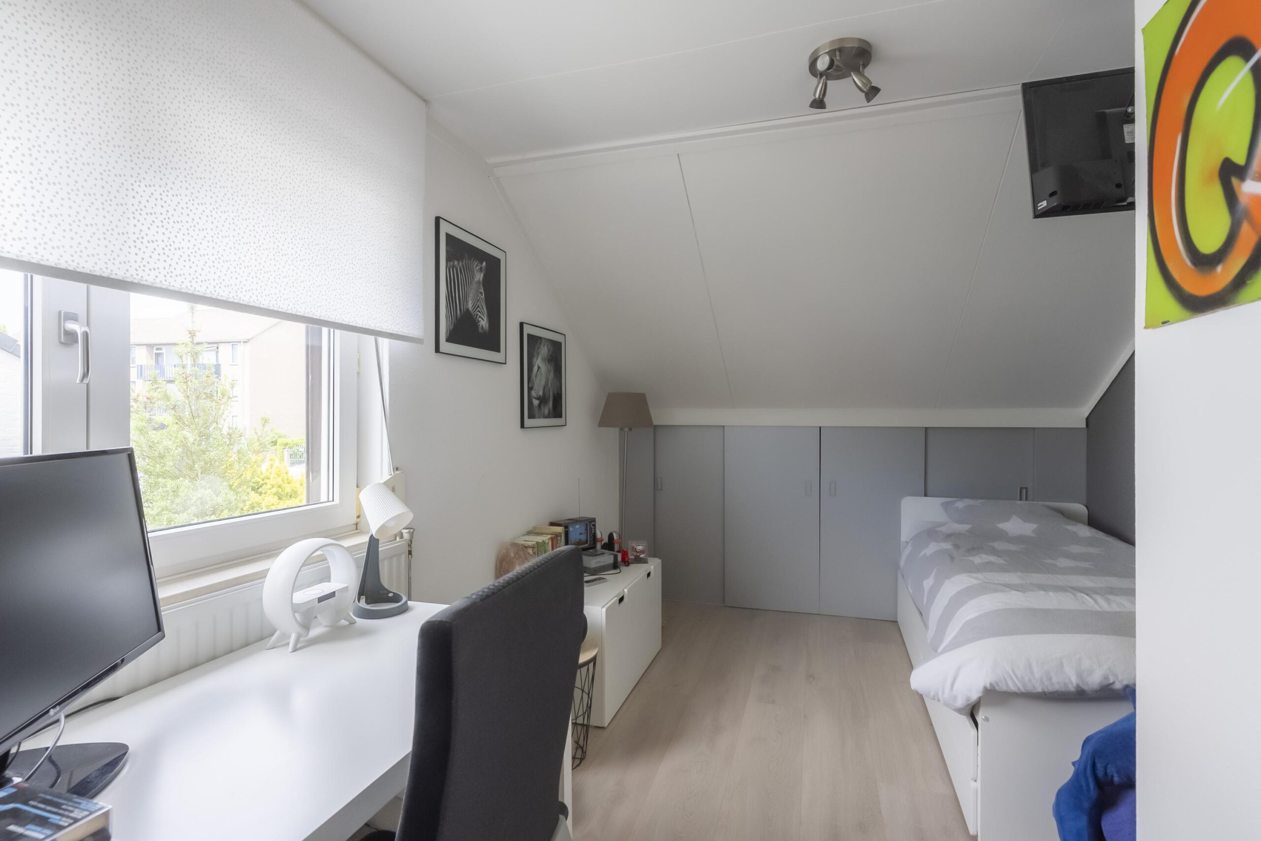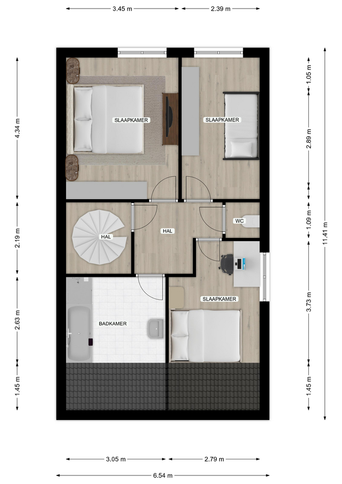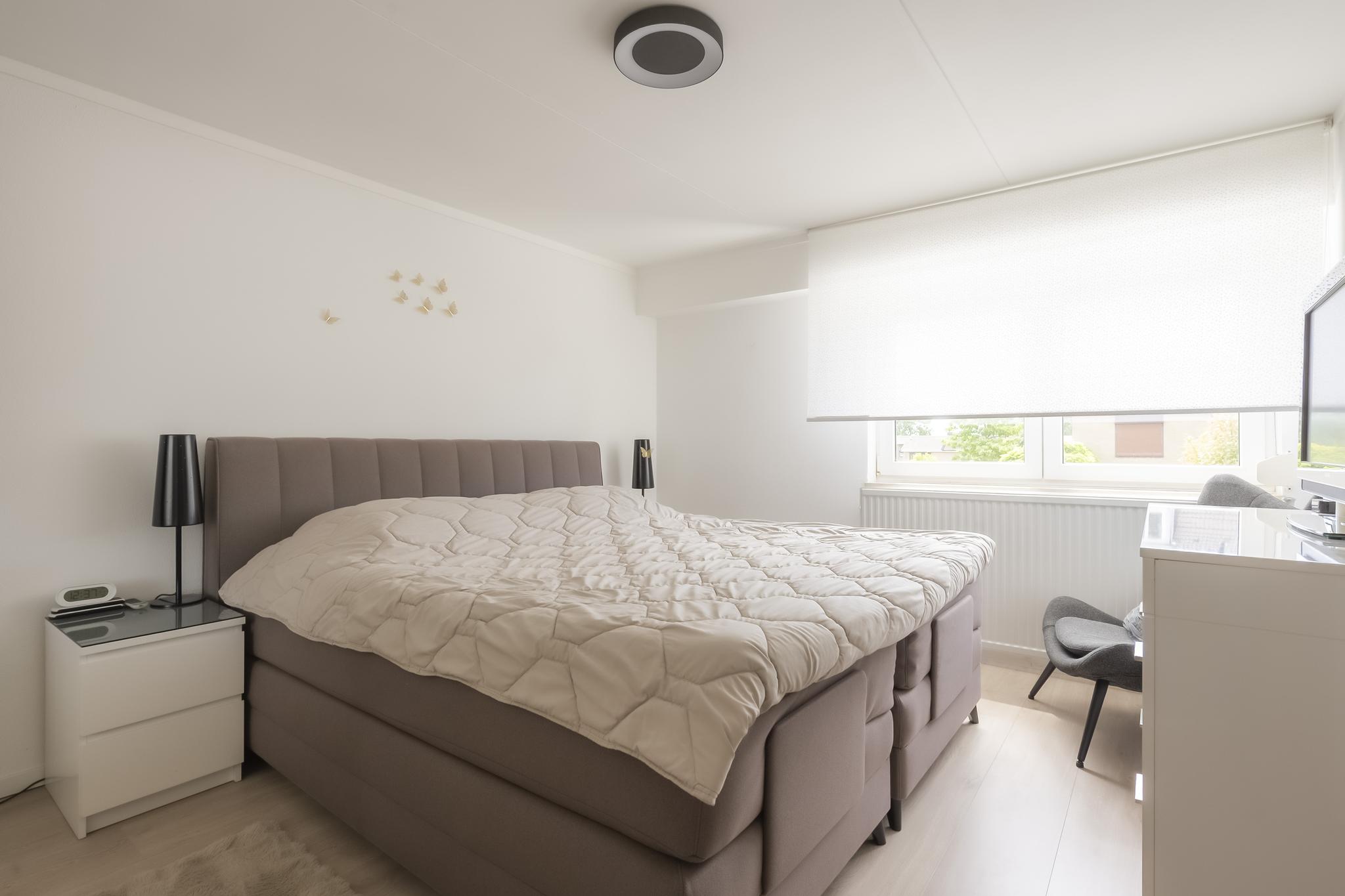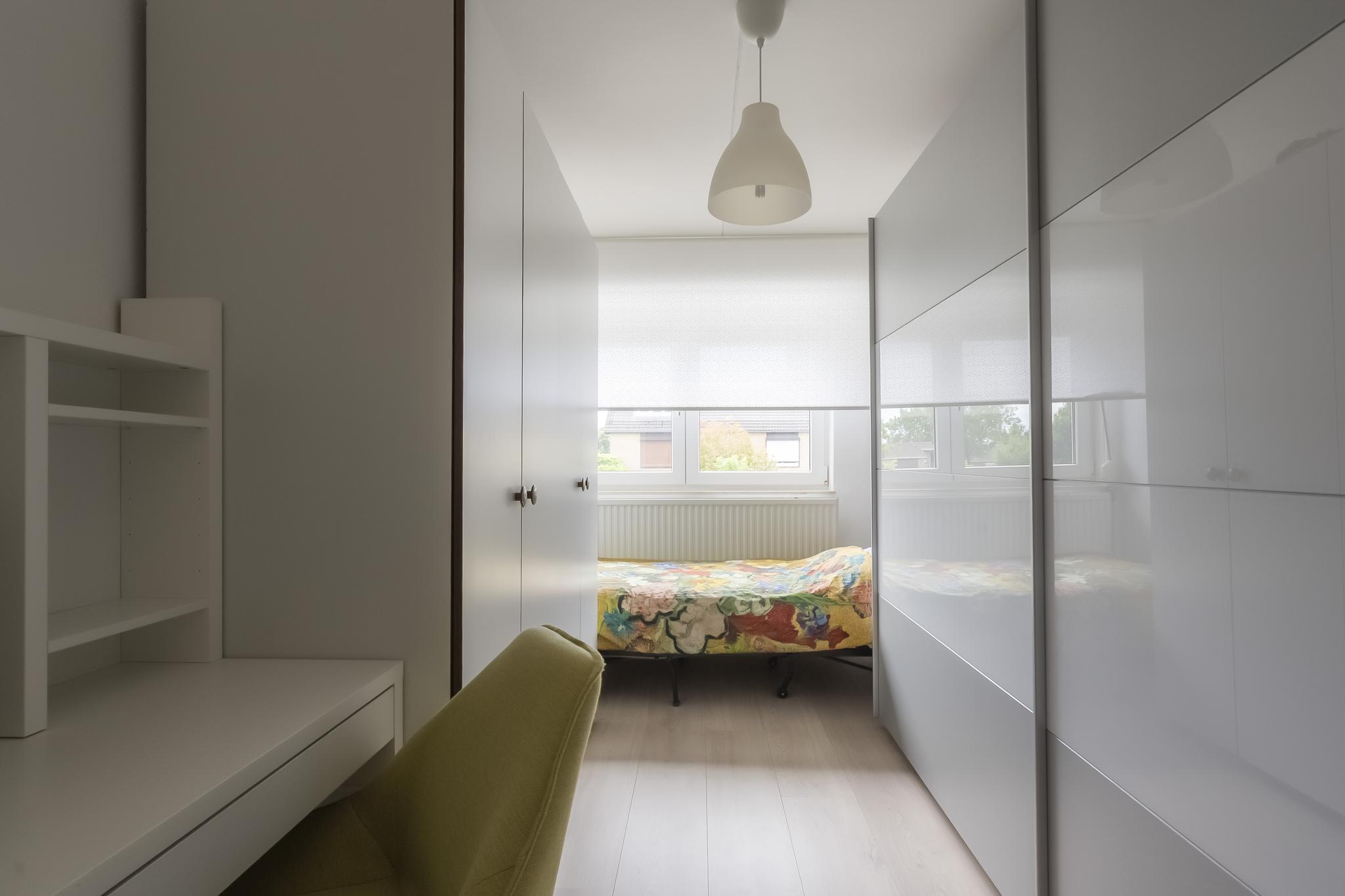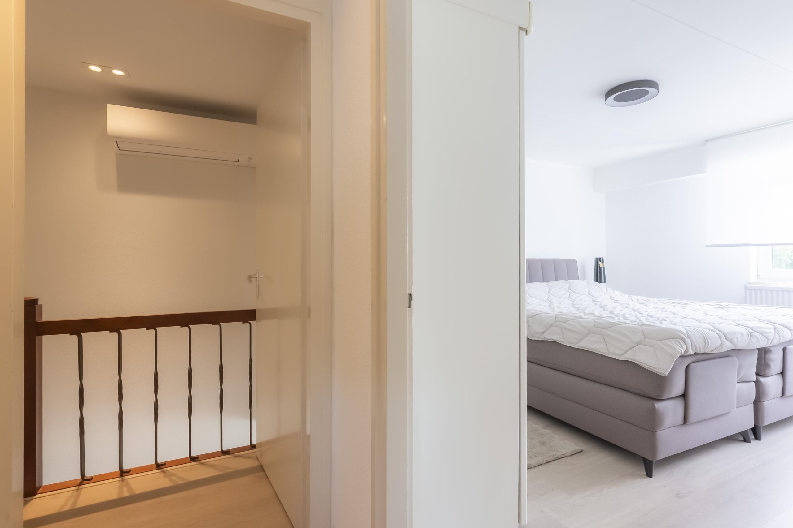 De overloop is uitgerust met airco en biedt toegang tot drie ruime slaapkamers, allen voorzien van moderne laminaatvloeren, rolluiken en strakke wandafwerking. De slaapkamers zijn respectievelijk groot: