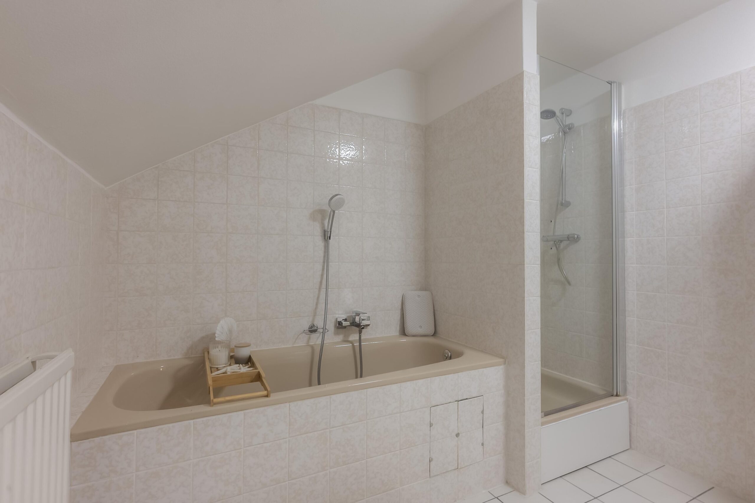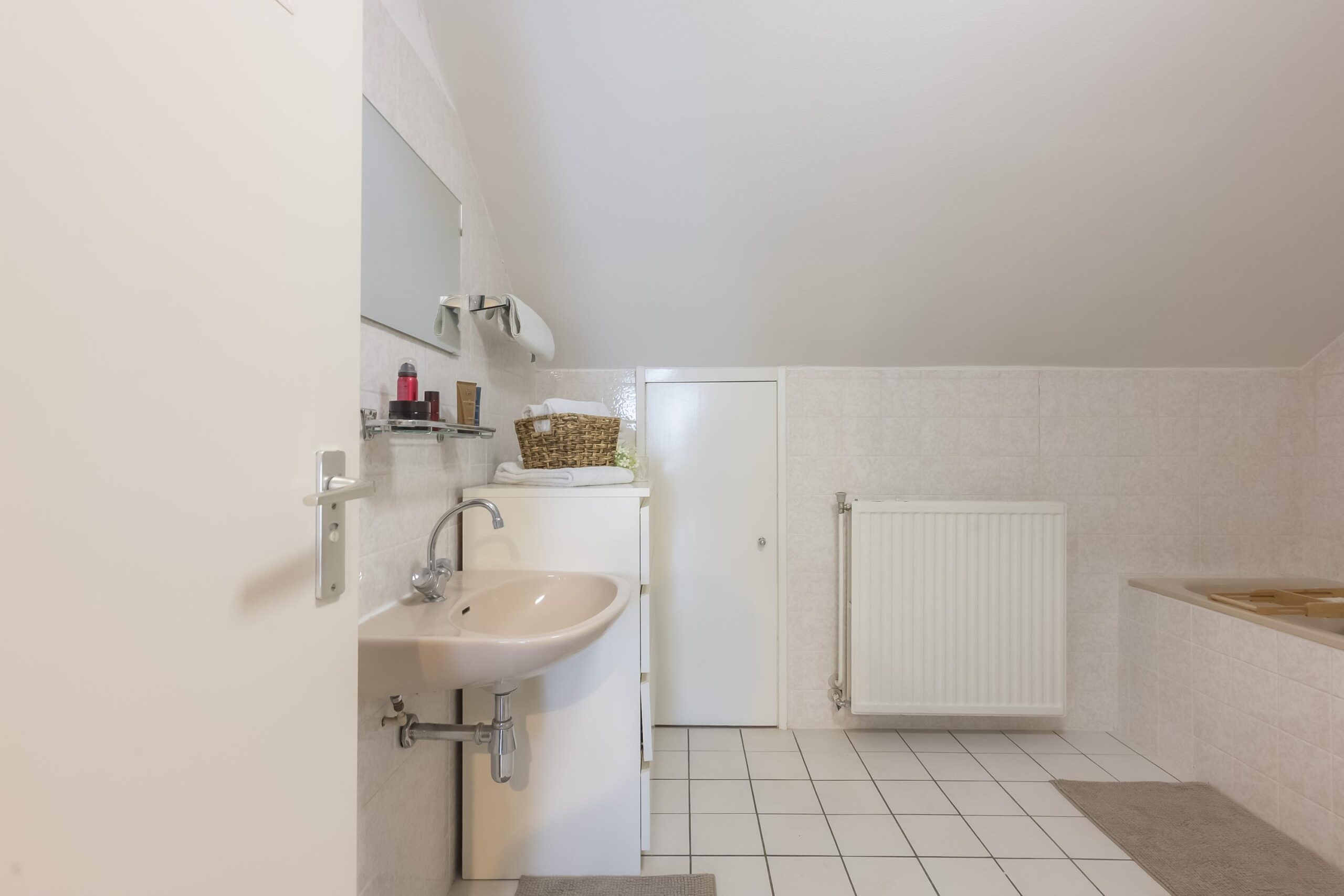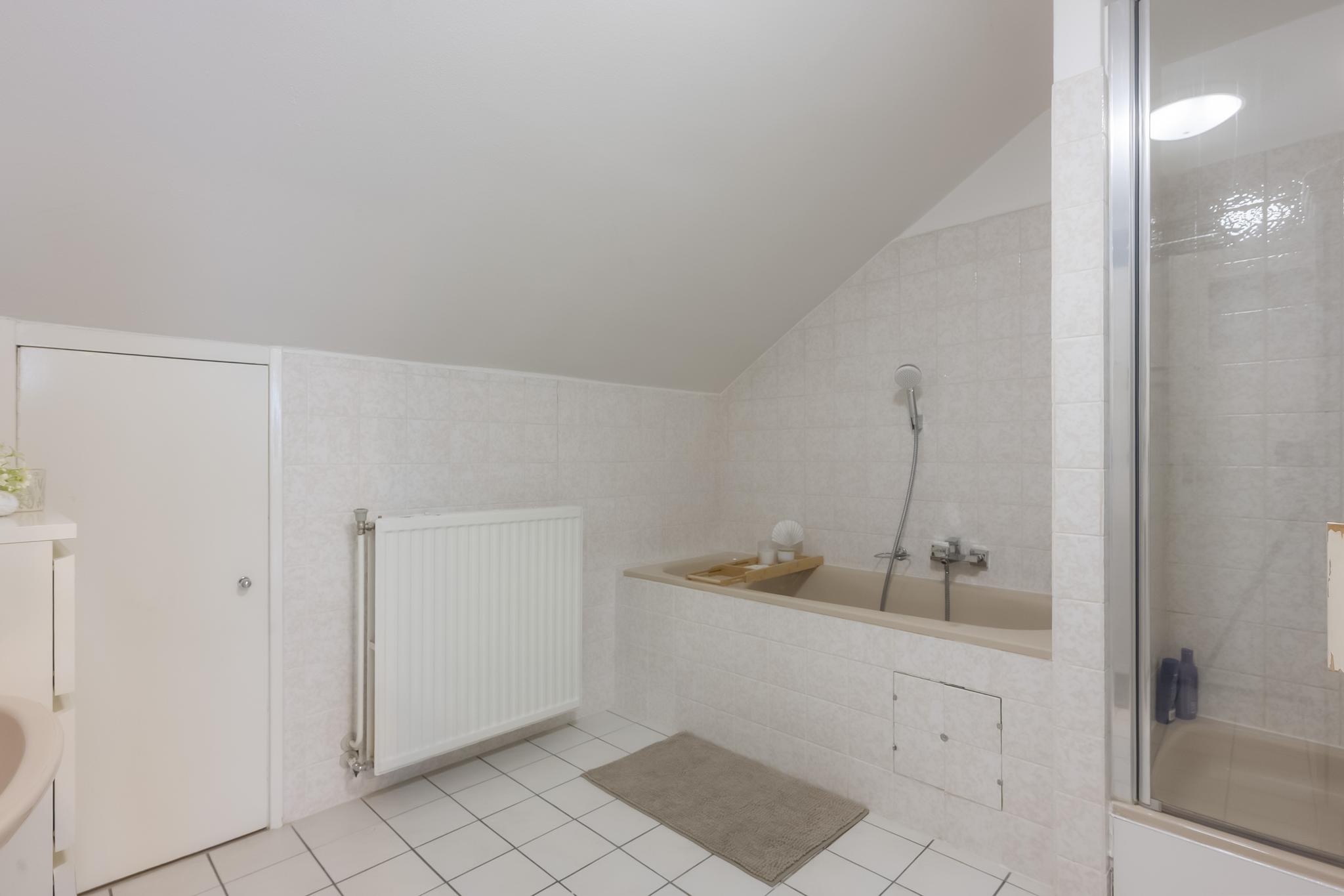 De badkamer 3.05 x 2.63 is geheel betegeld en beschikt over een ligbad, aparte douche, wastafel, verwarming en mechanische ventilatie. Op de overloop heeft men ook nog een separaat tweede toilet met fonteintje.