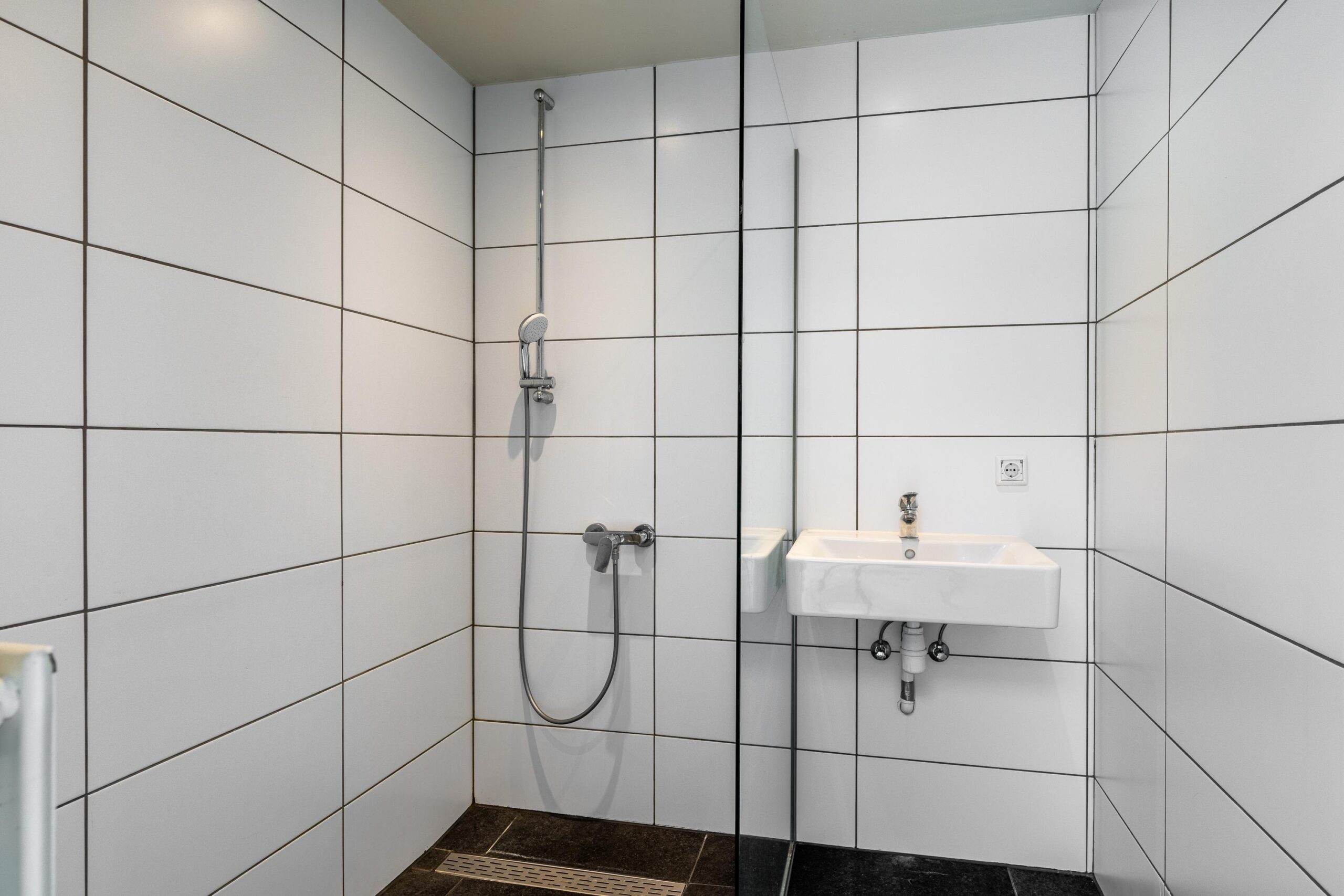 De geheel betegelde badkamer is groot ca. 4 m² en is voorzien van een douche en een vaste wastafel.
