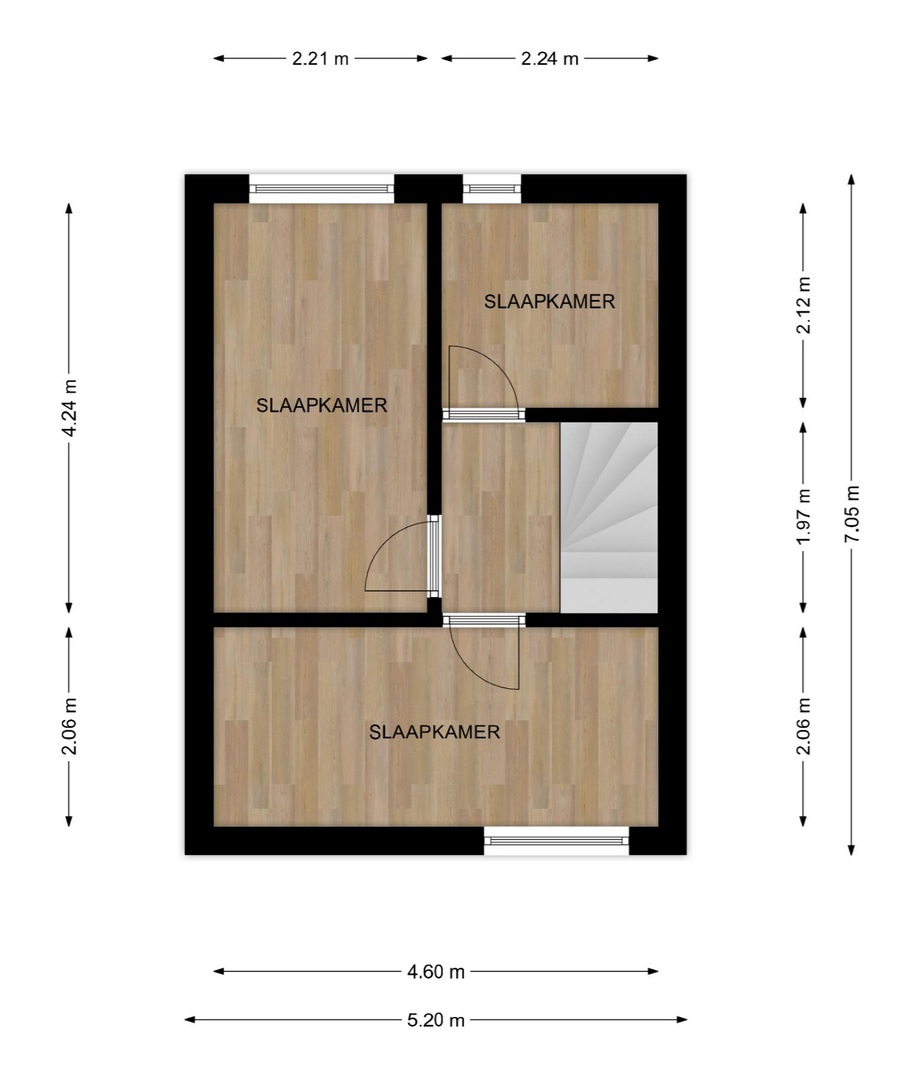 De slaapkamers zijn respectievelijk groot ca. 10 m², 9 m² en 5 m² en zijn alle voorzien van een laminaatvloer.