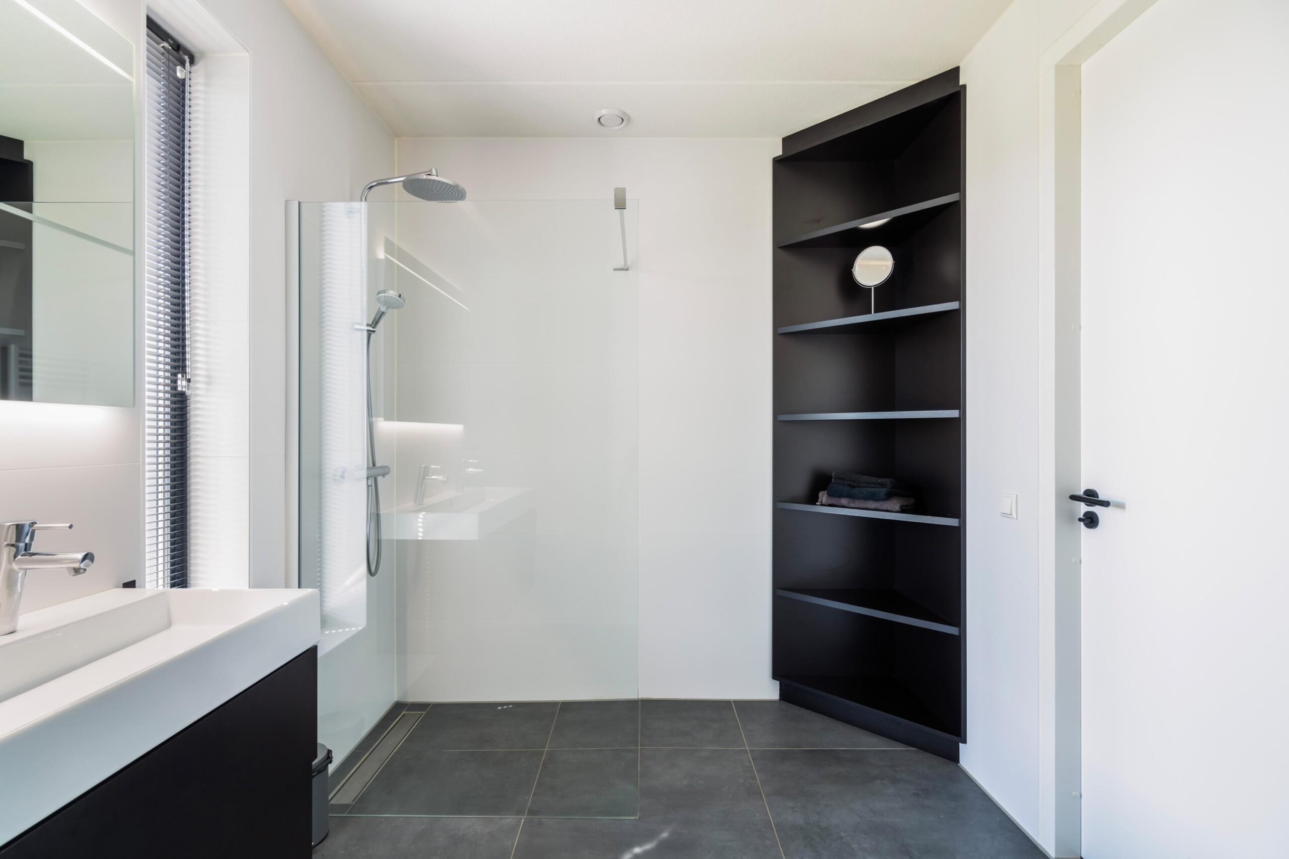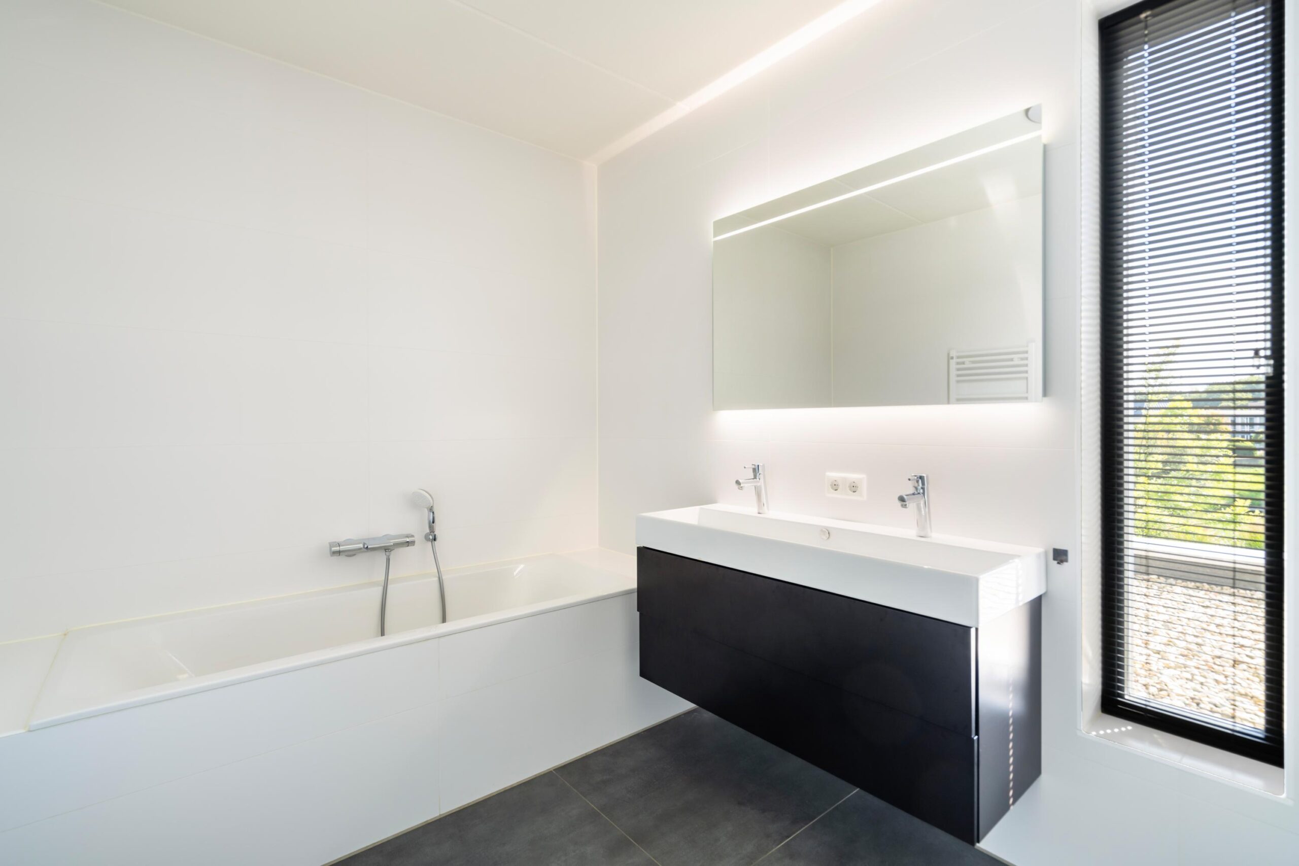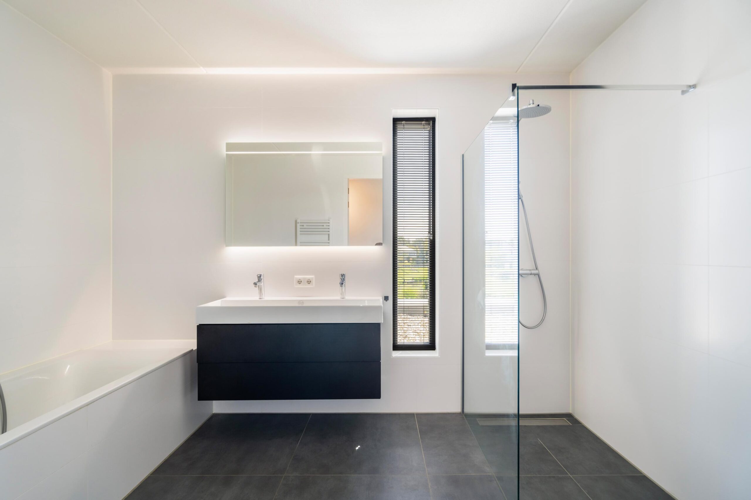 - Badkamervoorzieningen Ligbad, dubbele wastafel, wastafelmeubel, inloopdouche, vloerverwarming