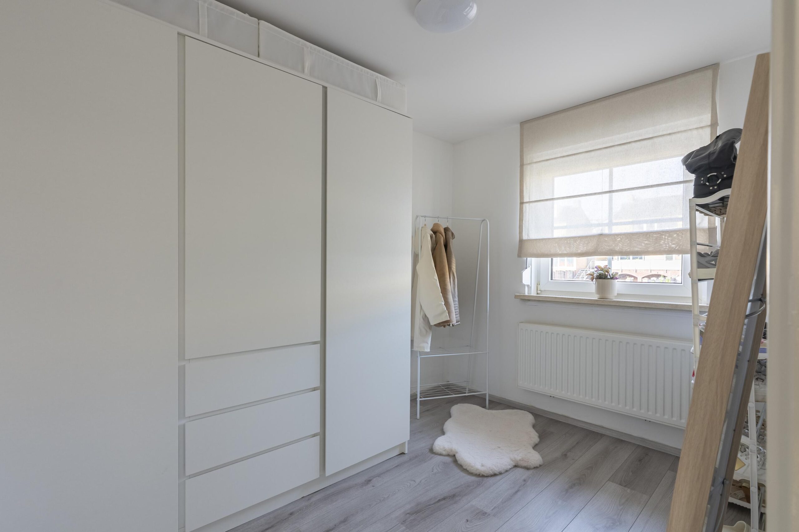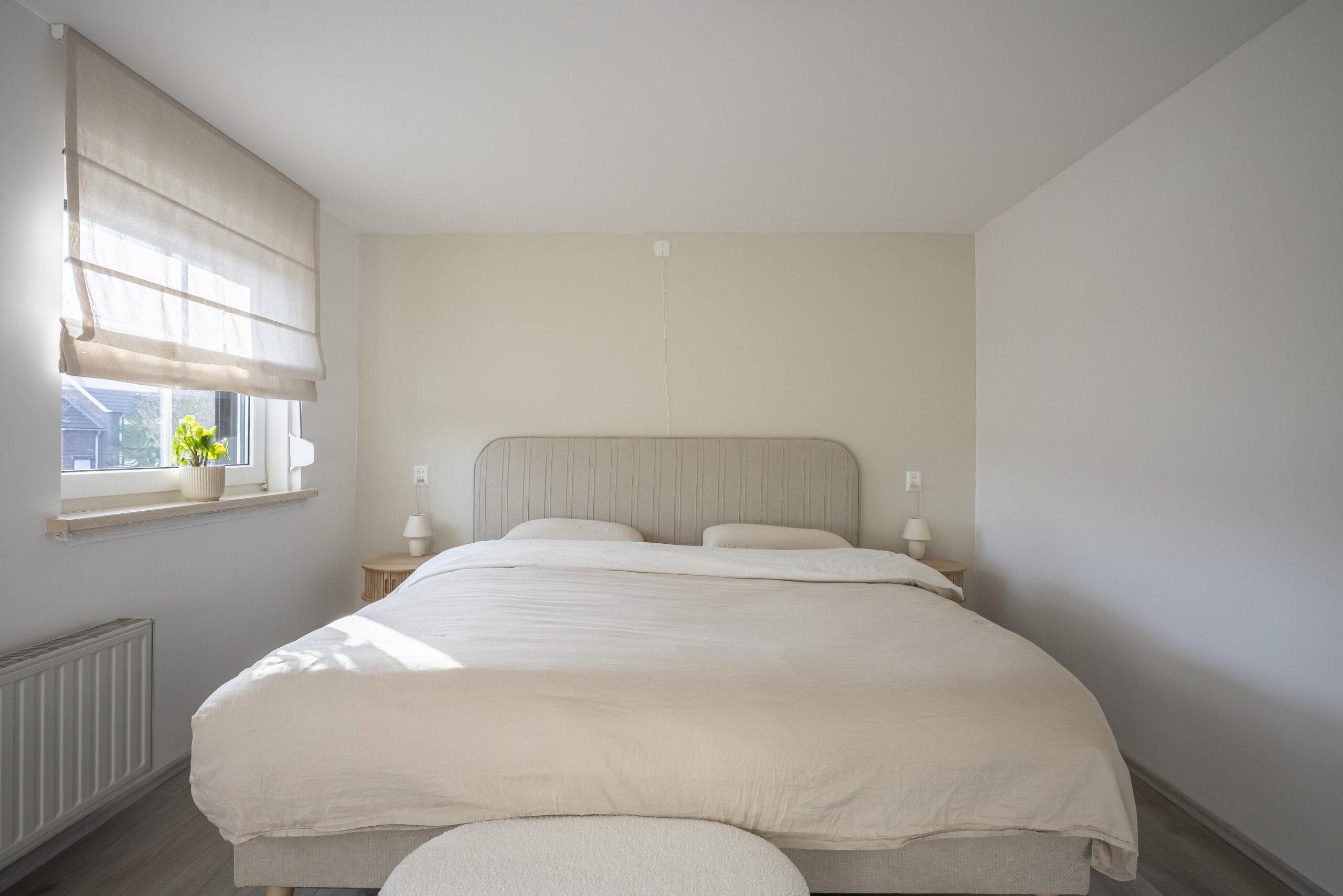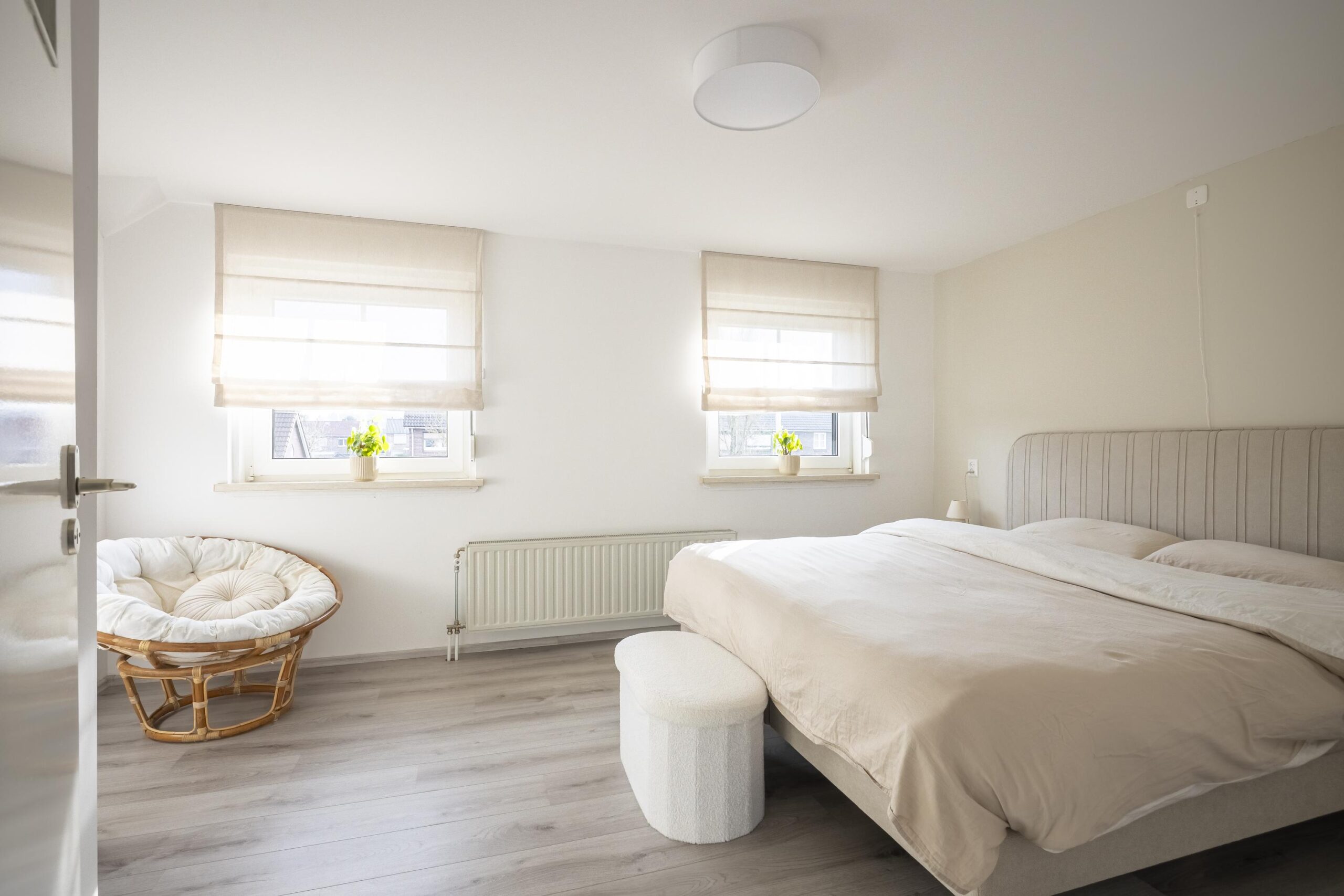Overloop met toegang tot drie moderne en goed afgewerkte slaapkamers. De vloeren zijn voorzien van een lichte laminaatvloer en de wanden zijn strak gestuct. De slaapkamers zijn respectievelijk groot: