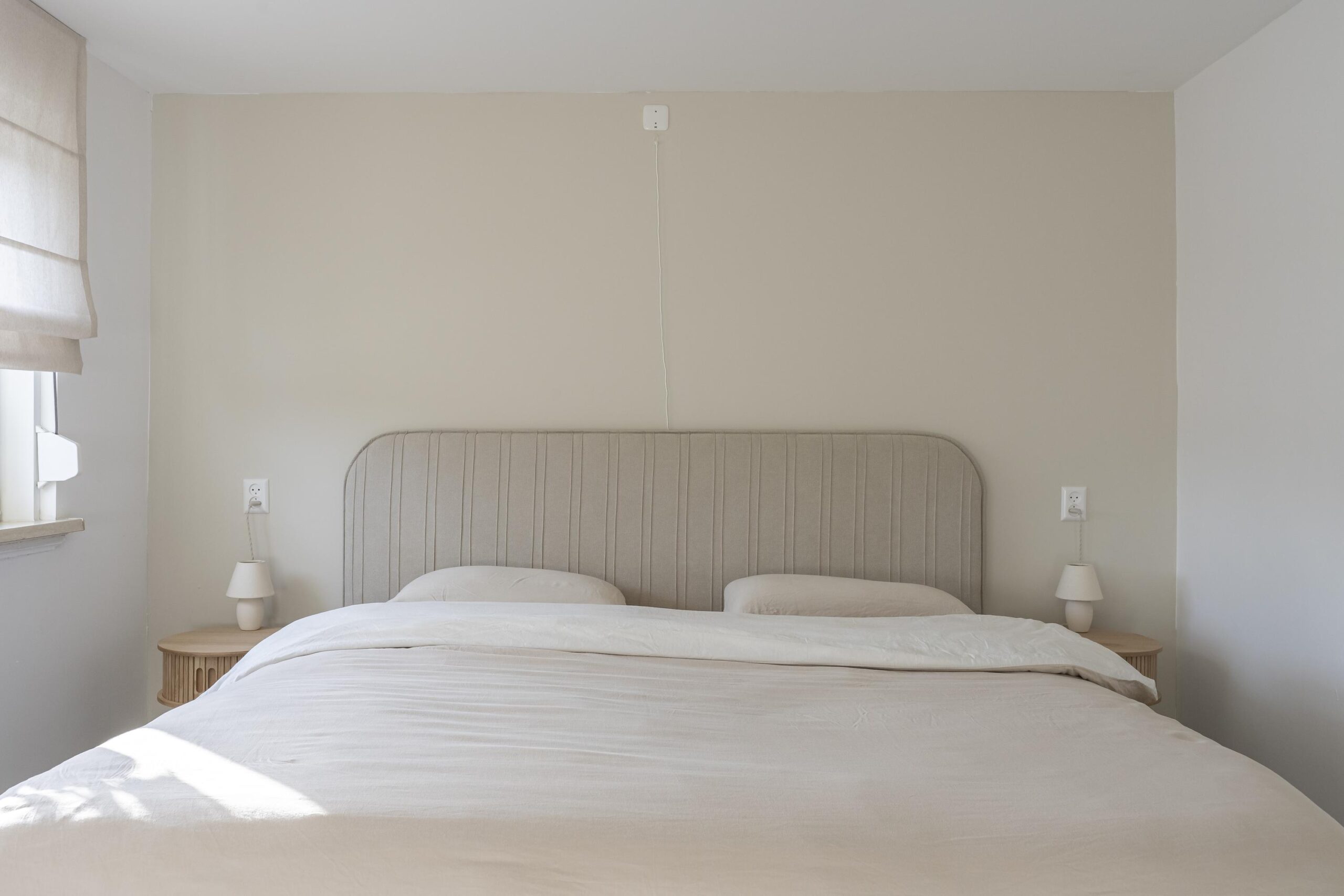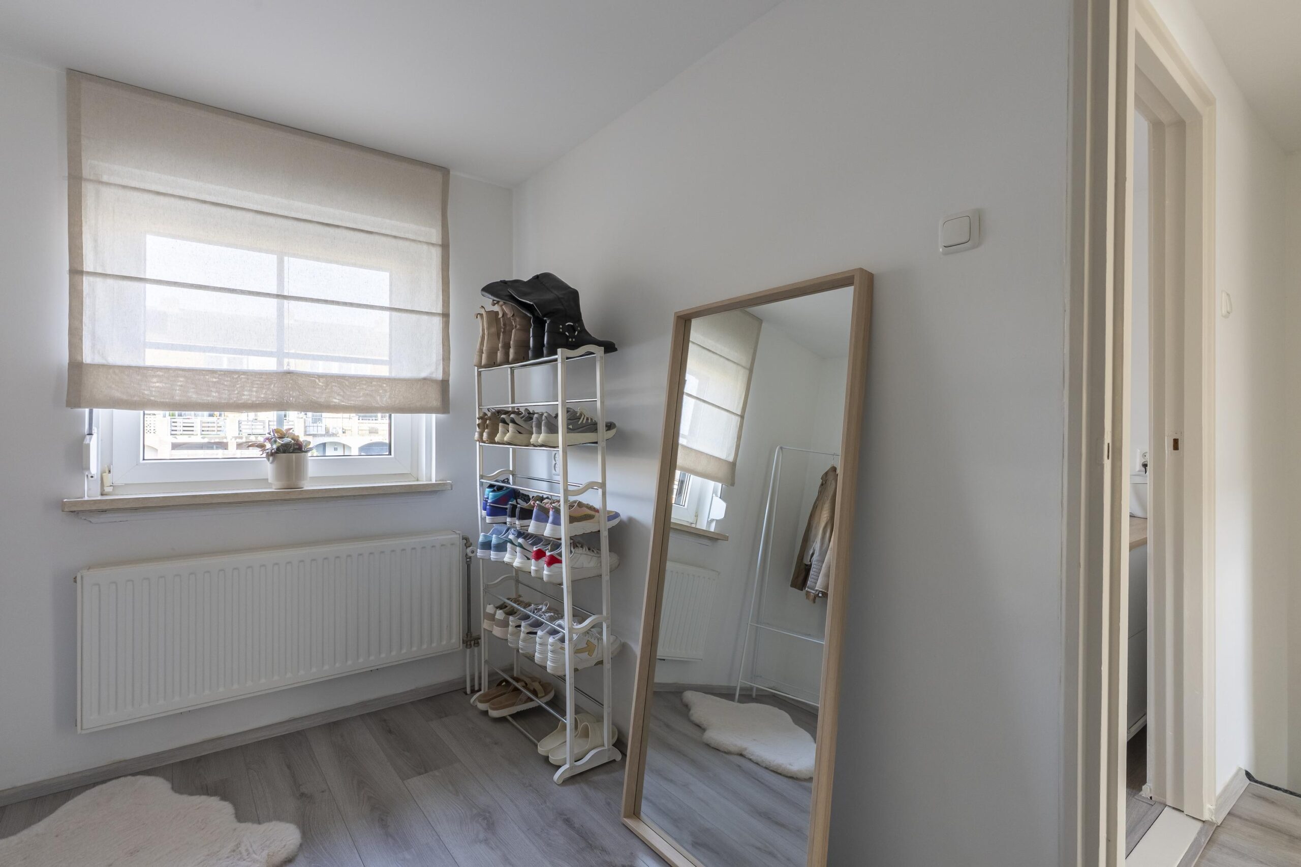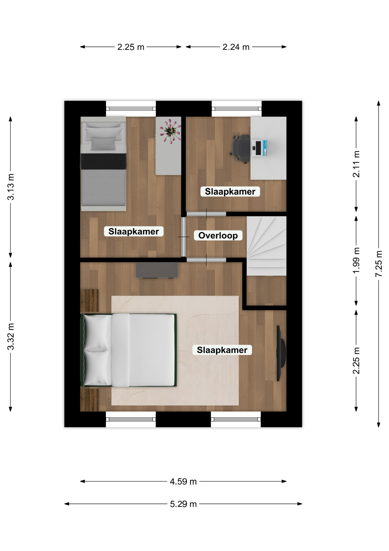 Overloop met toegang tot drie moderne en goed afgewerkte slaapkamers. De vloeren zijn voorzien van een lichte laminaatvloer en de wanden zijn strak gestuct. De slaapkamers zijn respectievelijk groot: