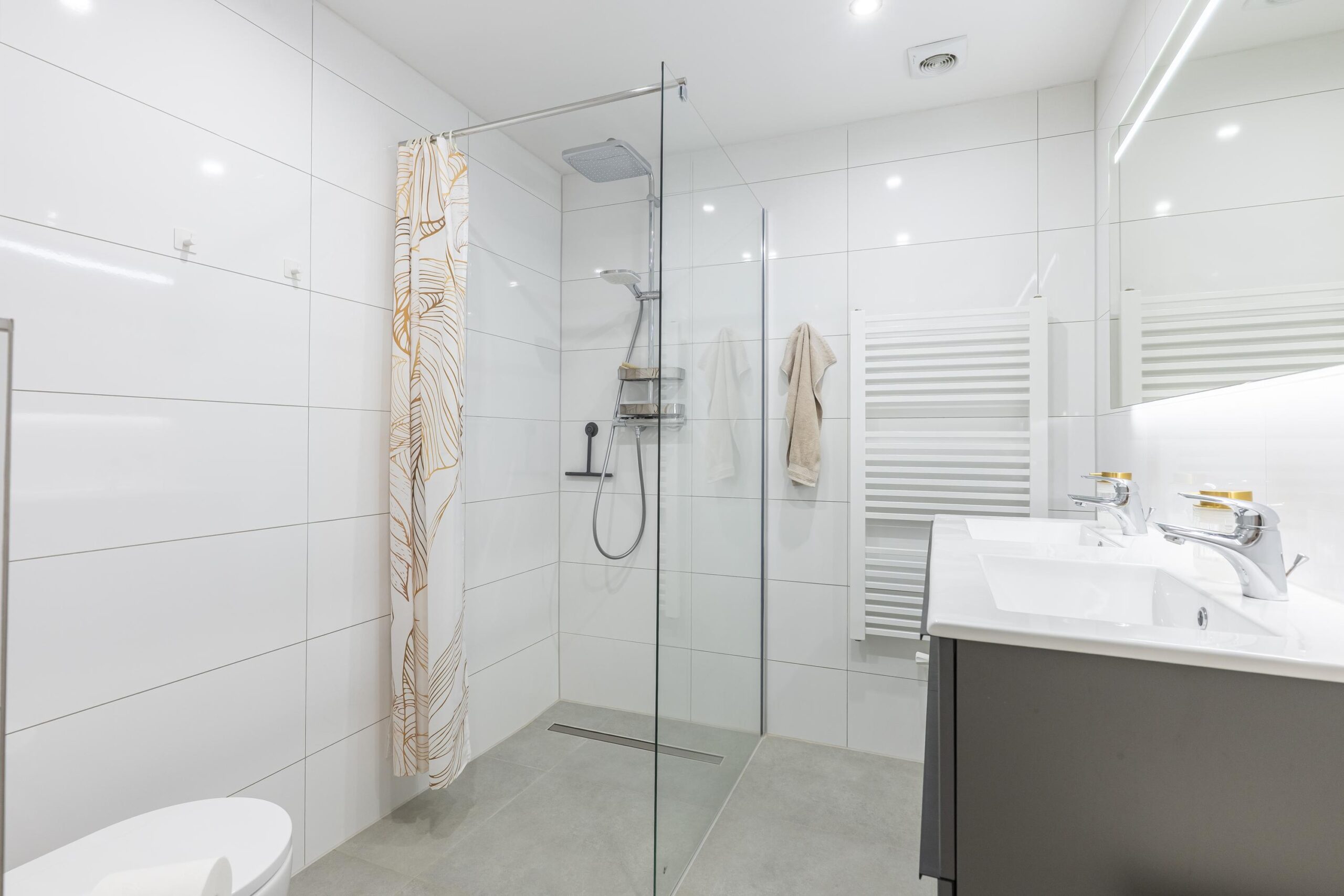 - Badkamervoorzieningen Douche, dubbele wastafel, wastafelmeubel, inloopdouche