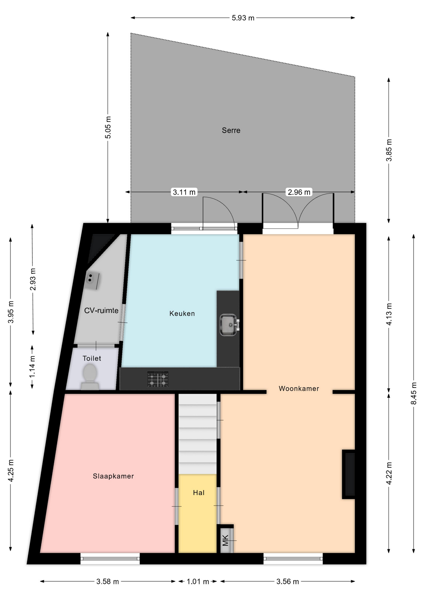 Via de entree komt u in de hal, van waaruit toegang is tot de woonkamer en een slaapkamer/hobbyruimte van (ca. 15 m²). De ruime woonkamer (ca. 28 m²) is licht dankzij de grote raampartijen en beschikt over openslaande deuren naar de serre. Vanuit de woonkamer is tevens de kelder bereikbaar. De ruime, dichte keuken (ca. 12m²) heeft eveneens een deur naar de serre en is voorzien van een gasfornuis, spoelbak en afzuigkap. Vanuit de keuken is er toegang tot het toilet en de cv-ruimte.