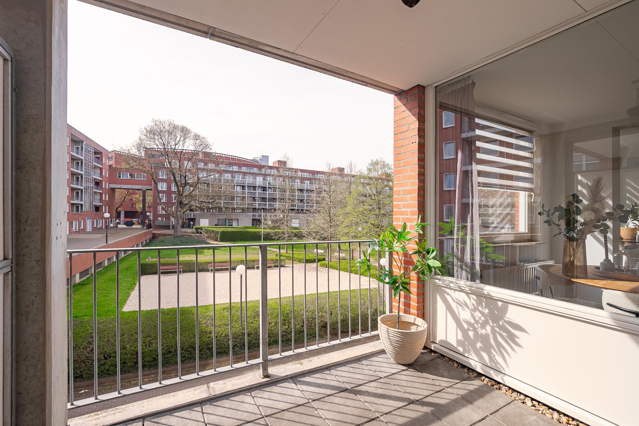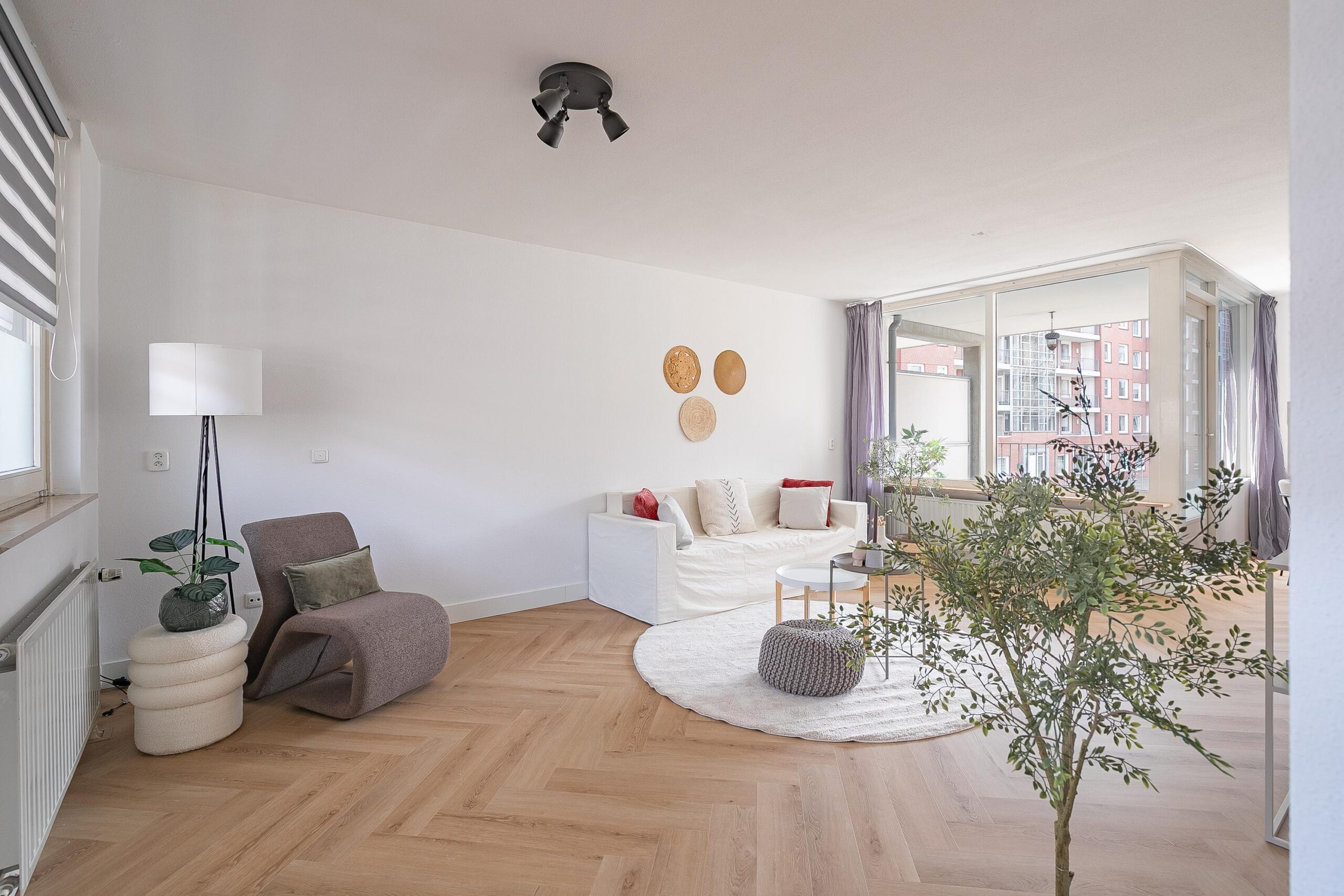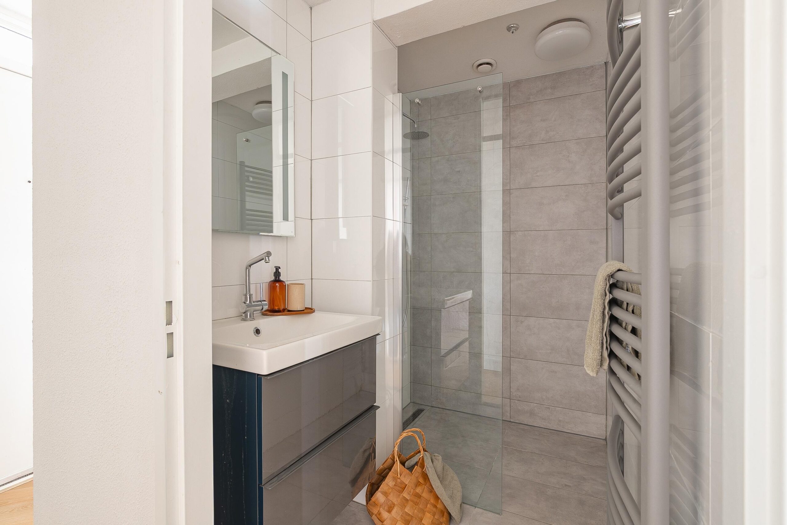Hal met toegang tot de ruime en lichte woonkamer (ca. 22 m²) met halfopen keuken (ca. 15 m²). De keuken is compleet uitgevoerd en voorzien van diverse inbouwapparatuur, waaronder een koel-/vriescombinatie, inductiekookplaat met oven, afzuigkap en vaatwasser. Vanuit de keuken stapt u zo het balkon op (ca. 6 m²), waar u geniet van een vrij en groen uitzicht op de volledig omsloten binnentuin met parkachtige uitstraling. Een heerlijke plek voor een kop koffie in de ochtend of een drankje na het werk. Het appartement beschikt verder over twee goed bemeten slaapkamers (ca. 12 m² en 10 m²). De badkamer is netjes en voorzien van een inloopdouche en een modern badkamermeubel met spiegel. Daarnaast is er een separaat toilet met fonteintje en een praktische bergruimte met aansluiting voor de wasmachine.