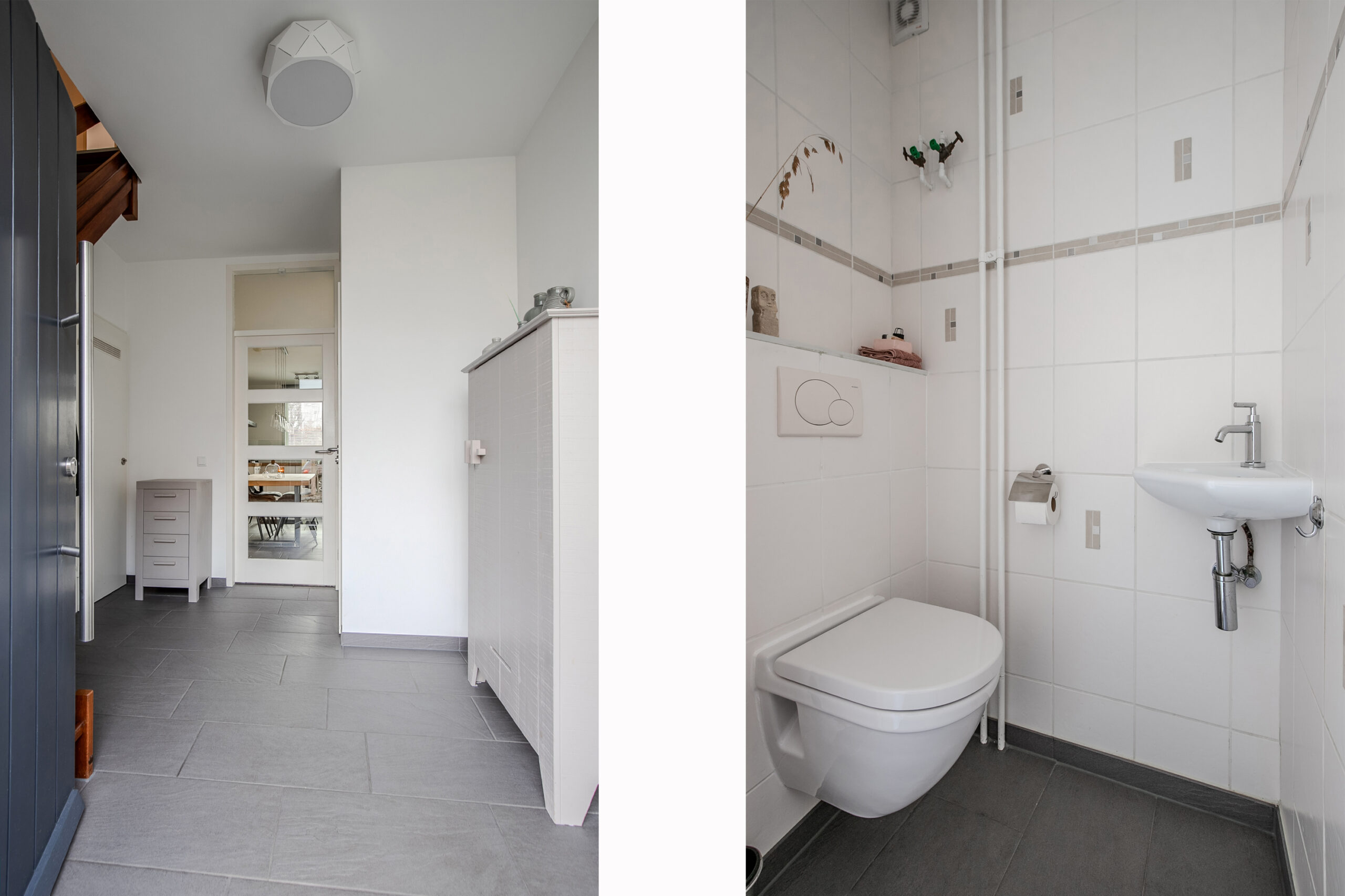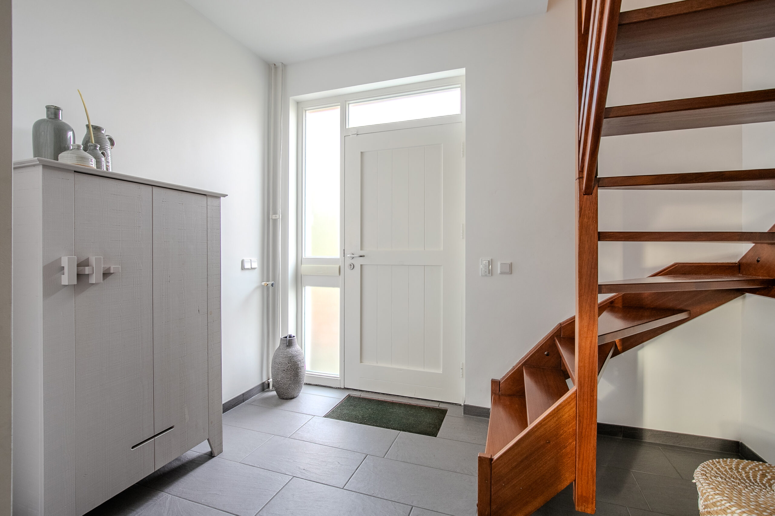Via de fraai aangelegde, onderhoudsarme voortuin en de dubbele oprit bereikt u de entree/hal. De ruime hal is voorzien van een open hardhouten trap naar de verdieping, garderobe en een geheel betegeld toilet met hoekfontein.