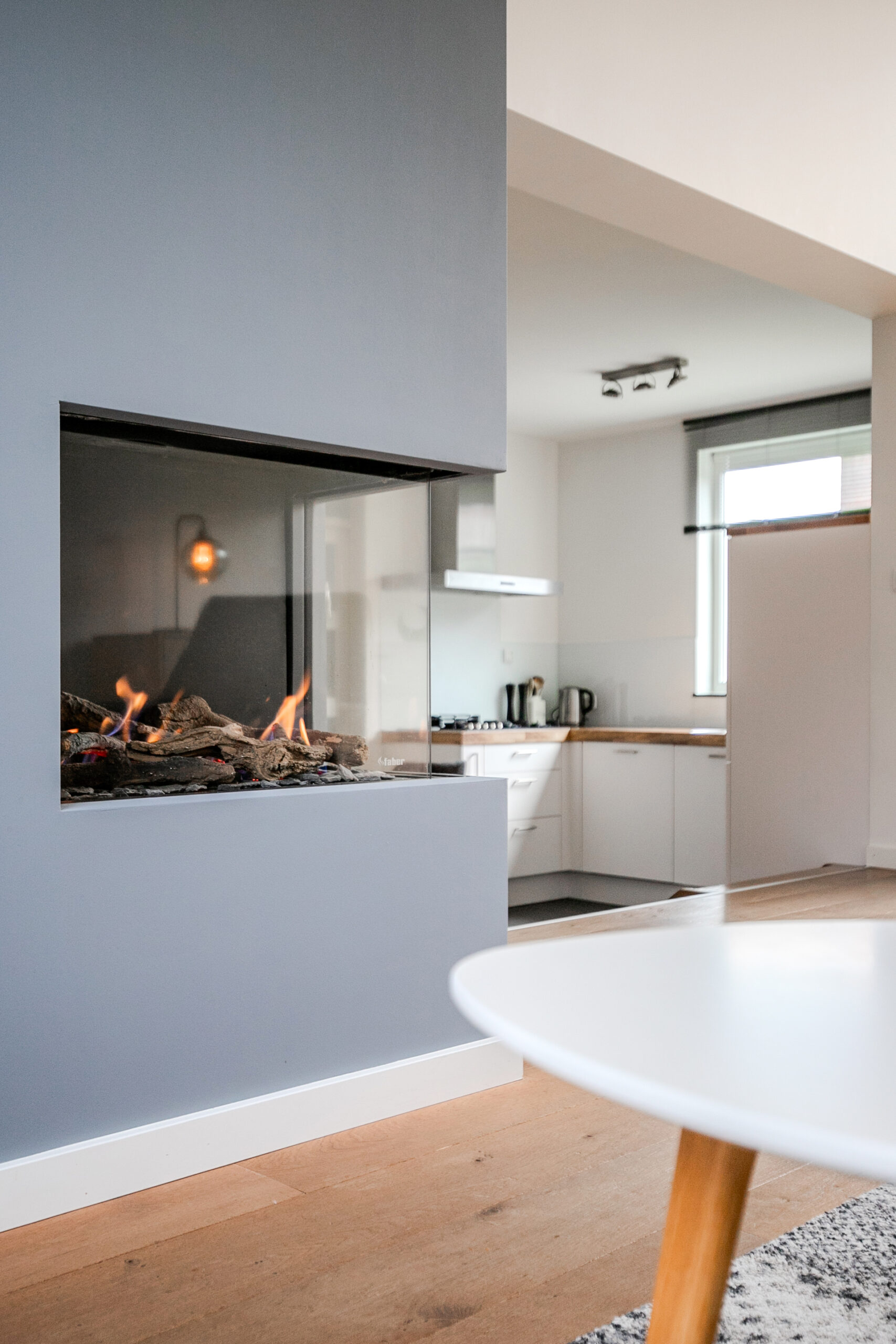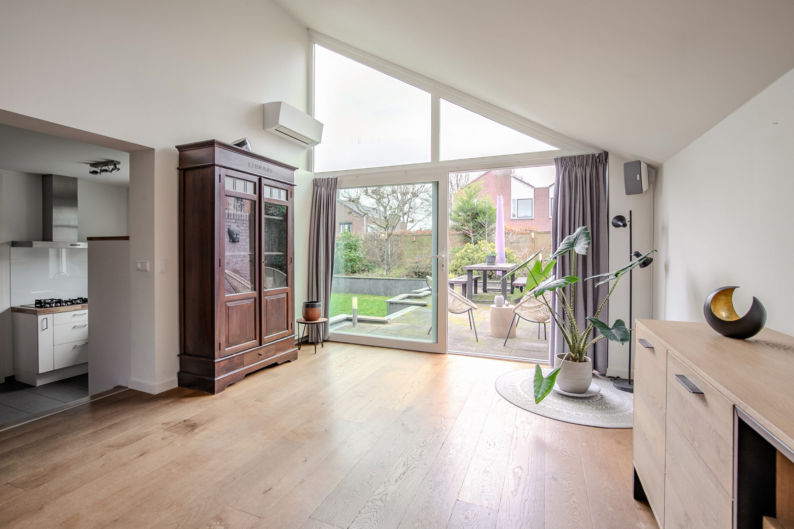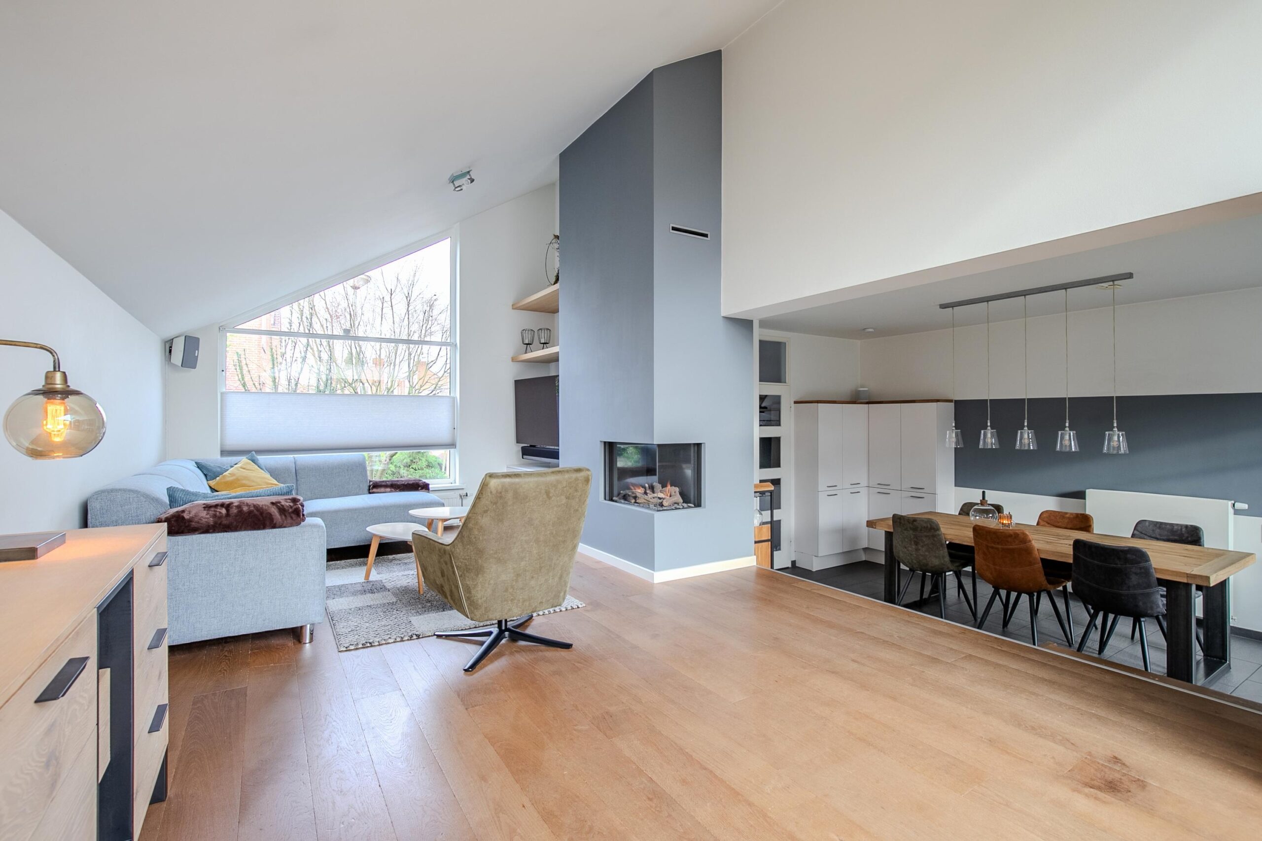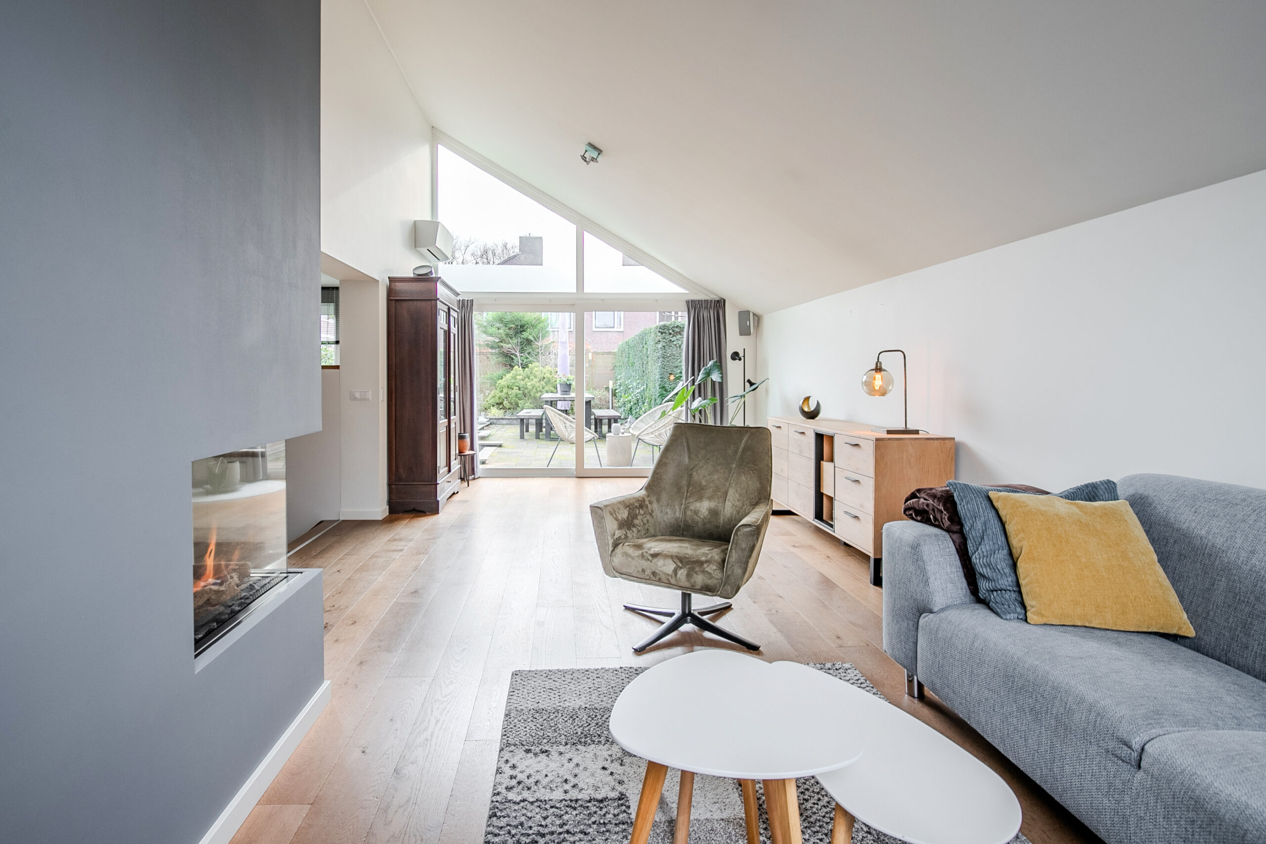 De living biedt uitstekende lichtinval en is afgewerkt met een massief houten vloer, airconditioning, royale schuifpui, strakke gashaard en strak stucwerk.